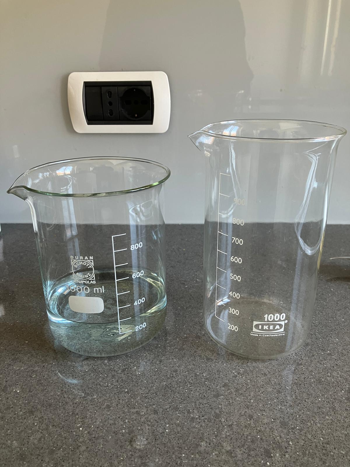 1) preparare il beaker (un comune barattolo in vetro sufficientemente capiente va bene ugualmente) con 200ml di acqua depurata (i beaker da laboratorio sono graduati, ma se si usa un barattolo in vetro qualunque, basta fare la tara sulla bilancia e riempirlo fino al peso di 200g - con buona approssimazione 1 ml di acqua pesa 1g, perché la densità dell'acqua in condizioni ordinarie è 1g/ml)