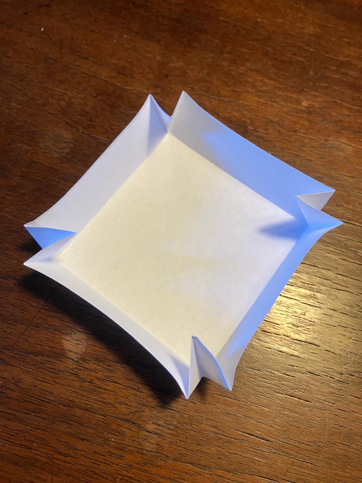 (un po' di origami da laboratorio: tagliate un quadrato di carta di circa 10 cm per lato, piegate gli spigoli uno contro l'altro, riaprite il foglio. Piegate i lati verso l'interno 1 cm circa, riaprite il foglio. Ora piegate gli angoli verso l'interno seguendo le pieghe (la foto spiegano meglio). Usatelo per pesare la polvere, non sporcherete la bilancia e i bordi creati evitano di perdere la polvere nel tragitto tra bilancia e beaker!)