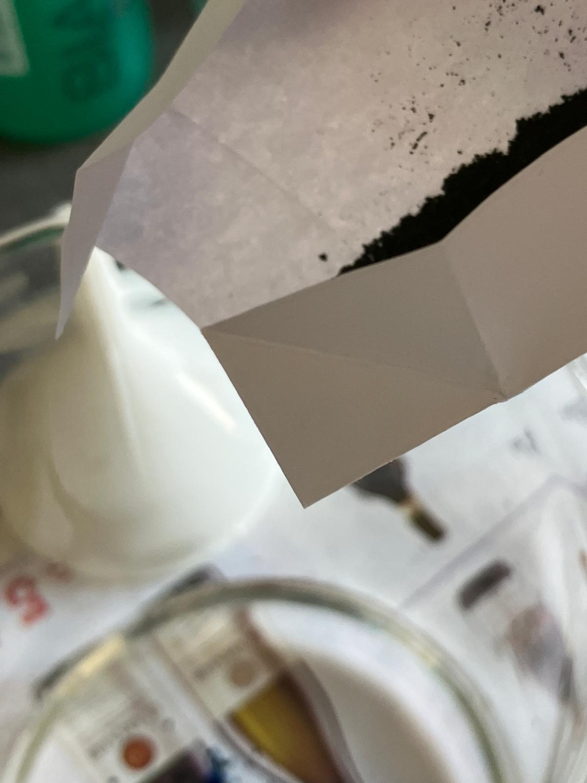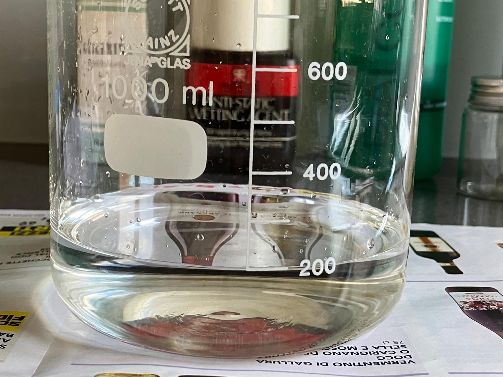 (Nota, nel caso ci si accorga che restano delle particelle in sospensione, sarà necessario filtrare la soluzione - non è stato il mio caso - non aggiungete la glicerina se non dopo la filtratura, o intaserà il filtro.)