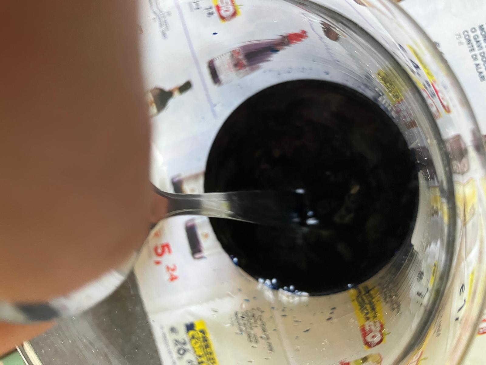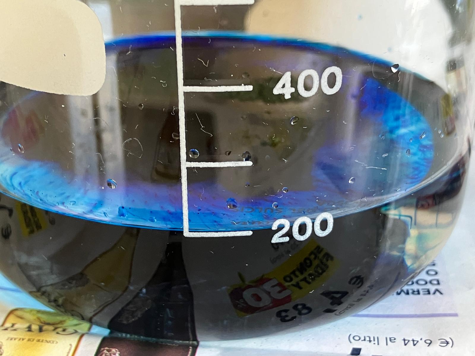Ovviamente, dato che non partivo più dai 200 ml iniziali, ma meno della metà, in cui c’era già circa mezzo g di blu di metilene (1 g in 200ml diviso a metà in 100 ml) ho subito raggiunto e probabilmente ecceduto l’1% di concentrazione.