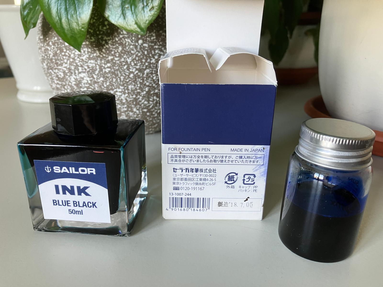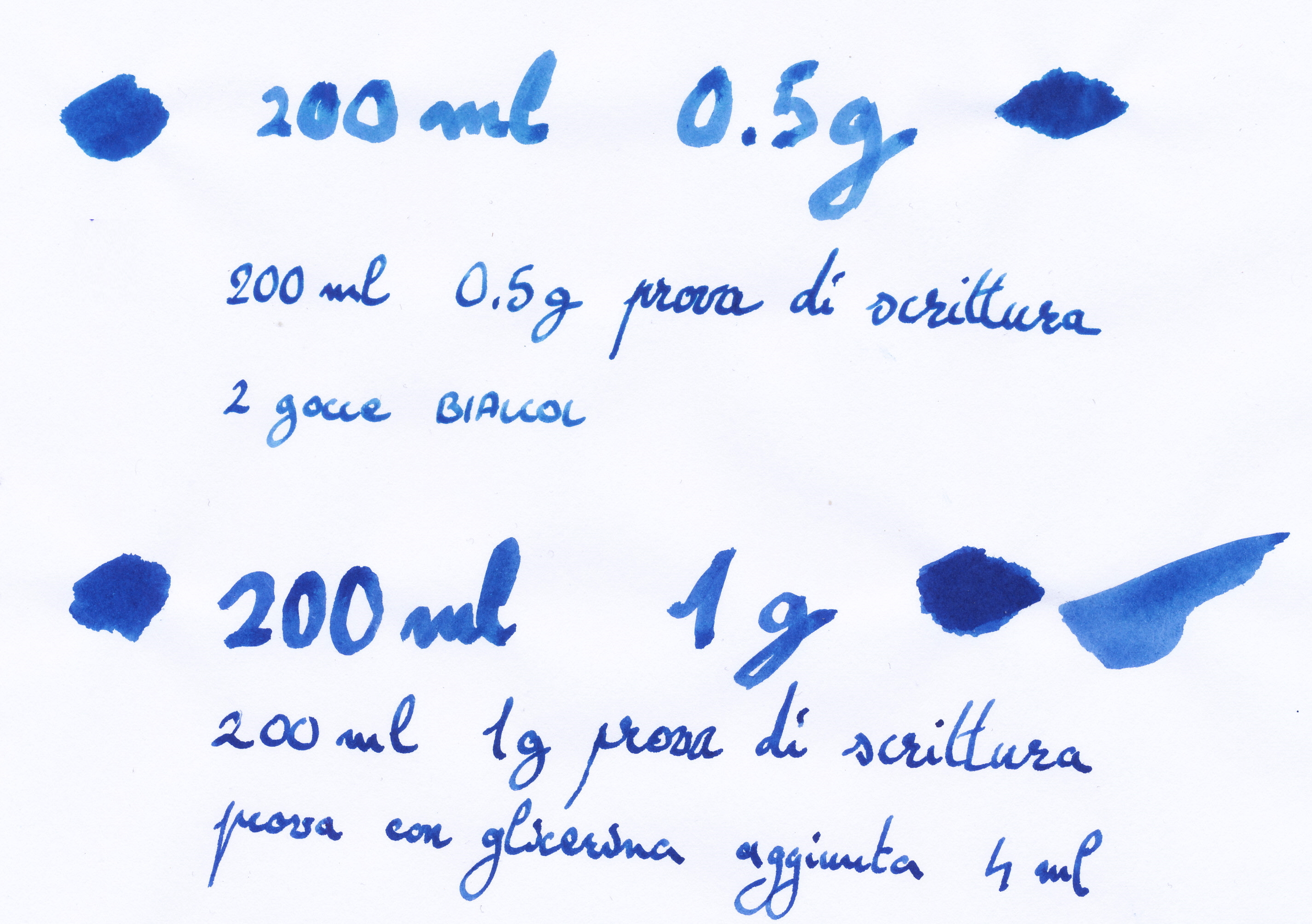 Il blu è diventato molto più scuro. Ho riempito un calamaio Sailor da 50 ml, e mi sono rimasti altri 20-30 ml. Sul fondo ho notato però del colorante non disciolto, evidentemente ho raggiunto la saturazione. Ho travasato quest’ultimo quantitativo in un ultima boccetta, ho aggiunto un pochino di acqua distillata per sciogliere il residuo (che si è sciolto completamente) e l’ho travasato nell’ultima boccetta. Come si può capire (avendo voluto fare più prove) sì è persa un po’ della precisione della mia formula teorica, ma ora si tratta di provare il risultato e vedere se c’è qualcosa da aggiustare (la prossima volta posso essere più preciso seguendo una unica formula per tutto il preparato)
