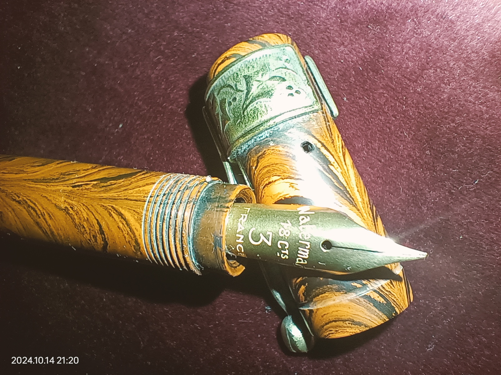 La meccanica è stata revisionata e un o-ring nuovo di zecca si fa sentire ogni volta che si estrae il pennino. Quest' ultimo è un Waterman nº3 in oro a 18 k, tipico del mercato francese.