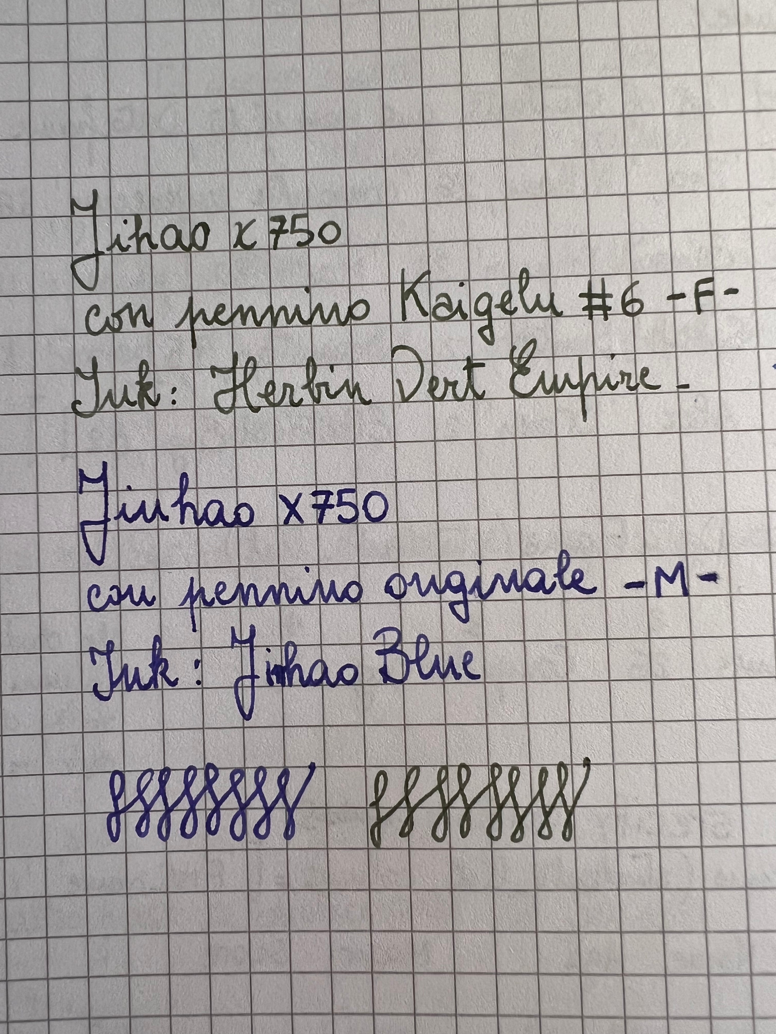 Riporto, a beneficio di chi fosse curioso, un piccolo esperimento fatto con una Jinhao X750. Nulla di particolare, semplicemente ho trovato su ali dei pennini Kaigelu 316, disponibili in EF, F e M, che a quanto pare ben si adattano alla X750. Quest'ultima è prodotta solo con un pennino Jinhao di gradazione M.