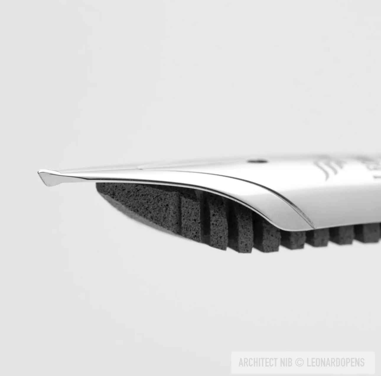 Si vede che l’architect è piatto con spigoli abbastanza vivi e deve essere usato sempre con lo stesso angolo, altrimenti scrive sullo spigolo con un tratto praticamente EF. È un problema se l’angolo del pennino non è quello che usi tu.