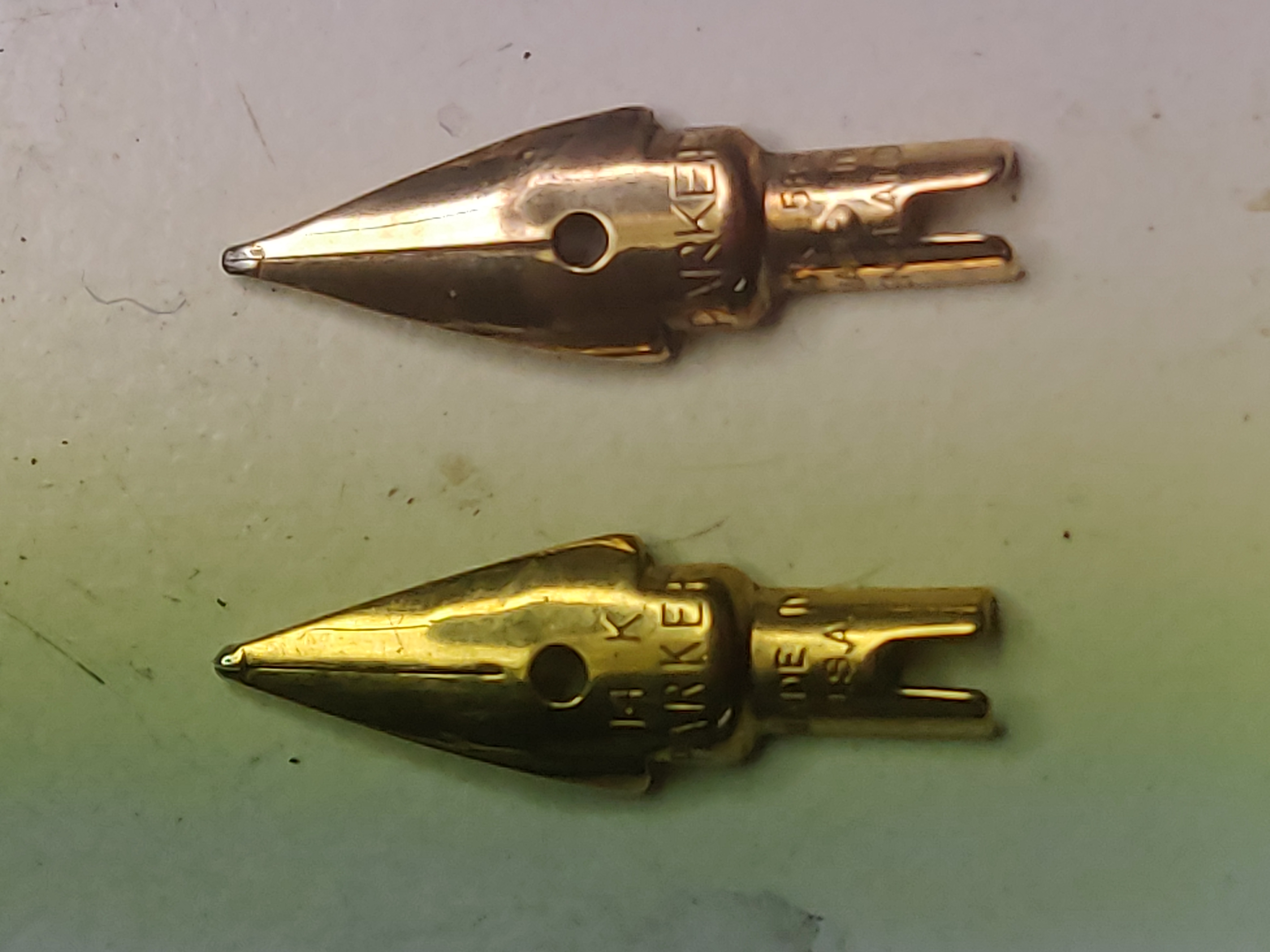 Sono pennini della 45,probabilmente essendo di due paesi diversi, le leghe sono diverse dando un colore diverso al pennino, anche l'iridio è diverso, oltre allo spacco tra i rebbi che come giustamente è stato già detto è diverso, credo per errore, non ho mai visto un pennino così, alcuni possono non avere il foro di sfiato, ma in tutti quelli col foro lo spacco parte sempre da li ed arriva alla punta