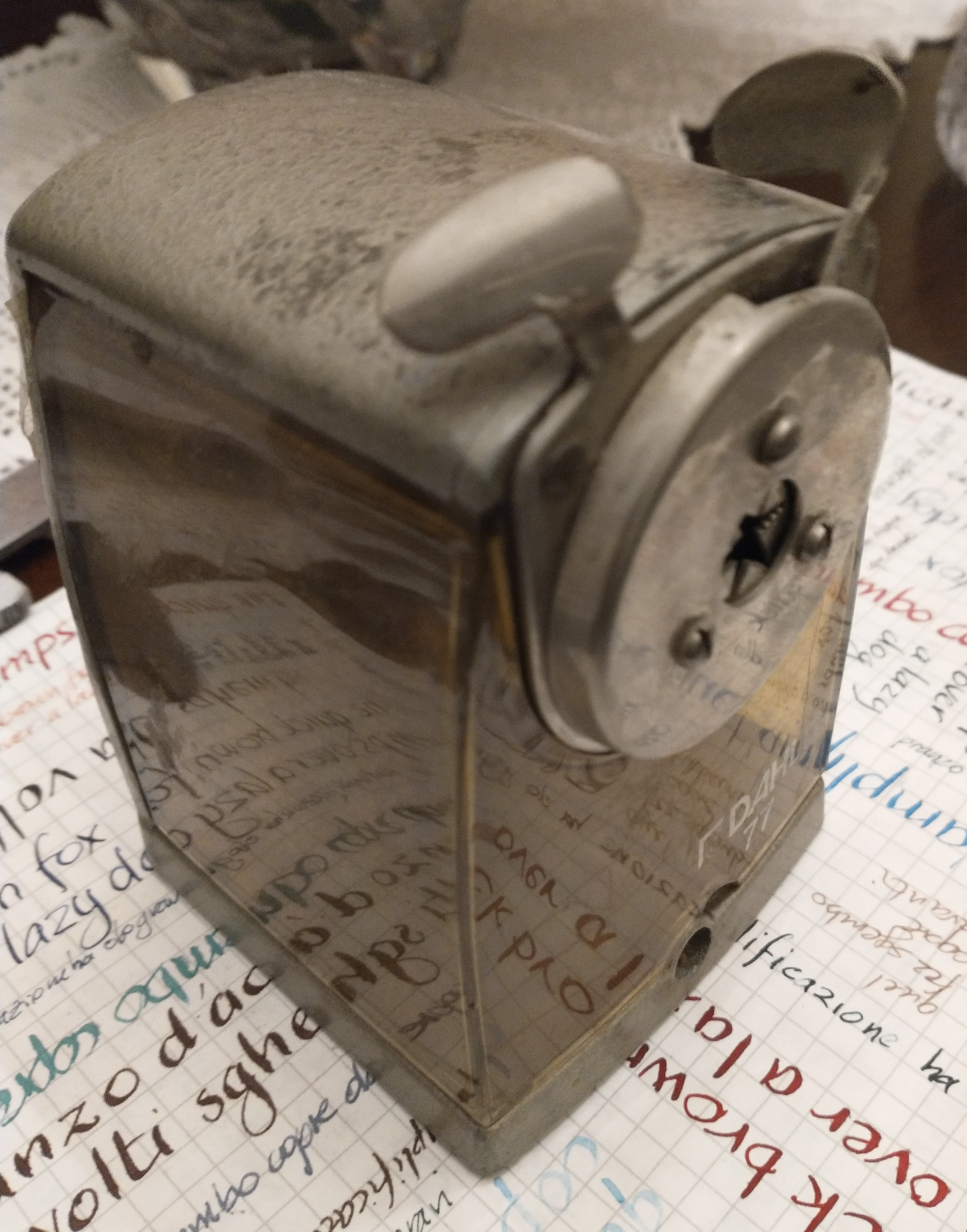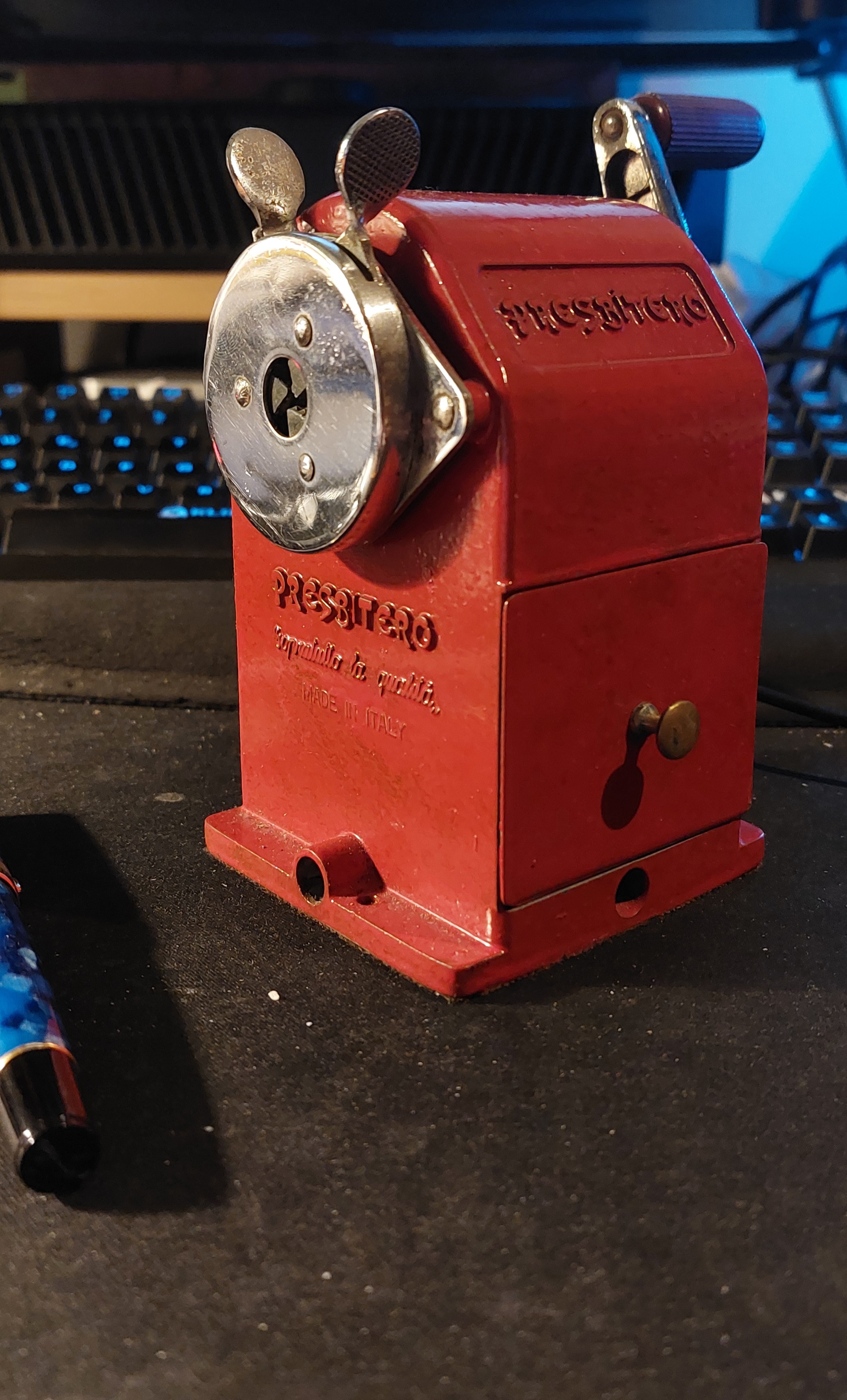 Io ne ho uno della Dahle identico nel dettaglio a questo in foto (presa da internet), ma rosso; vecchissimo, ricordo lo usava mio padre quando ero piccolo, per cui almeno degli anni '70. In plastica come questo, ma rosso. Credo sia una vita che li fanno identici, d'altronde è un temperamatite manuale, che diavolo possono inventarsi ? Se per quello aveva anche un tubicino in legno per usare comodamente i moncherini di matita fino all'ultimo cm...altri tempi...