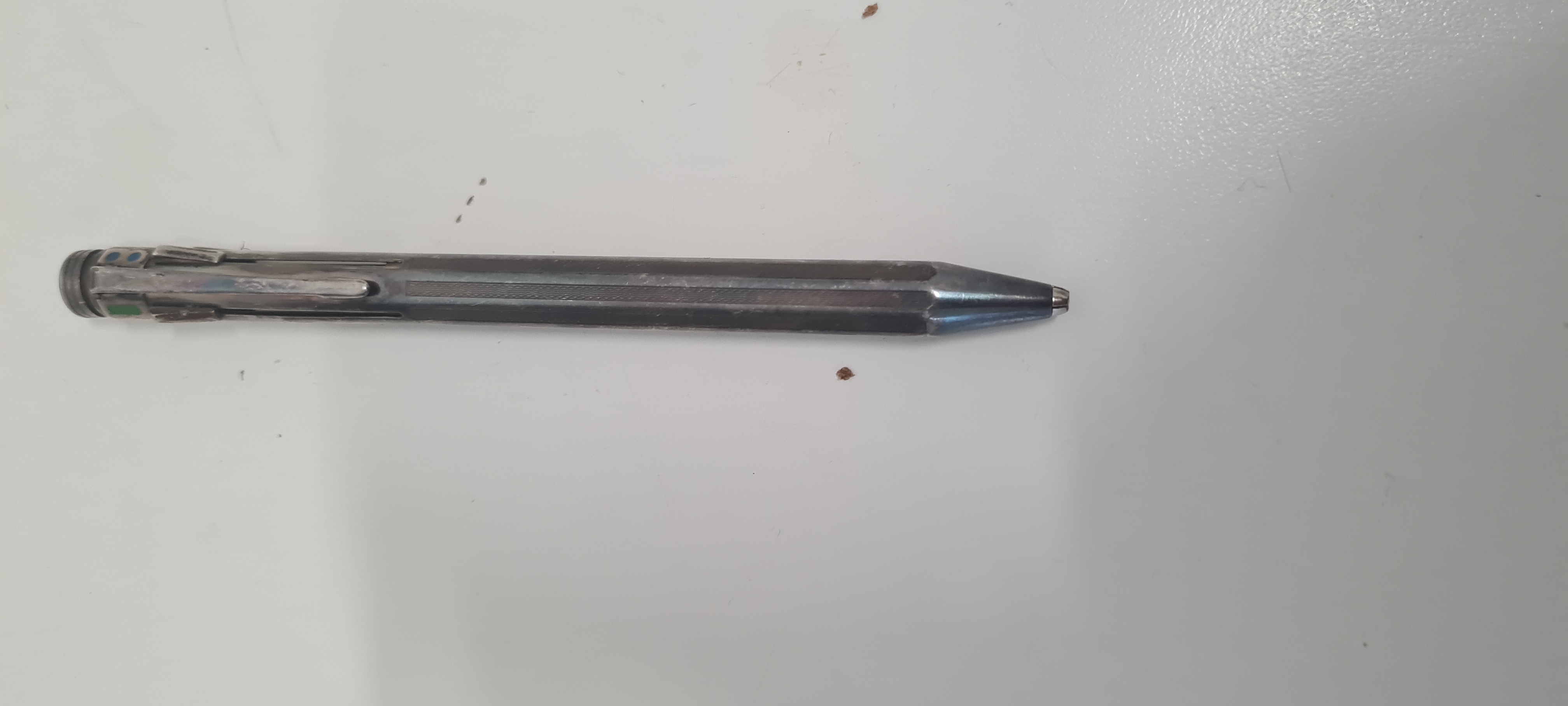 Nelle foto allegate una caran d'ache 4 colri Blu rosso verde è micromatita con numero di modello 45.