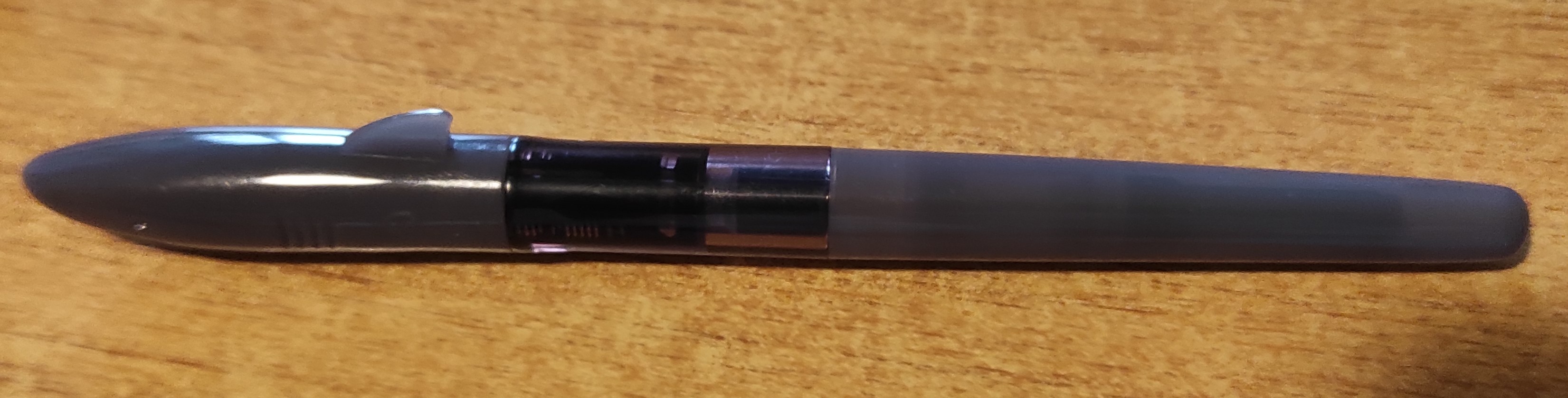 Pennino F in acciaio rigido ed abbastanza generoso come flusso di inchiostro, corpo in plastica e lunga quanto una bic, cappuccio a vite senza clip ma con la pinna... addirittura viene fornita di base con il converter plasticosissimo ma funzionale.