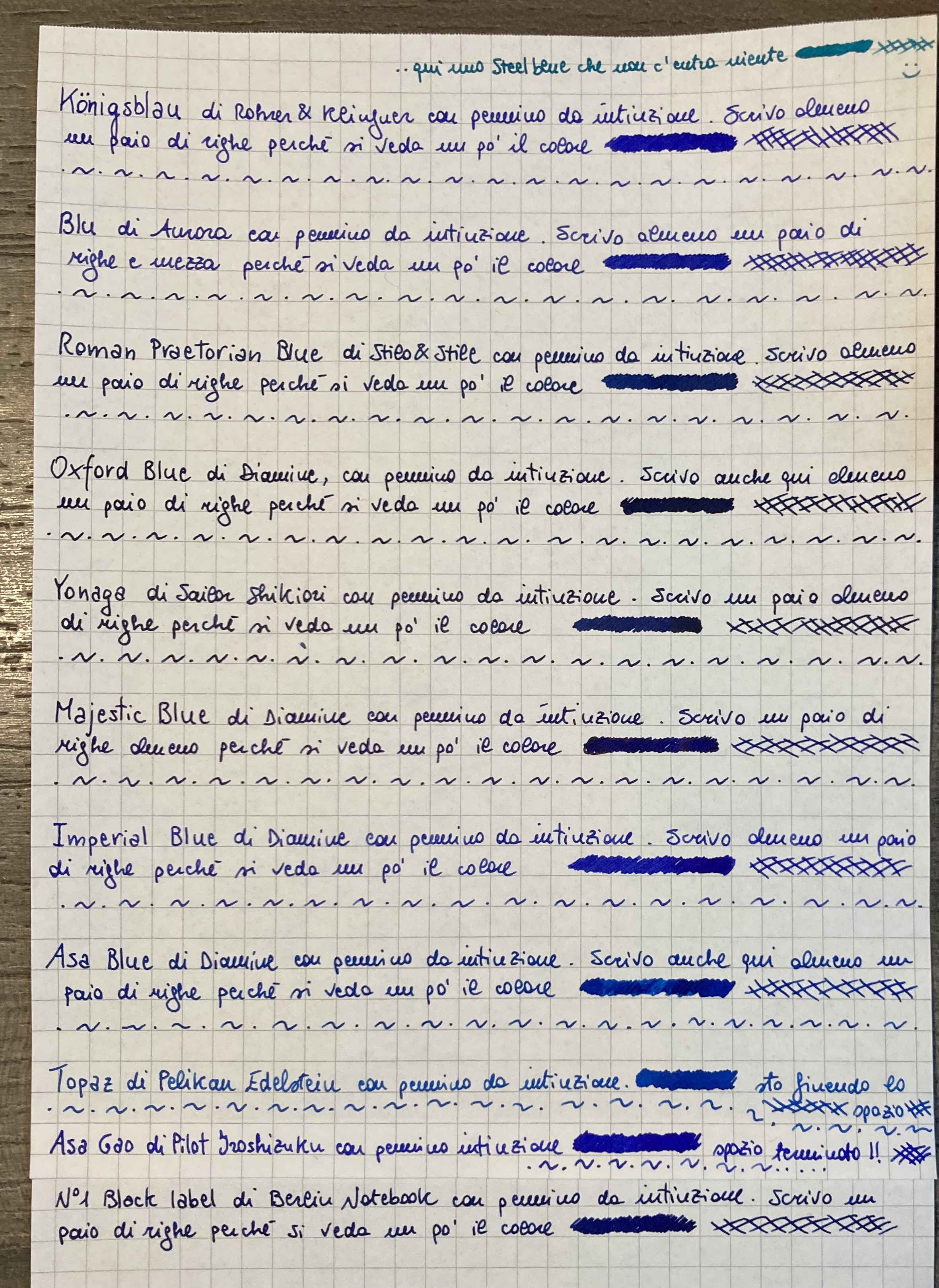 È proprio vero che affidarsi alla memoria circa la resa di un inchiostro non sempre è la miglior cosa: nel fare questo breve paragone fra i blu-blu del cassetto mi sono stupita nel vedere come alcuni colori li ricordavo più scuri o più chiari del vero, inoltre alcuni sono più simili tra loro di quanto avrei detto. Lasciamo parlare la carta Rhodia bianca e il pennino da intinzione, ora. Ho dovuto attaccare due fogli perché mancava una boccetta: mi fossi accorta prima, avrei completato Topaz e Asa Gao con la seconda riga. Se volete, faccio uno scritto più lungo con qualcuno di questi che vi interessi particolarmente
