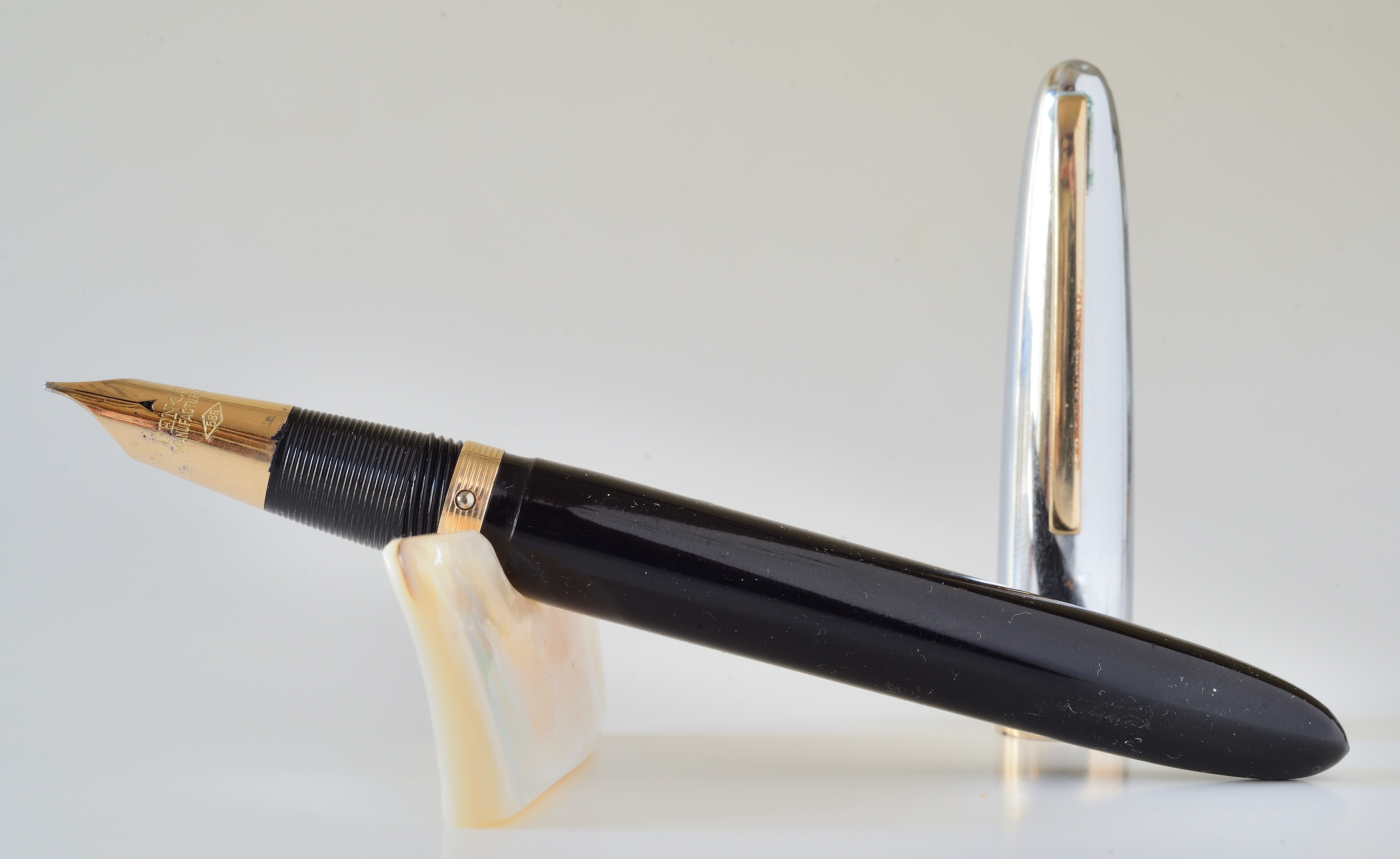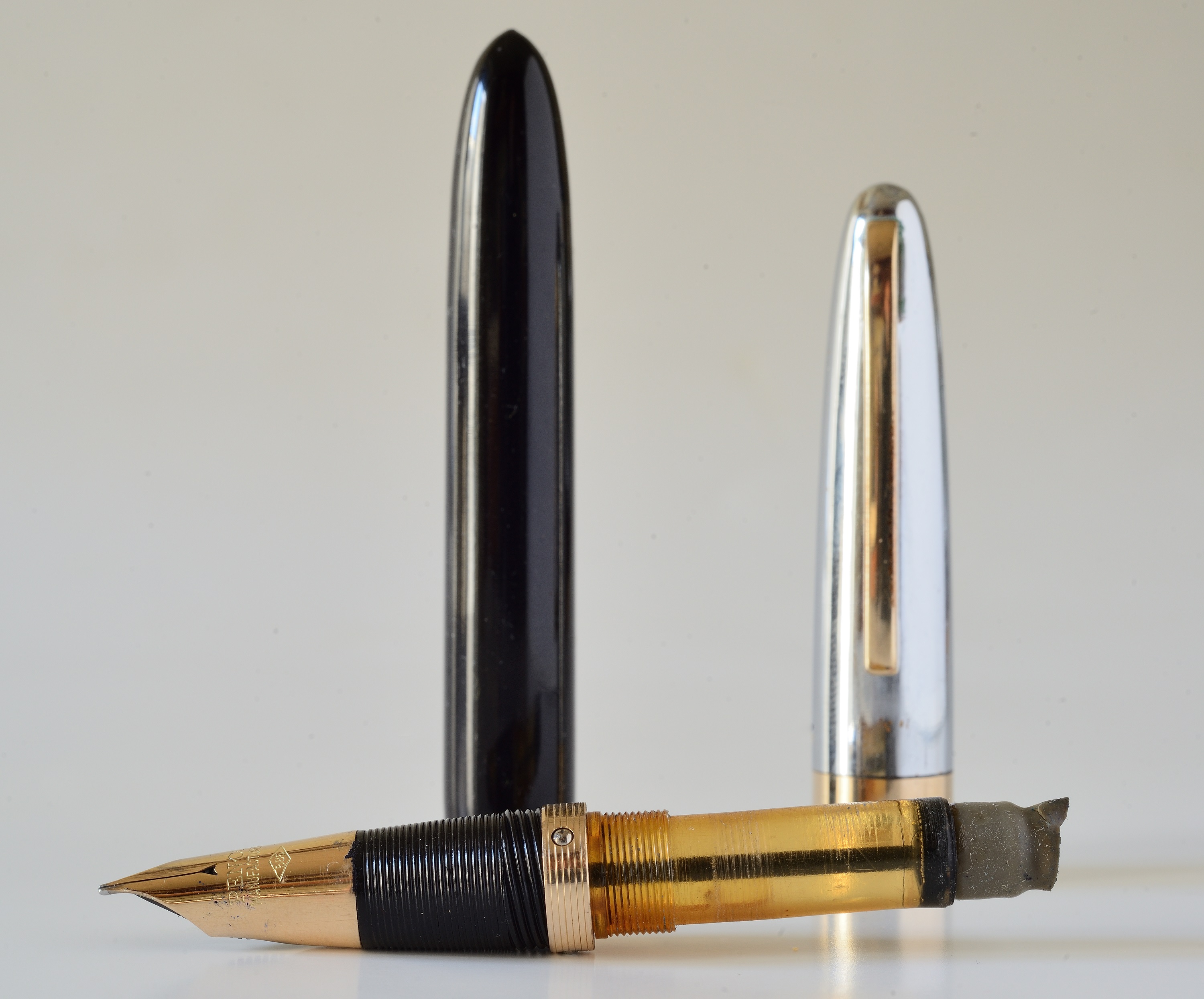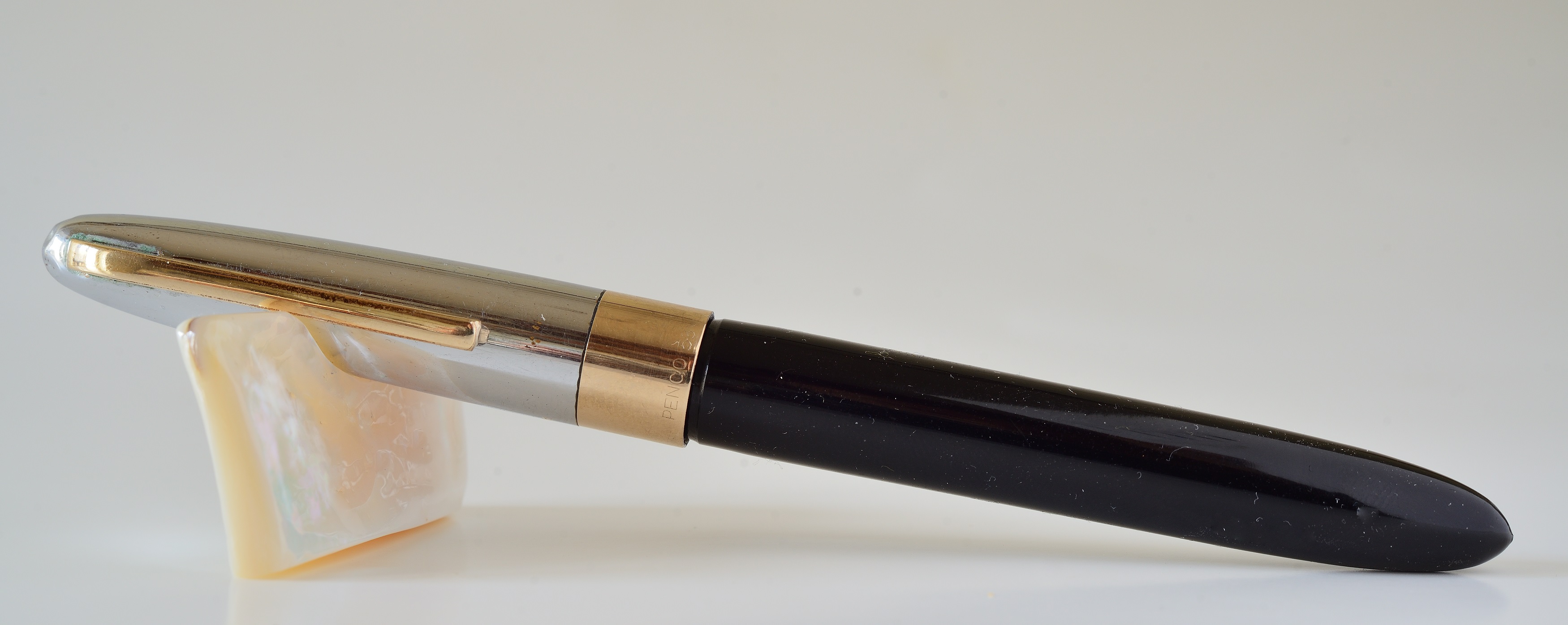 La seconda è una PEN-CO 53, cappuccio cromato e pennino tubolare in oro 585, presenta uno strano caricamento a pompetta, il fusto è intero, nessuna apertura ad eccezione di un piccolo forellino di sfiato in prossimità dell'avvitamento alla sezione. Per caricare bisogna svitare il fusto e pompare a mano. Dovrò sostituire il gommino di pompaggio.