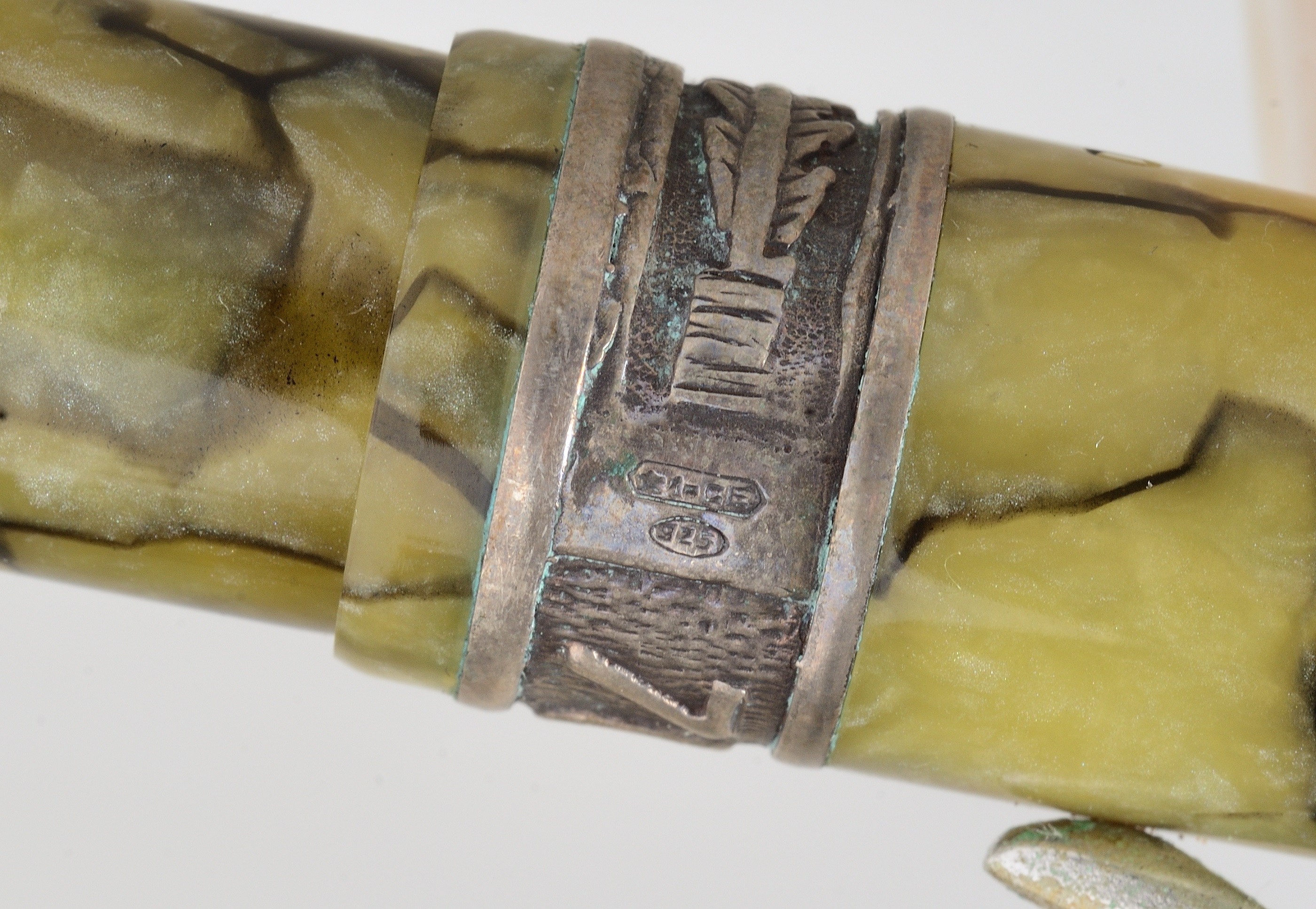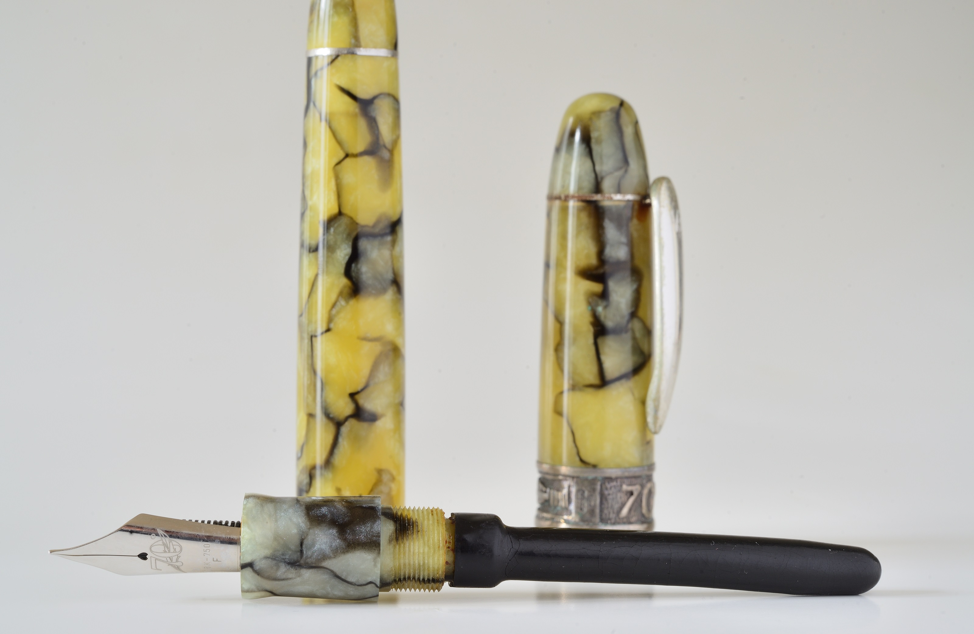 Pennino F in oro 18 K, non so se oro bianco o rodiato, corpo e cappuccio in celluloide marmorizzata verde-nero, fascetta in argento 925 con a rilievo 70 ed una piuma d'oca. il bollo dell'argento riporta 1-GE ma non sono riuscito a risalire all'argentiere, così come ignoro chi l'abbia prodotta, qualcuno