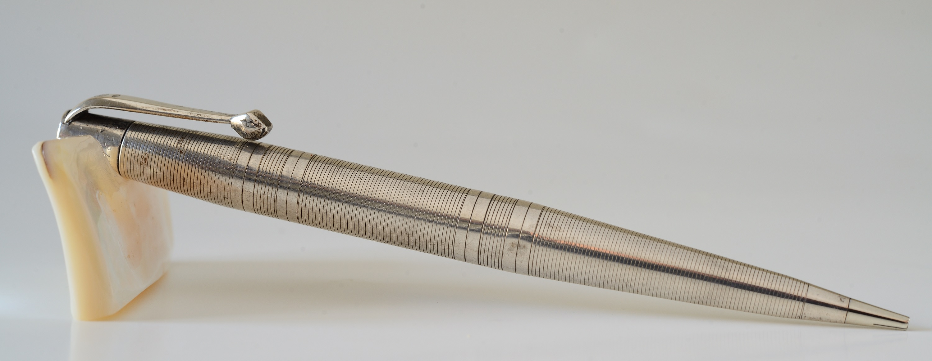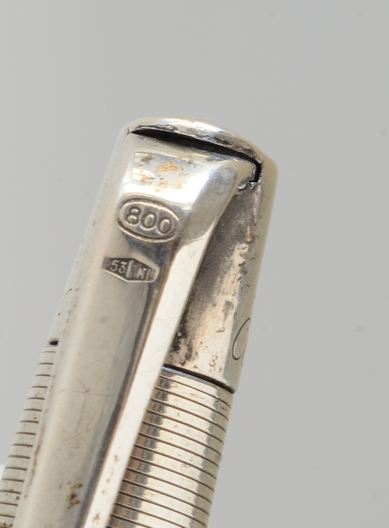 Ultima ma non ultima, lo so che è un forum di stilografiche, perdonatemi, ma non potevo non pubblicarla, potrebbe essere utile per confronti con laminature Kosca in argento, è una matita meccanica Alfa Romeo, interamente in argento 800, con punzonatura 53-MI riferibile a KOHLER & SCHAEFER che diventano poi KOSCA. Ignoro l'anno di produzione ma tra il 53 e MI mi sembra di intravedere un fascio littorio, il che limiterebbe gli anni a quelli del ventennio.