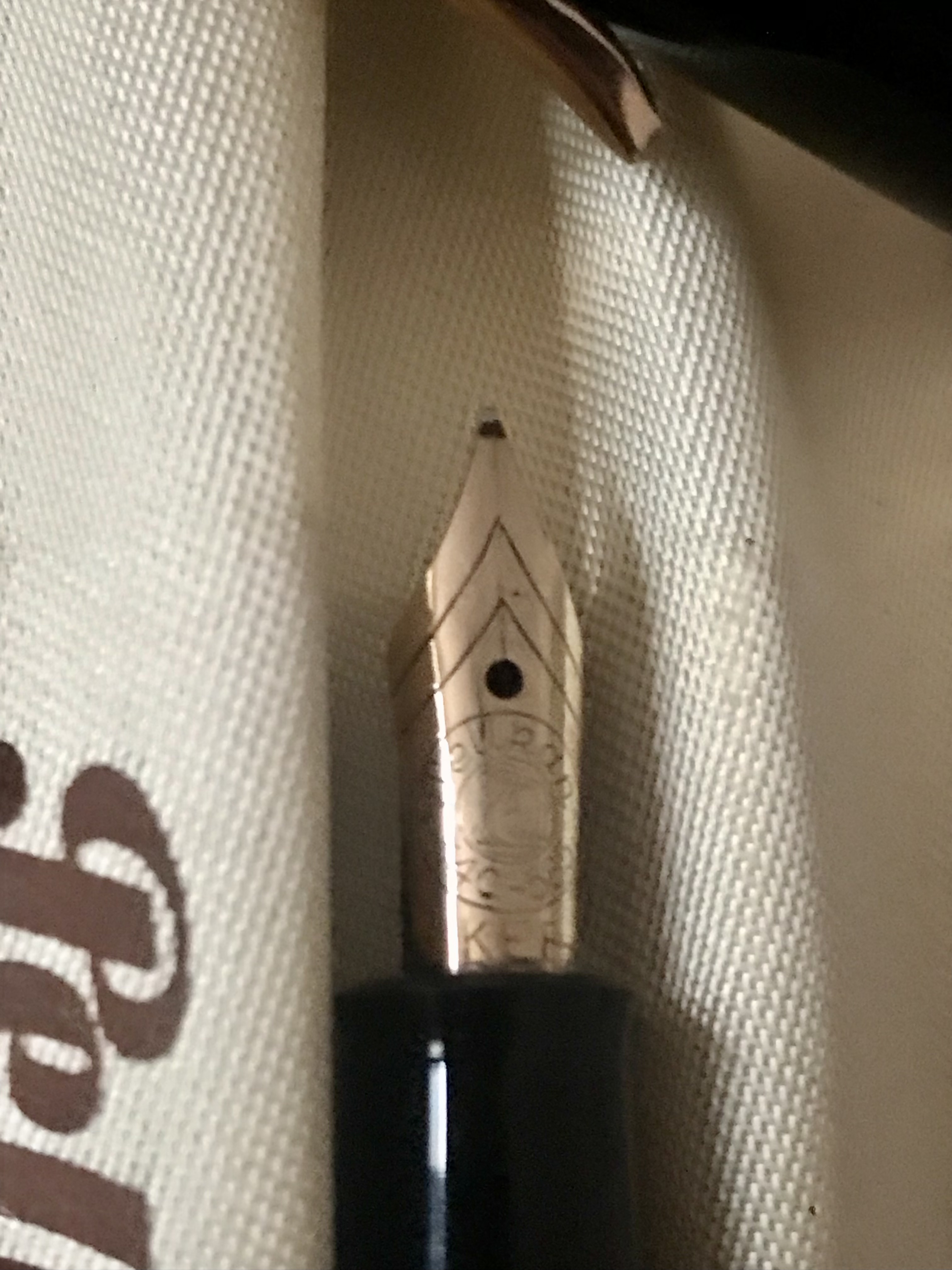 Kugel, la punta dell'iridio è arrotondata (le Pelikan di quel periodo avevano la punta tagliata tronca, la versione arrotondata aiuta a non far impuntare il pennino in qualunque posizione la si impugni, per contro perde un po' di "carattere". I pennini delle Pelikan moderne sono tutti Kugel