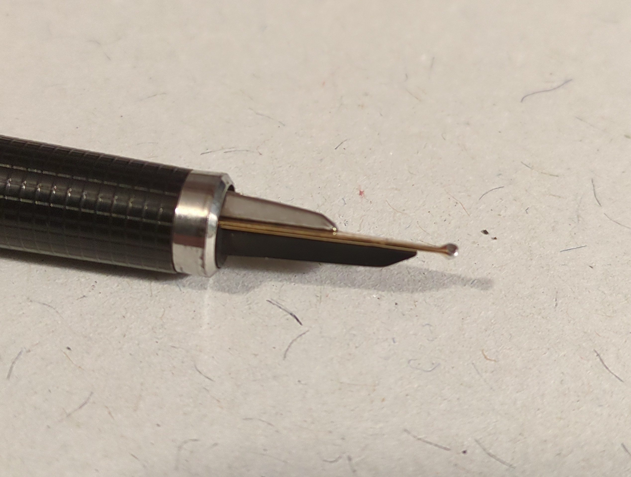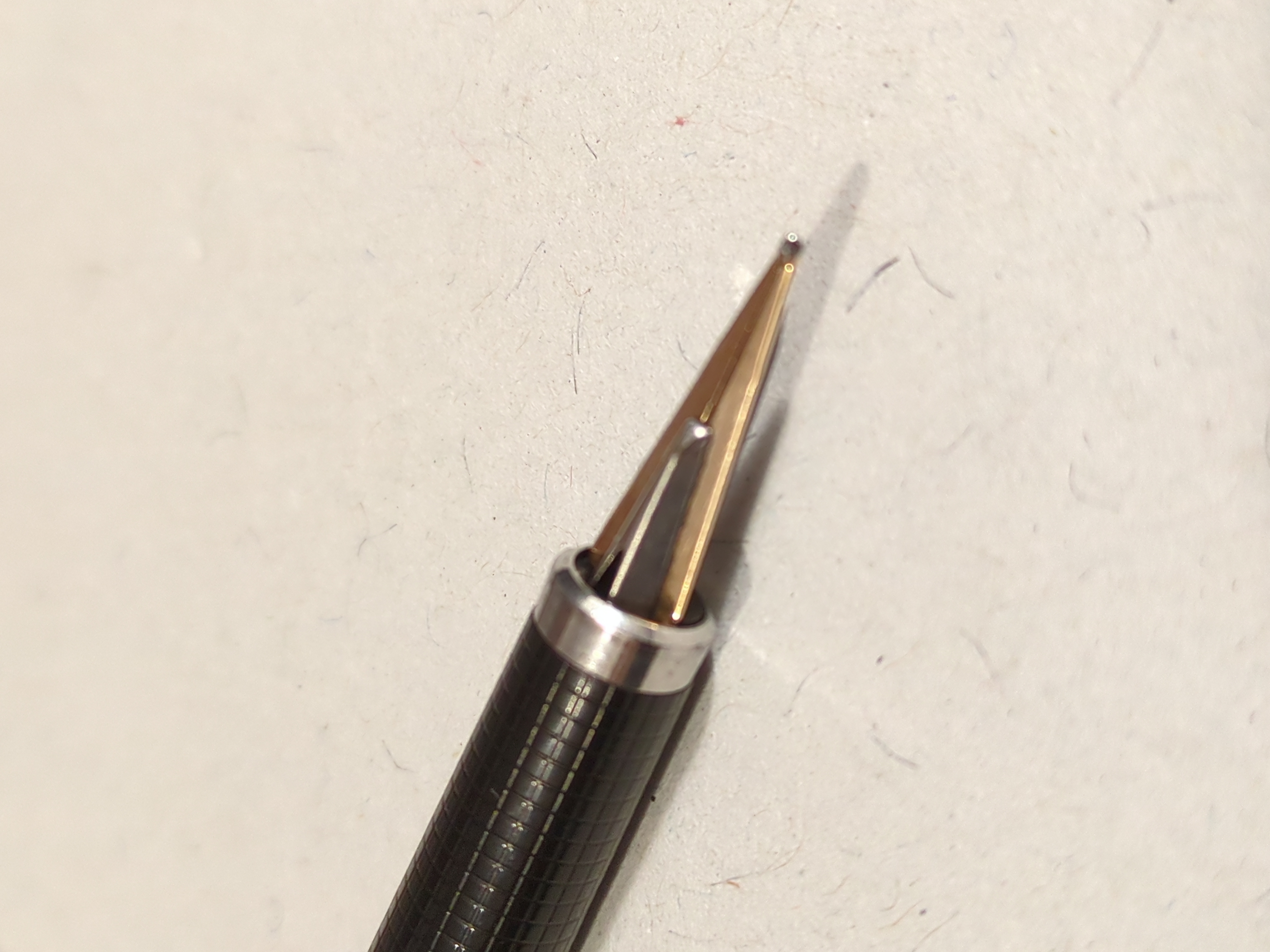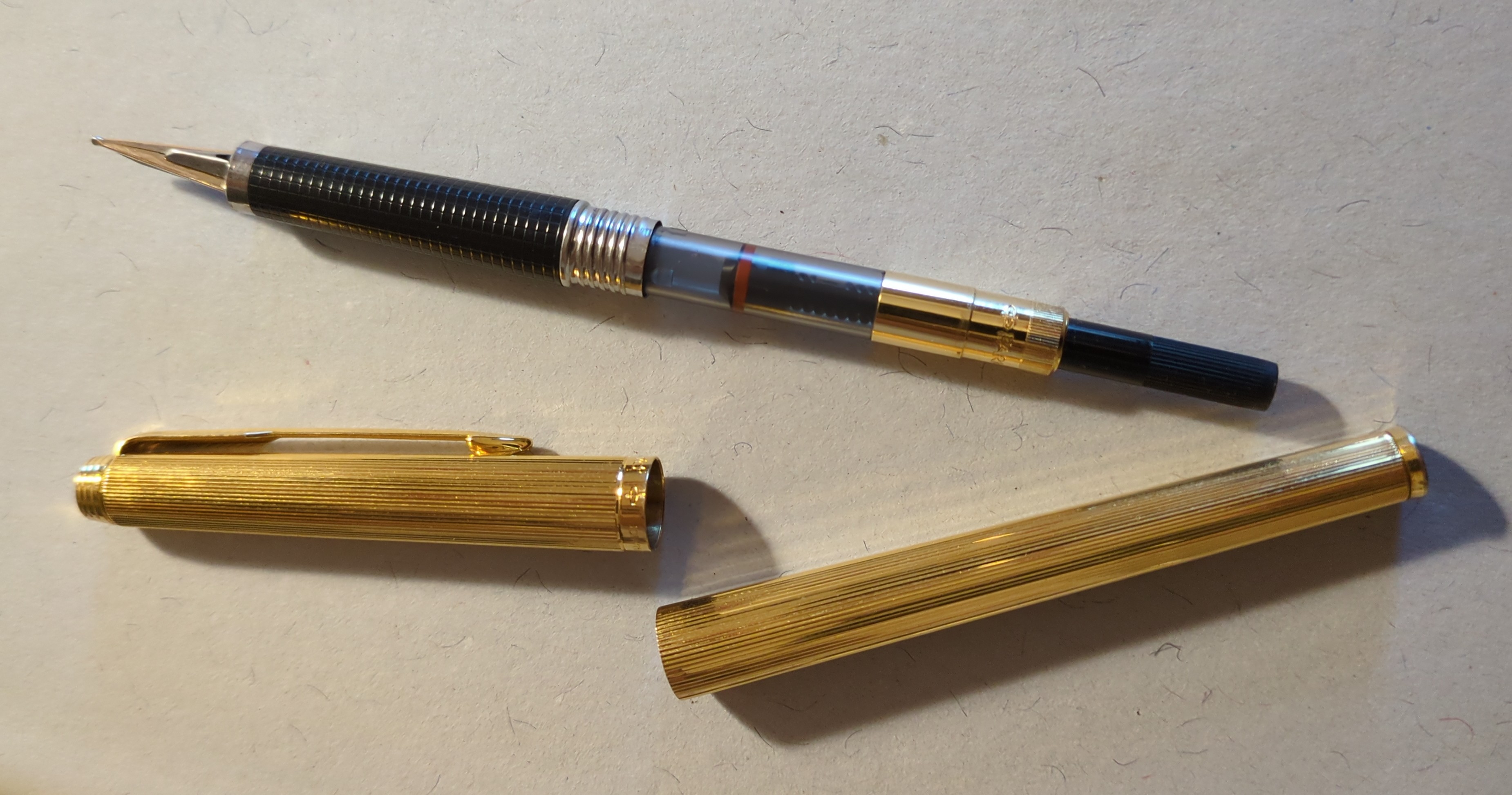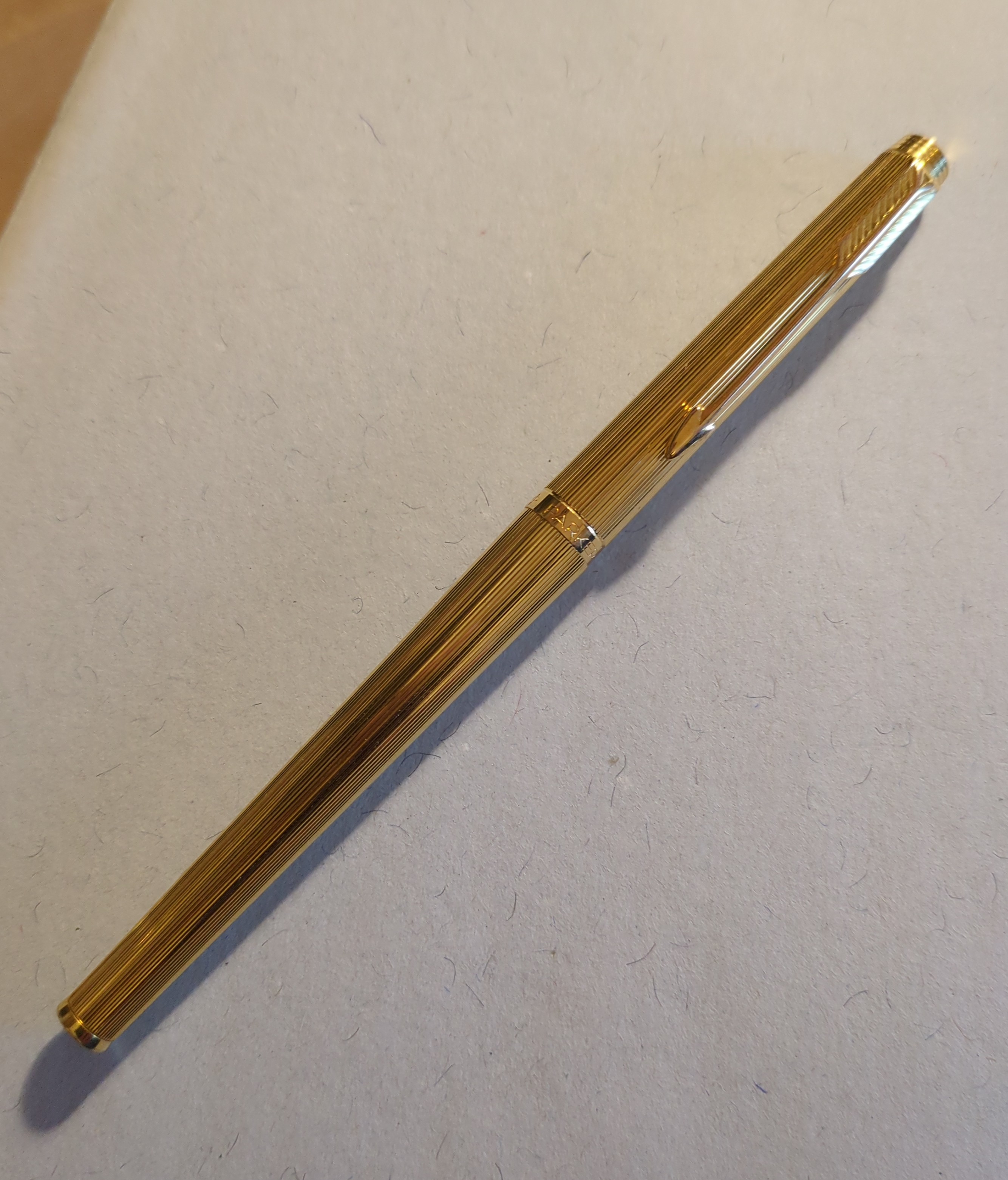 Mi pare di poter concludere che trattasi di: Parker 180 Goldplated Place Vendôme Milleraies, pennino 180° 14k F|B, 1980-1985 (non credo sia guillochè).