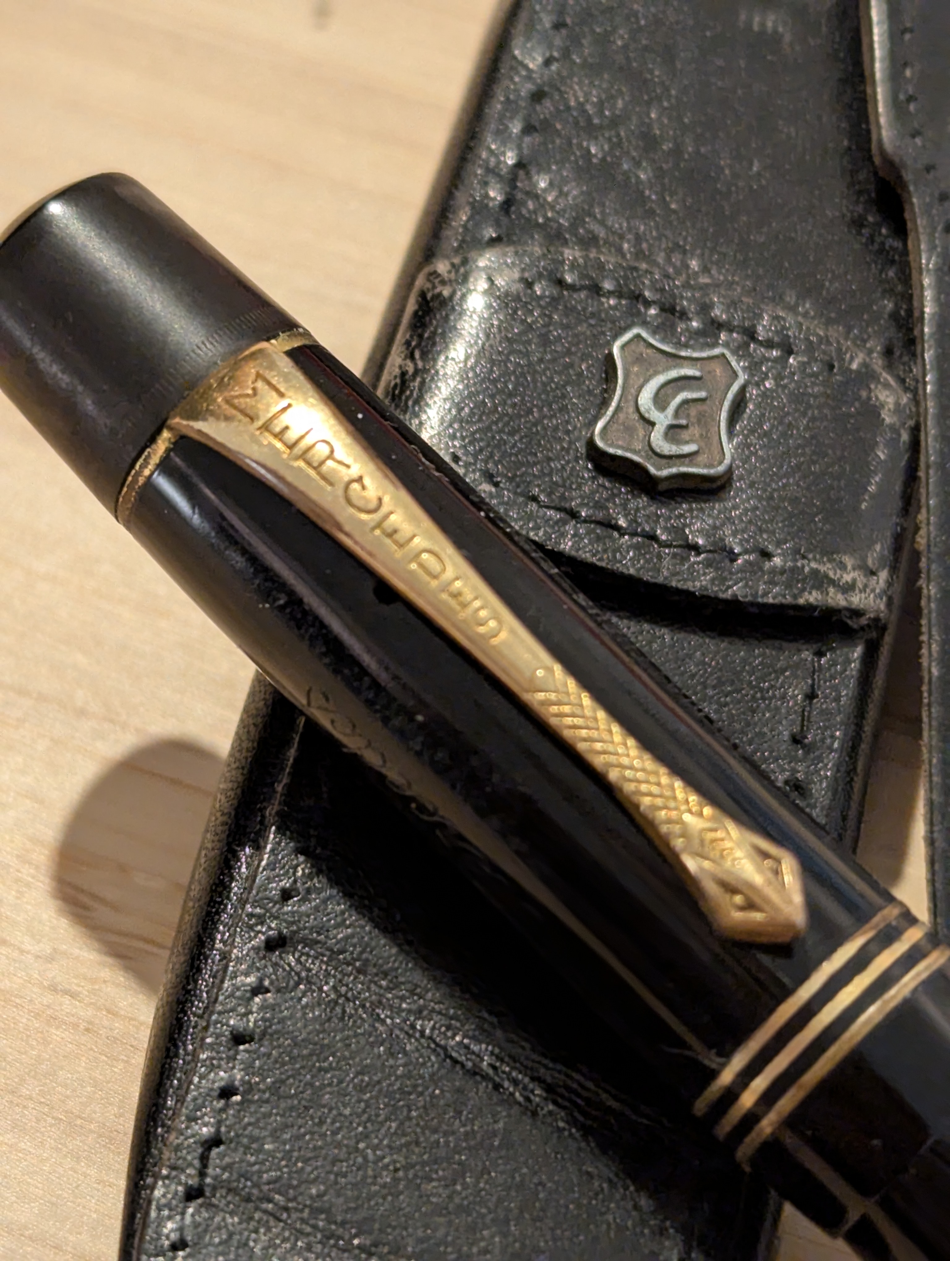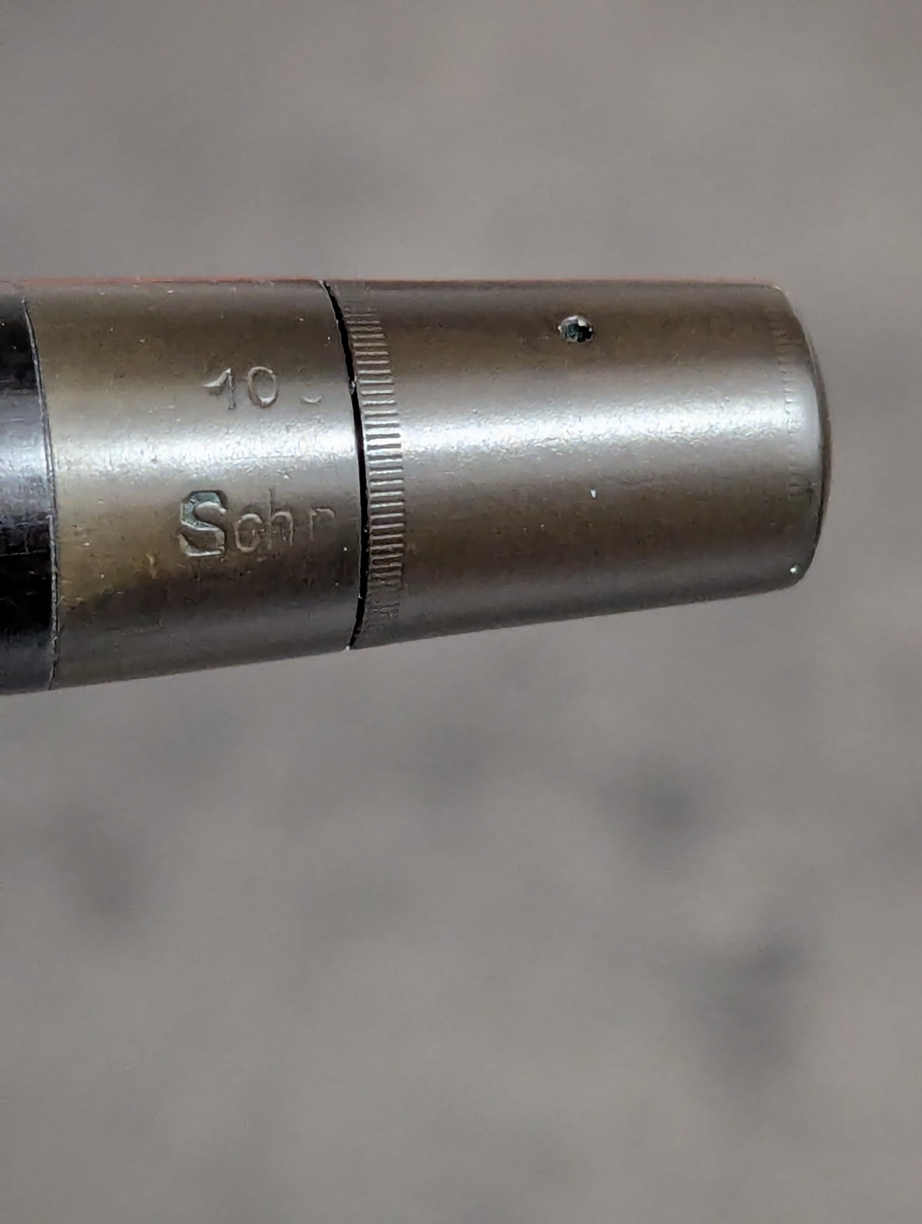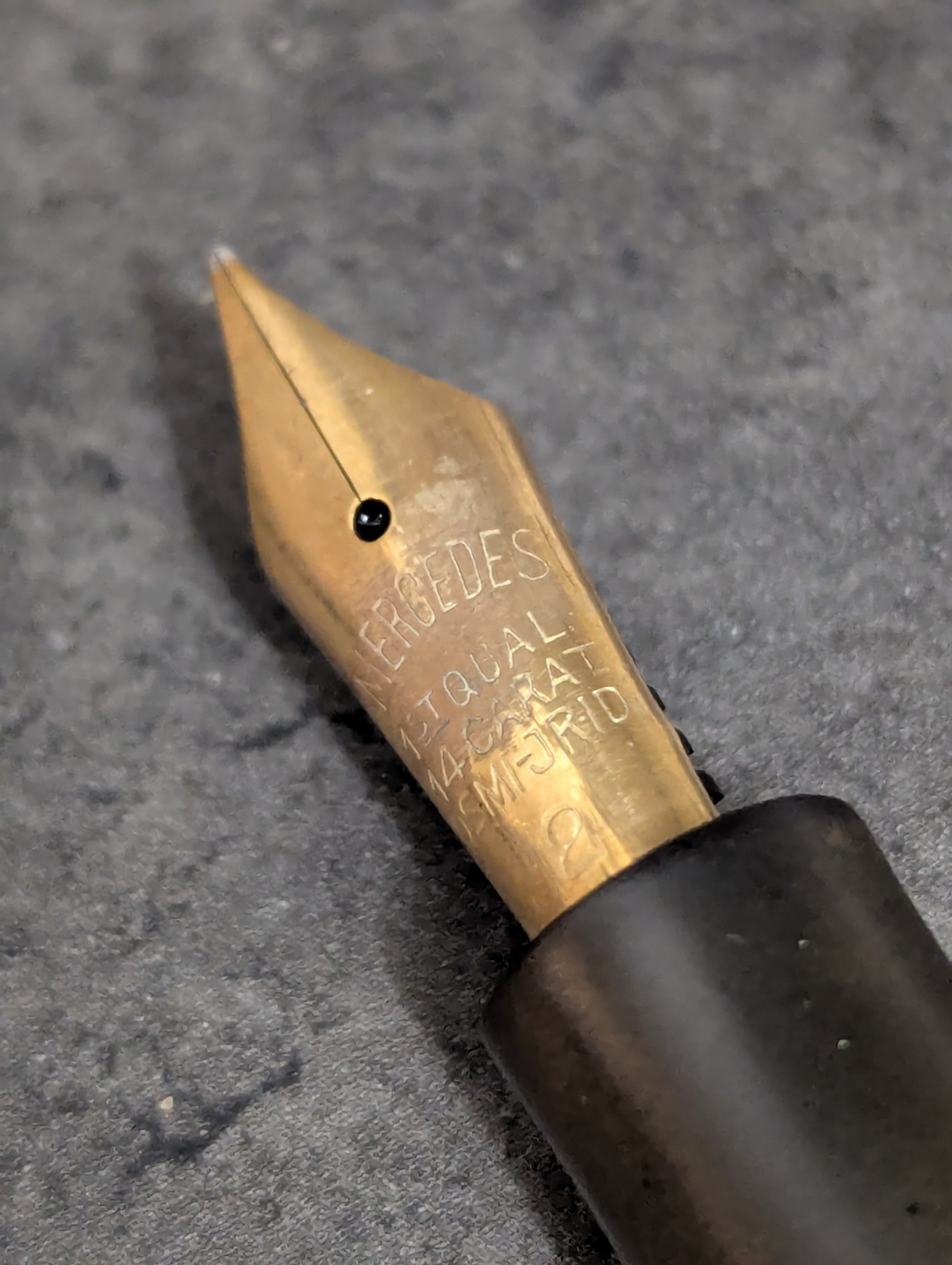 Raccolgo la sfida e metto le foto di questa Mercedes, trovata oggi su una bancarella di Monaco di Baviera insieme a una Ero, inopinatamente inserita nello stesso astuccio mono: ha degli strani segni sul fondello (numero 10 e scritta) e una scritta (pubblicitaria ?) sul fusto. Plastica scolorita su sezione e fondello (come l'Aurora 88).