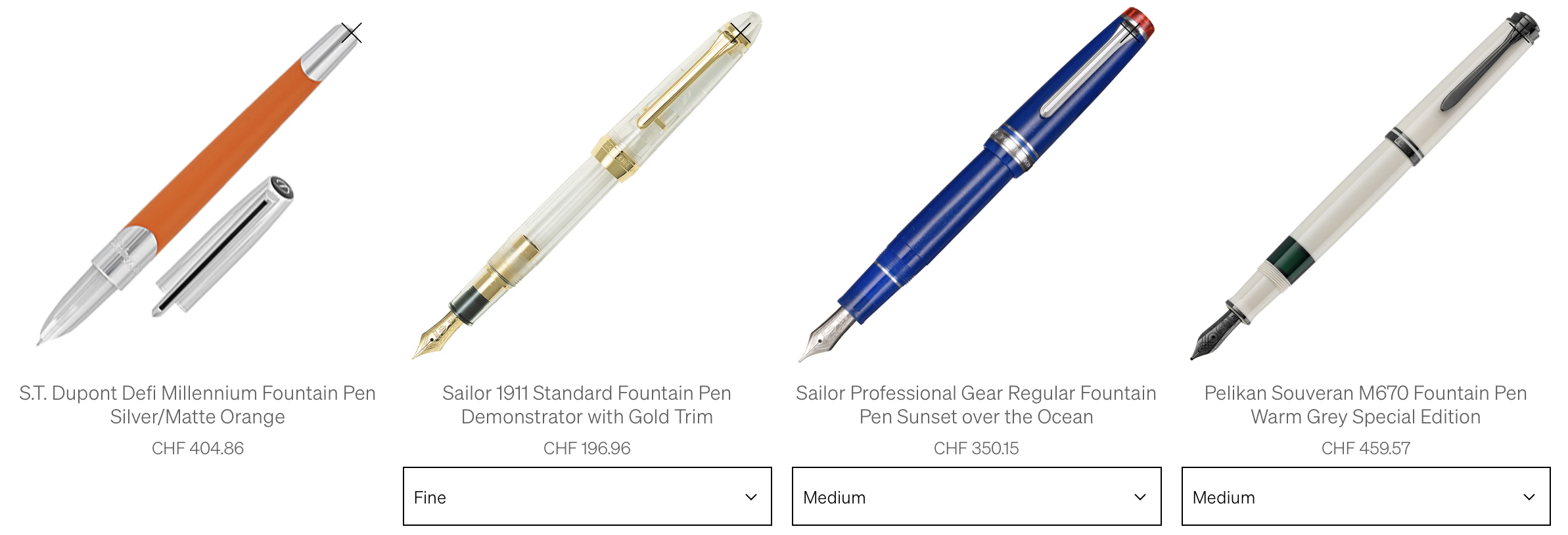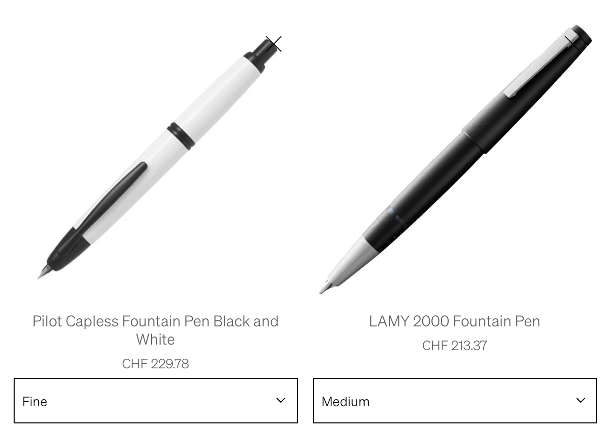 Purtroppo qui dove abito c'è solo 1 cartoleria che è un pò attrezzata di penne buone. Già guardate un pò tutte, ma hanno solo Pelikan,Parker,Waterman e Faber-Castell.