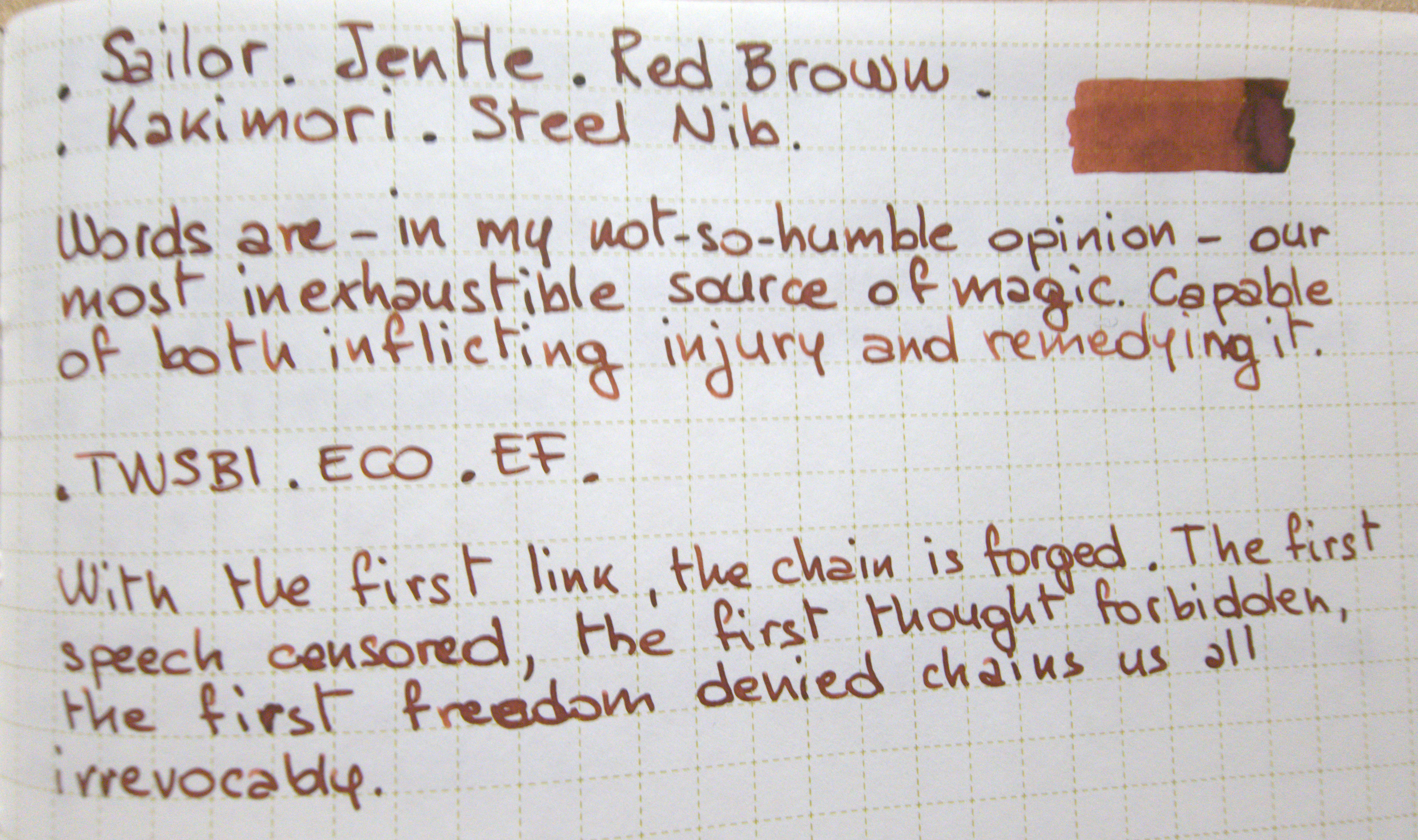 Io l'ho trovato (per mio gusto personale) molto bello come inchiostro da pittura, meno per la scrittura ma tendo a non amare i marroni aranciati e gli inchiostri così sbrodoloni.