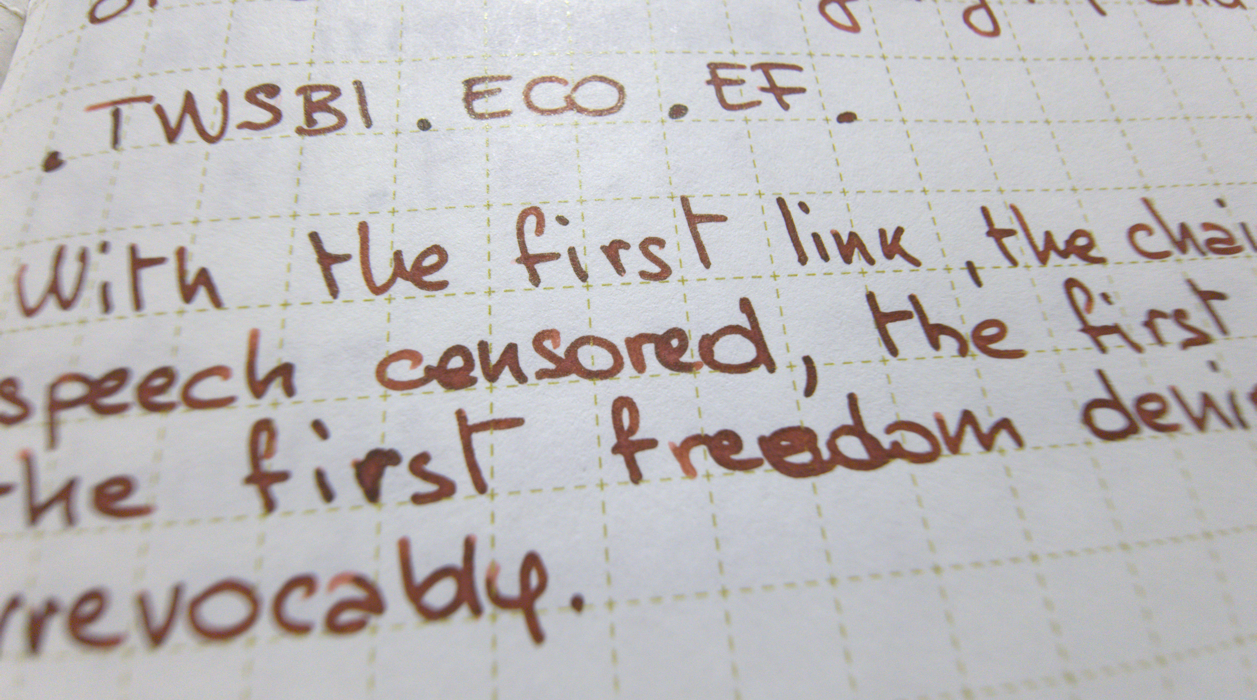 E' un inchiostro sbrodolone. Non tocca i picchi da cascate del Niagara dei Robert Oster ma scivola via dal pennino in modo abbondante e ne ingrossa il tratto.
