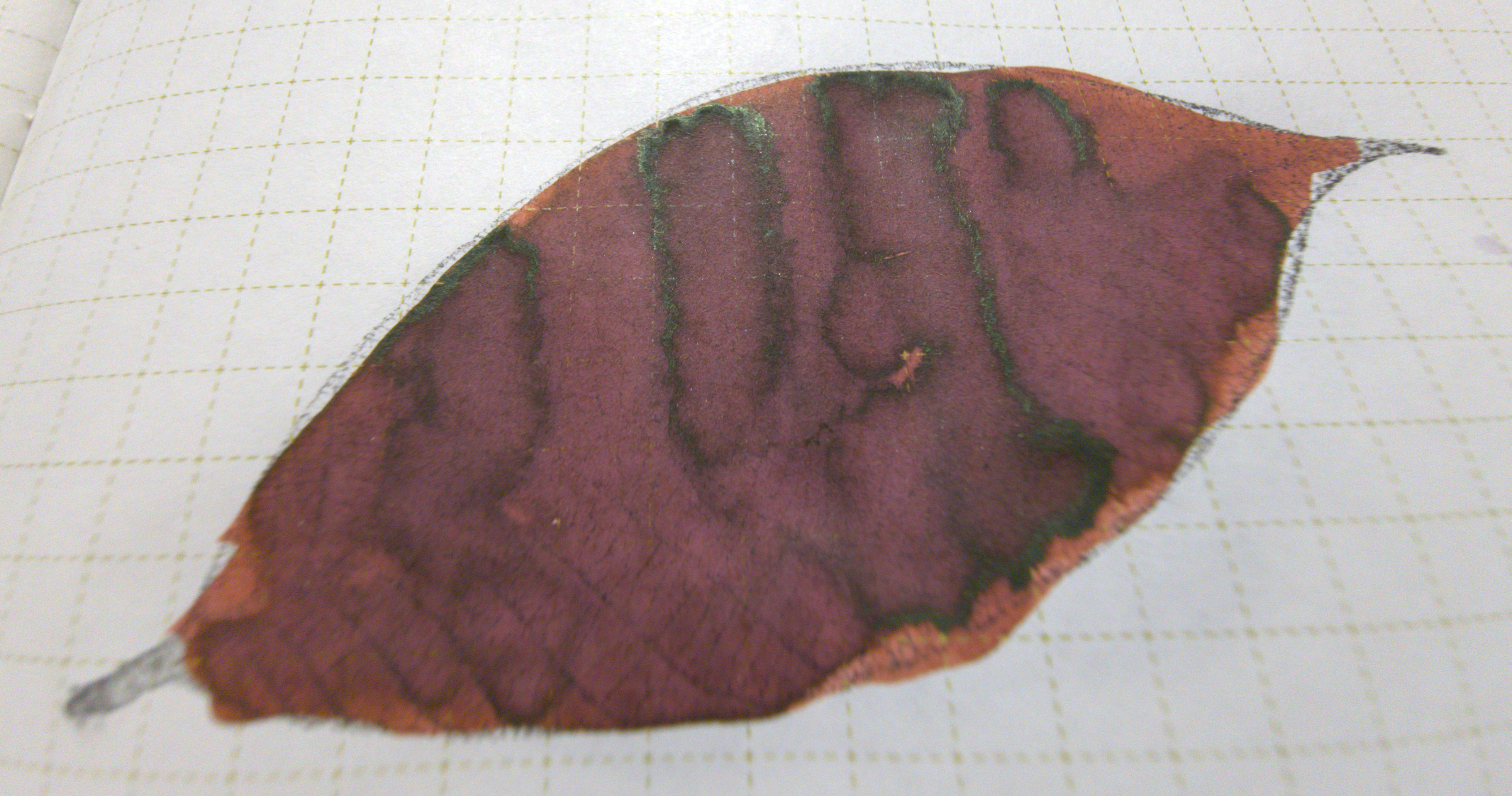 La foglia qui sopra fa emergere molto bene le componenti dell'inchiostro: giallo, rosa e blu (il rosa e blu emergono come un violaceo quasi berry). La cosa più interessante è che quando si diluisce l'inchiostro con acqua, il giallo sembra disperdersi.