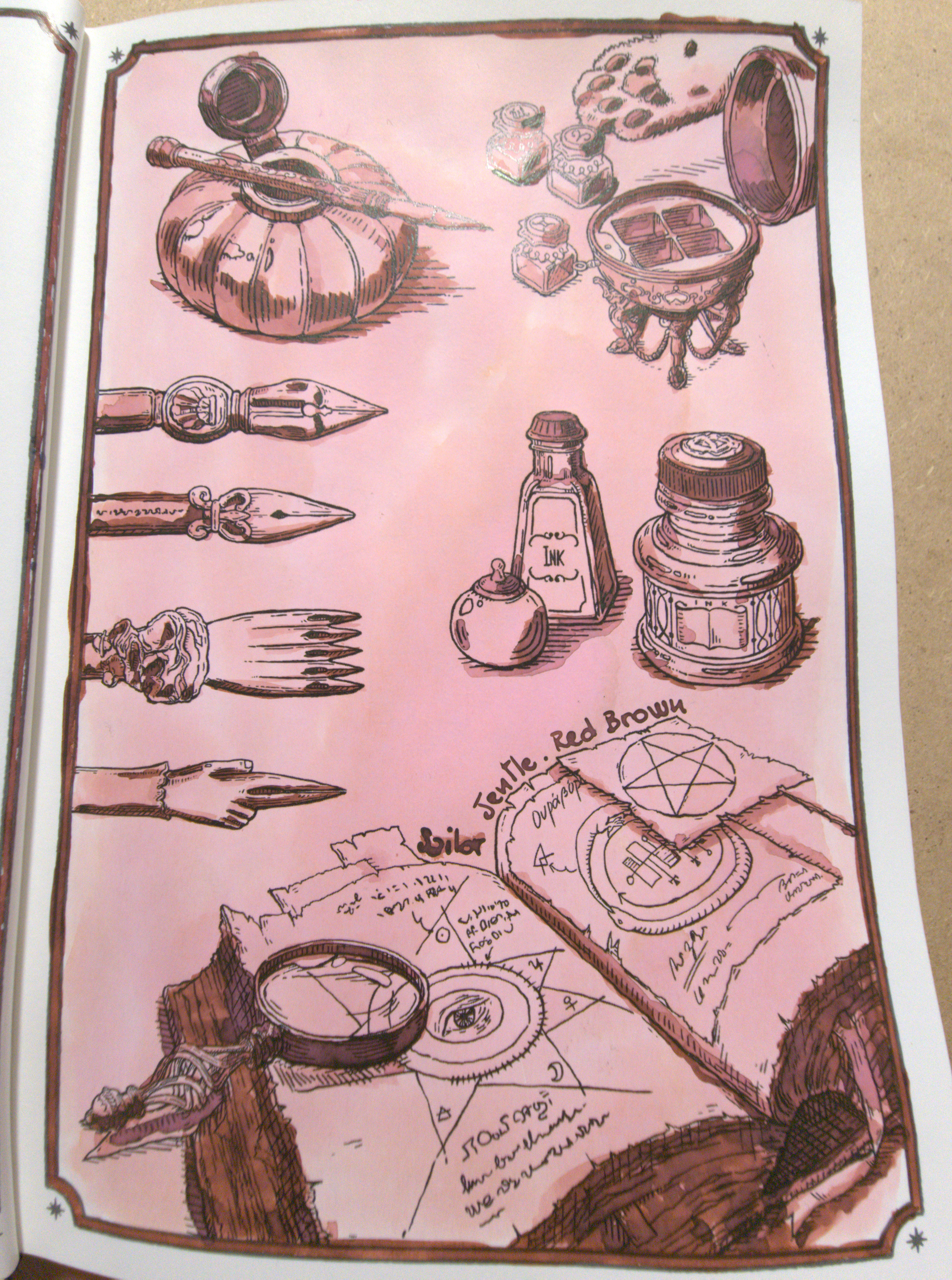 Ho deciso di provare a colorare una pagina del nuovo Log of Elixir di Dominant Industry, un libro illustrato fatto apposta per testare inchiostri (di fatto un libro per colorare), con tecnica monocromatica, usando esclusivamente questo Red Brown... e diluito è molto rosa.