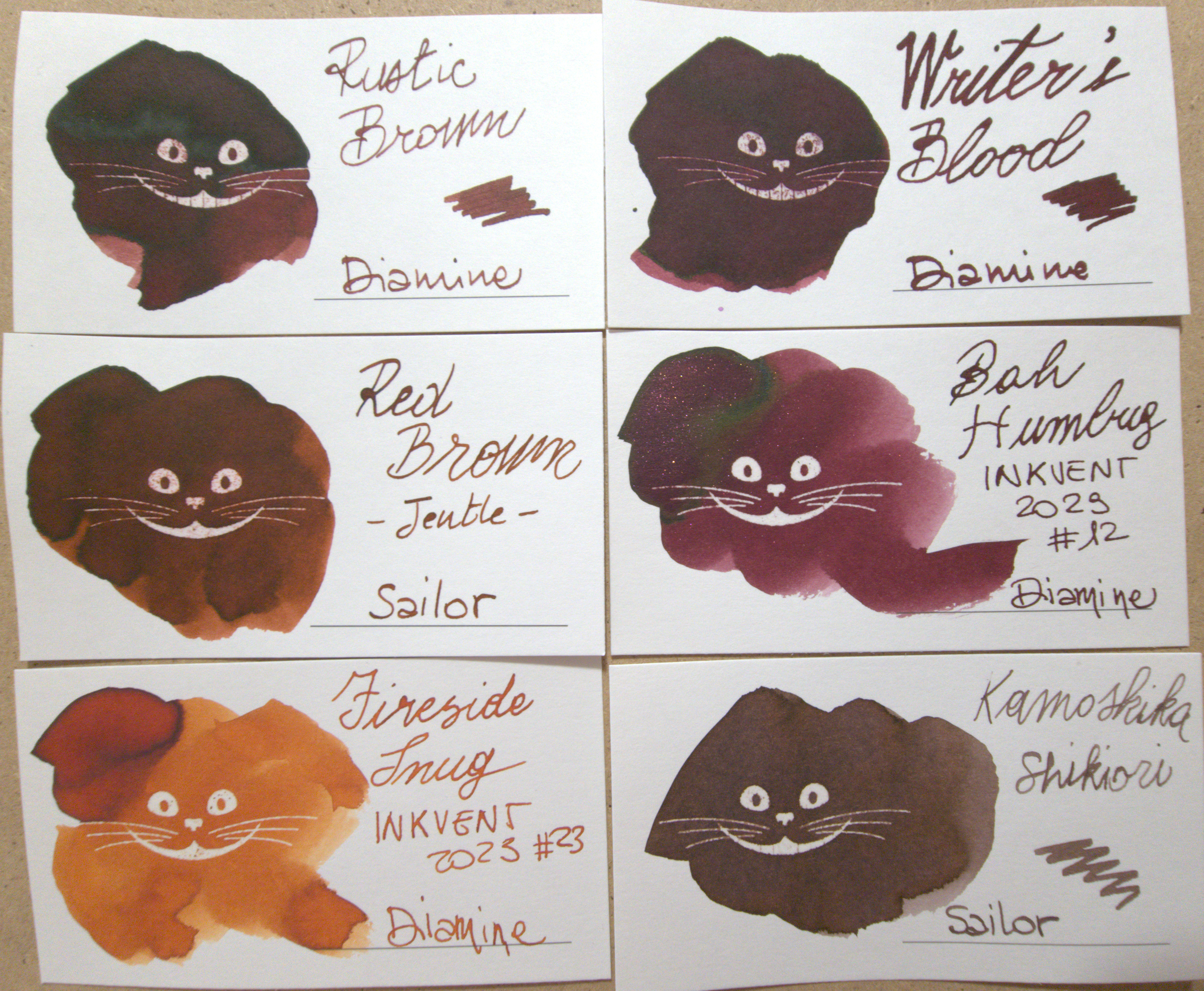 Il colore che ritengo più vicino è Fireside Snug di Diamine, la famosa versione che ce l'ha fatta di arancione. Sembrano quasi sedere su un'immaginaria scala da chiaro a scuro. il resto, non si avvicina per nulla a Red Brown.