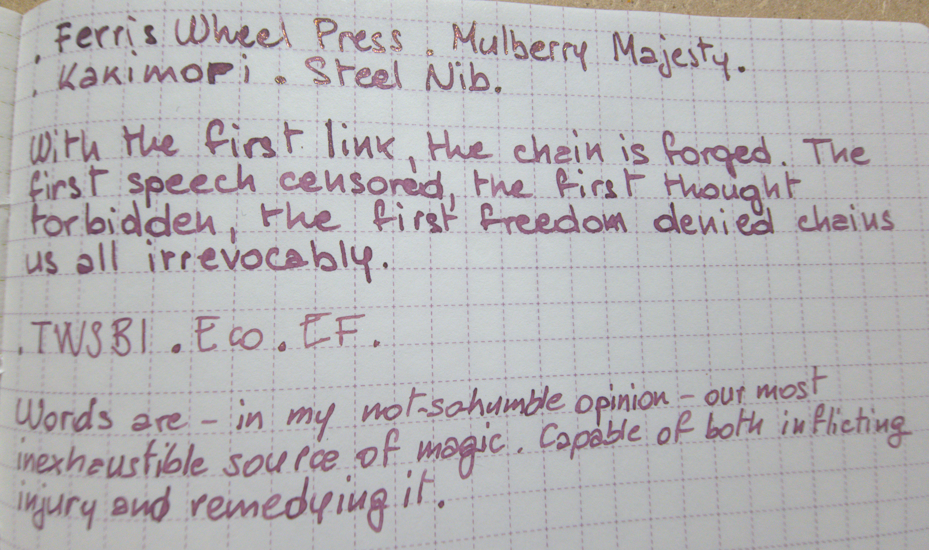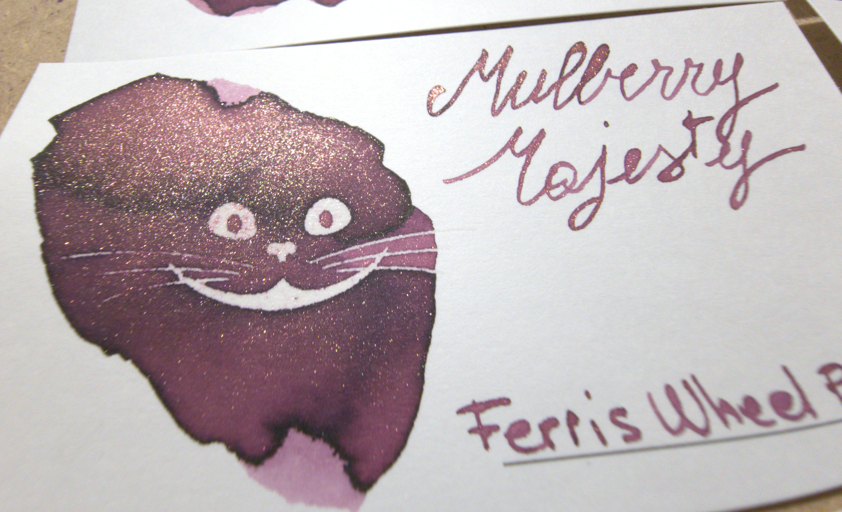 Mulberry Majesty è un inchiostro dall'eccellente bilanciamento di surfattante: non sbrodola e non è secco. Colori come questo, graziati da trasparenze e velature, tendono a rendere l'esperienza di scrittura più asciutta. Non questo. Dopo averlo testato, l'ho caricato in una penna e ci ho scritto a lungo ed è meraviglioso.
