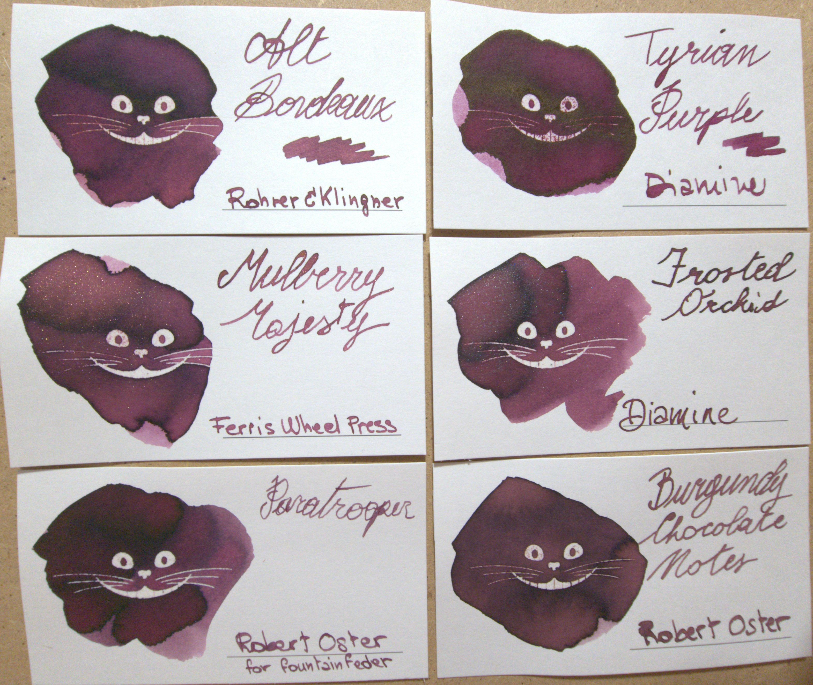La similitudine più forte si ha con Frosted Orchid di Diamine. Forsted Orchid, tuttavia, è stato desaturato con un tocco di giallo, che rende la resa del colore troppo fangosa. L'aver usato un neutro come il grigio, in Mulberry Majesty, non ha privato questo inchiostro del suo viola di base, facendolo restare più piacevole e "pulito" ai miei occhi.