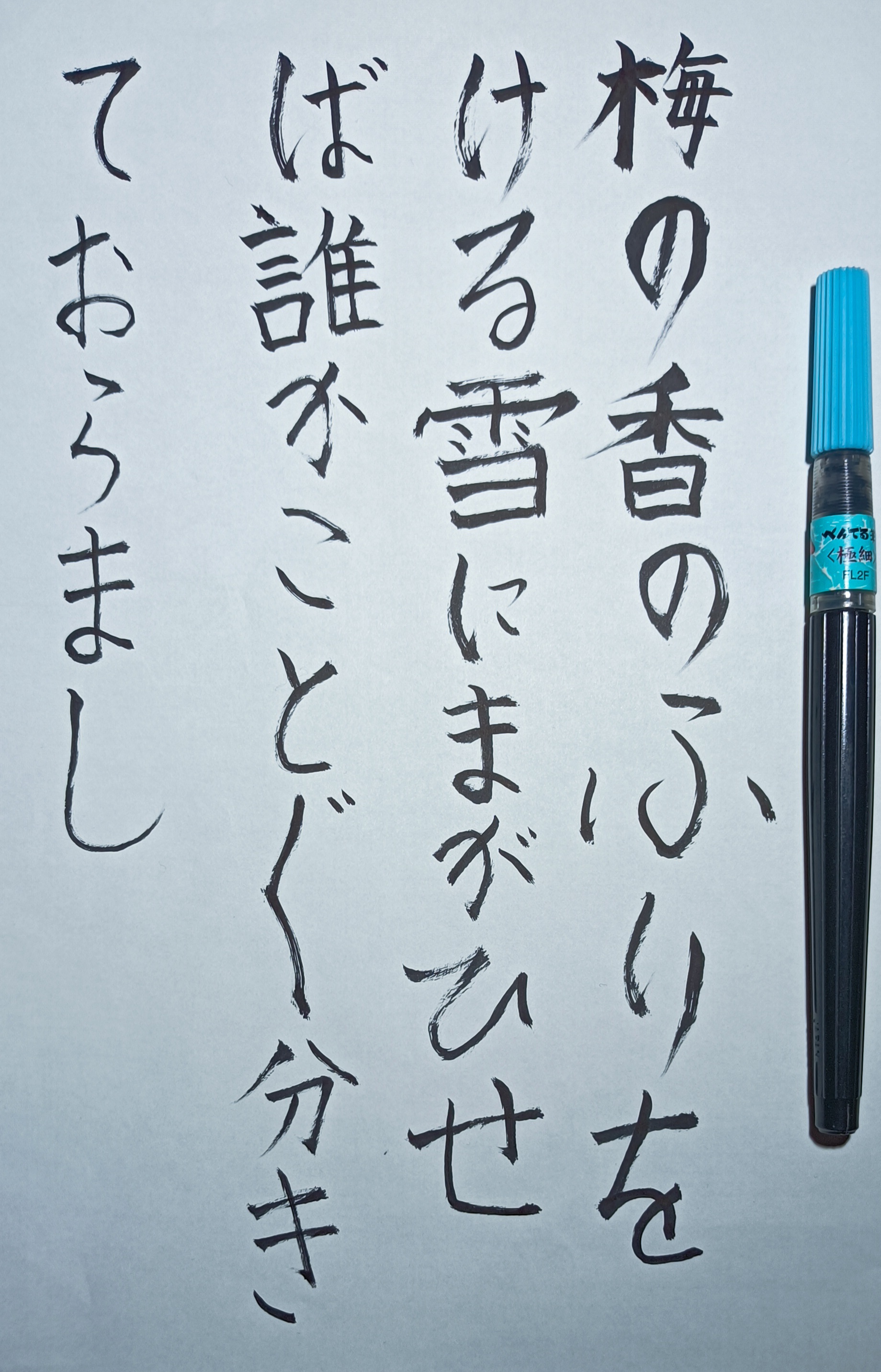 Condivido con voi quello che sto provando a fare in questi giorni con la calligrafia giapponese: ho ritrovato in un cassetto una fude-pen della Pentel comprata ormai tre, quattro anni fa e accantonata dopo essere passato alla stilografica, e ho quindi deciso di provare un po'. Con mia grande sorpresa, funziona ancora perfettamente!