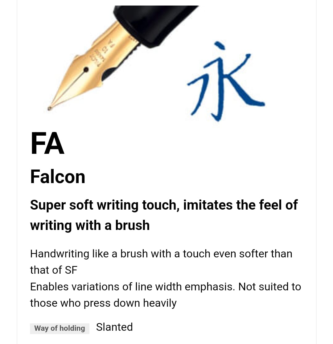 Ora scriverò una cosa che sarà nota a molti, ma la inserisco giusto per completezza: il FA è uno dei pennini speciali della serie Custom, ha misura di punta unica, ed è progettato per essere “super soft” e dare la sensazione di scrivere con la punta di un pennello, come scrive la stessa Pilot sul suo sito ufficiale (per l'elenco completo dei pennini si veda https://www.pilot-custom.jp/en/feature/nib.html):