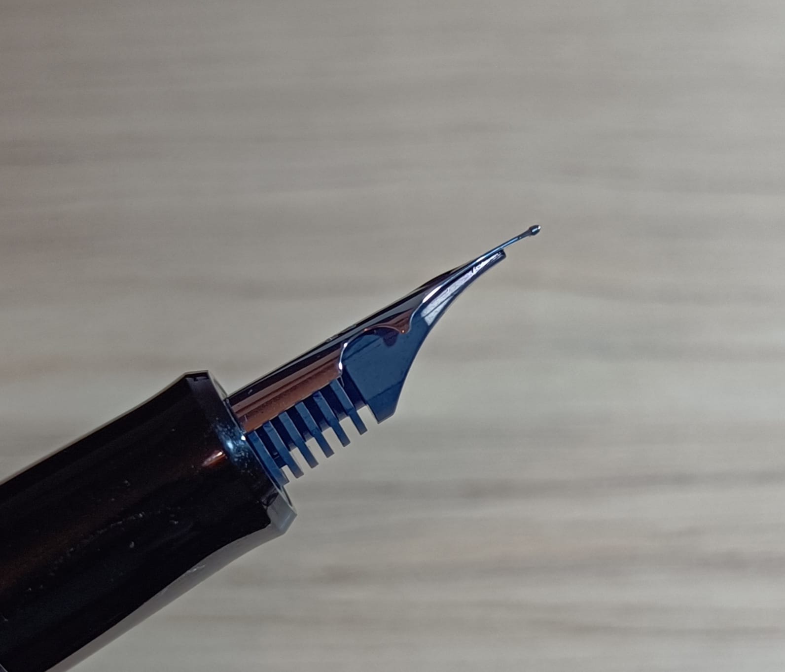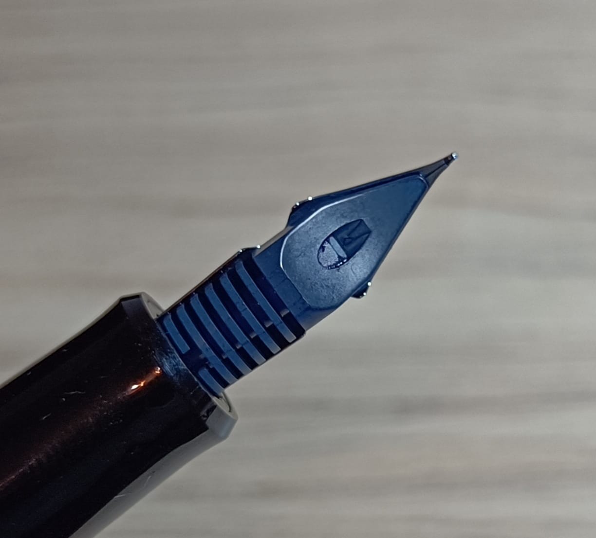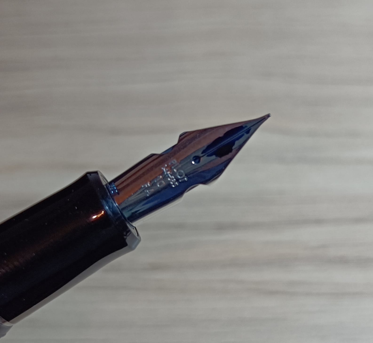 Passiamo ora al pennino, il cuore pulsante di questa penna, si tratta di un pennino di misura 10, che nella classificazione di Pilot è quella intermedia tra il più piccolo 5 e il più grande 15 (Esistono anche pennini di misura 3, montati su penne piccole, e pennini di misura 30 sui modelli molto gradi come la Custom Urushi. Esiste anche il pennino numero 50, montato su alcune enormi Namiki). Si presenta molto semplice, senza alcuna decorazione, con un piccolo foro di sfiato, sotto il quale troviamo le incisioni “PILOT/14k-585/FA” e, caratteristica peculiare di questo pennino, due intagli sulle spalle. Sotto al pennino troviamo il classico alimentatore in ABS della linea Custom.