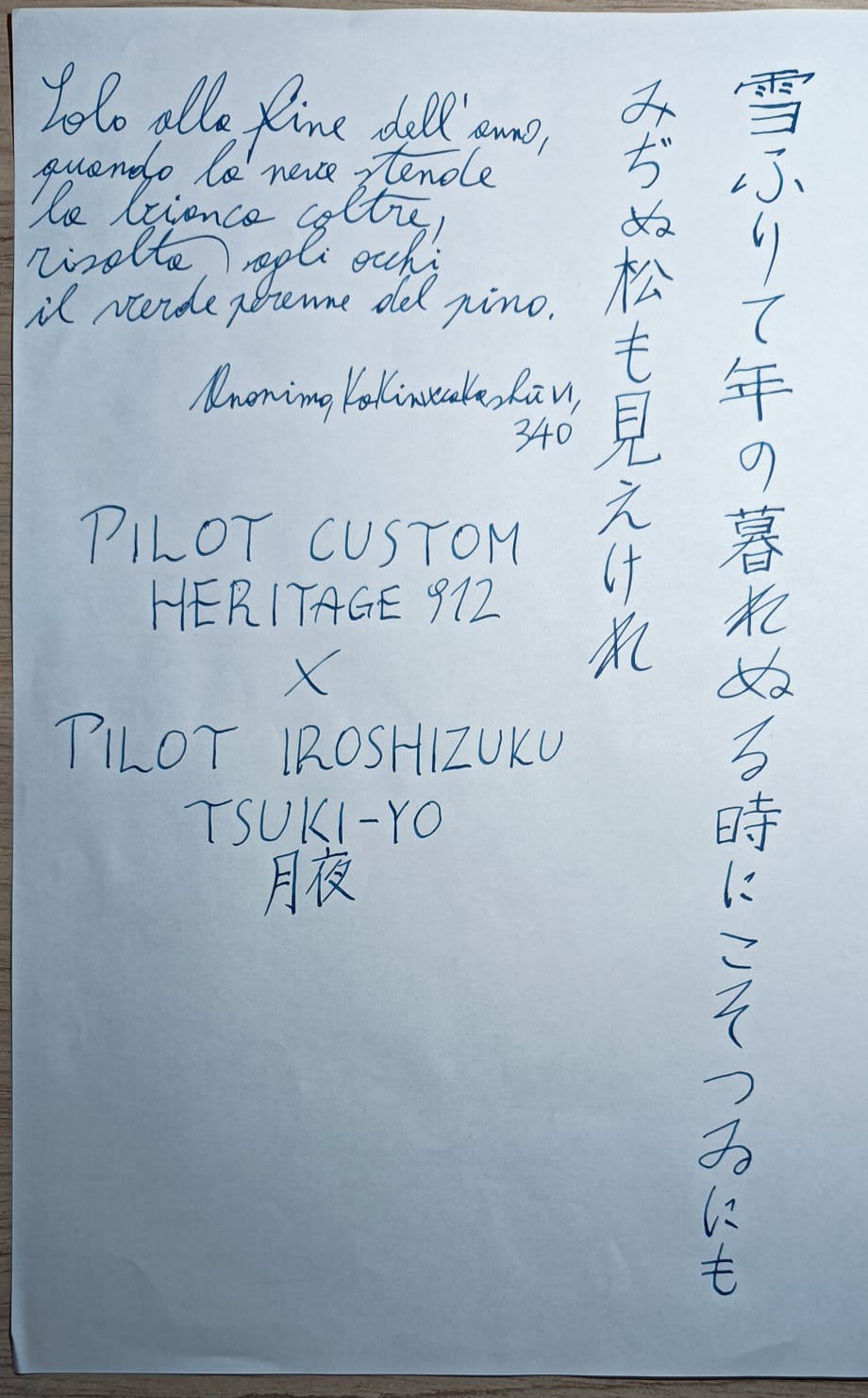 Credo sia dunque giunto il momento di parlare delle prestazioni di scrittura. Si tratta di un pennino flessibile, con i rebbi molto molto reattivi che si muovono al minimo contatto con la carta, tanto che per me è difficile scrivere mantenendo un tratto uniforme, devo veramente sforzarmi. Si tratta infatti di un pennino che definirei “vivo”, ha un forte dialogo con la carta, con la naturale pressione di scrittura il tratto si ispessisce nelle discendenti e nelle curve. Questo effetto è accentuato su carte più ruvide, ma lo vedo ben presente anche sulla liscissima Rhodia. Adesso veniamo alla questione che ha causato tante discussioni in rete: l’alimentatore regge la richiesta di flusso all’allargamento del tratto? La risposta breve è: sì, a patto che si rispettino i limiti strutturali di questo pennino. Il pennino FA dalla mia esperienza non è un pennino per principianti, richiede una mano educata a dare pressione in modo contenuto e graduale, un’oculata scelta di carta e inchiostro, non andare troppo in là con la flessione…ma, se rispettate queste condizioni, può dare veramente tante belle soddisfazioni. Lo ritengo molto adatto alla scrittura in giapponese (grazie al piffero, dirà qualcuno), ma anche lì è indicato per una scrittura posata. Ho visto che da molti viene adattato per la calligrafia nostrana, e qui mi preme specificare: questo pennino può essere ADATTATO per la calligrafia in alfabeto latino, ma non nasce per questo. Da qui credo che nascano tutte le critiche e le polemiche intorno al pennino, perché si richiede al FA di fare bene quello per cui non è stato progettato. Infatti, andando a cercare variazioni di tratto molto ampie, necessarie ad alcuni stili calligrafici, l’alimentatore non riesce a reggere. Molti, infatti, acquistano alimentatori sostitutivi in ebanite a due o addirittura tre canali. Personale esperienza: complice un GdA, ho preso uno di questi alimentatori, a due canali, l’ho montato sulla mia 912, ho visto che il tratto risultava troppo bagnato per i miei gusti, ho rimesso l’alimentatore originale. Per i miei scopi va benissimo così, non sono per niente appassionato dei pennini troppo bagnati, non faccio al momento esercizi di corsivo inglese. Vi lascio la trascrizione di una poesia giapponese con traduzione in italiano.