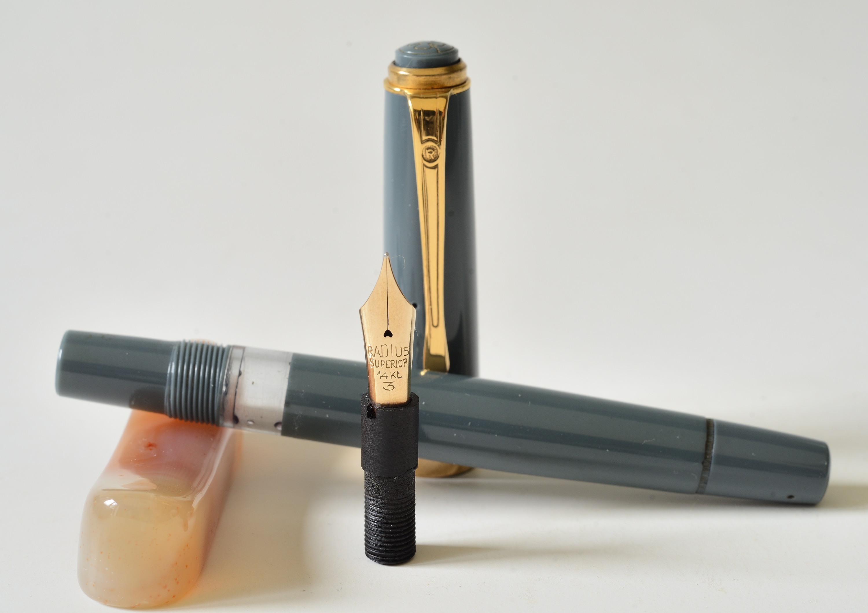 Una penna alla quale sono particolarmente affezionato, una uguale ma bordeaux è stata la prima Radius che ho trovato ad un mercatino "anta" anni orsono, chissà dove l'ho messa? Questa invece, tristemente nera ogni tanto la utilizzo, ha un pennino ancora fastidiosamente (x i miei gusti) flessibile...