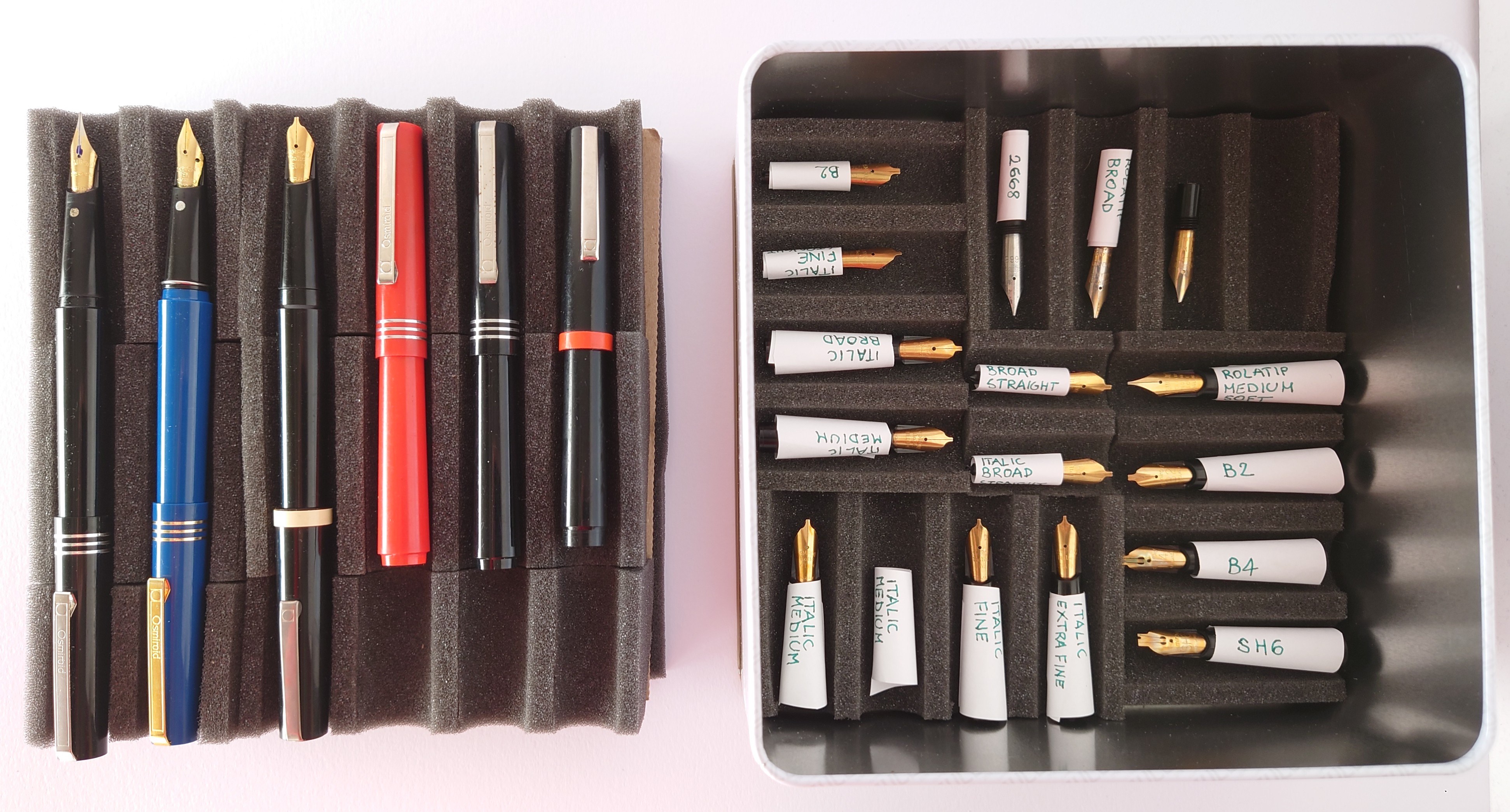 Sto ancora sperimentando il modo di conservare le due collezioni con l'intento di usarle, non di tenerle per esposizione. Al momento ho raccolto la parte pronta all'uso in una scatola di latta, ed ho etichettato i pennini usati per facilitarne il riconoscimento, visto che leggere il nome del pennino leggendo l'incisione è alquanto difficoltoso. Voi come conservate tanti pennini?