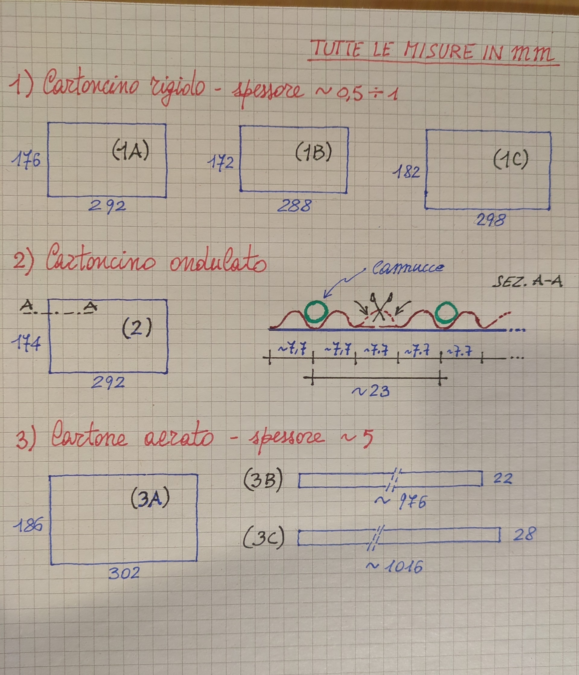 a) Si rifilano il cartoncino rigido, il cartone alveolato e il cartoncino ondulato come indicato nello schema (tutte le misure sono in mm): Con le forbici si arrotondano leggermente gli spigoli (raggio massimo 2÷3mm).