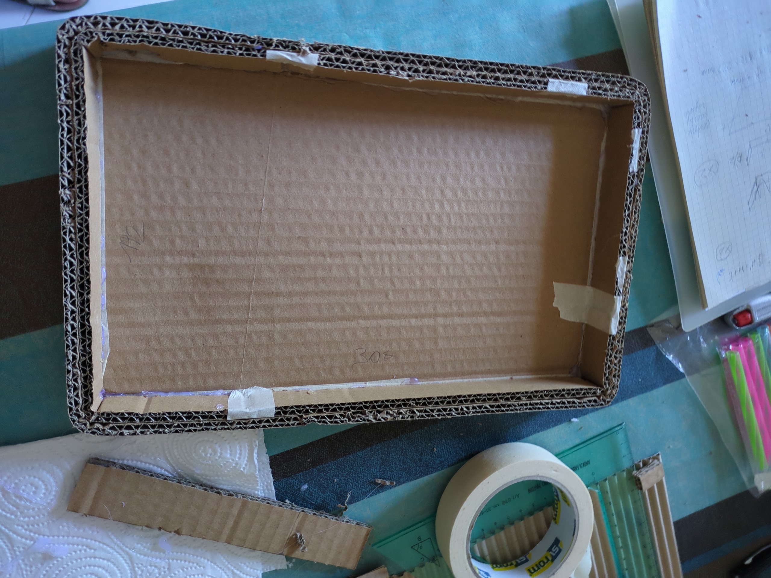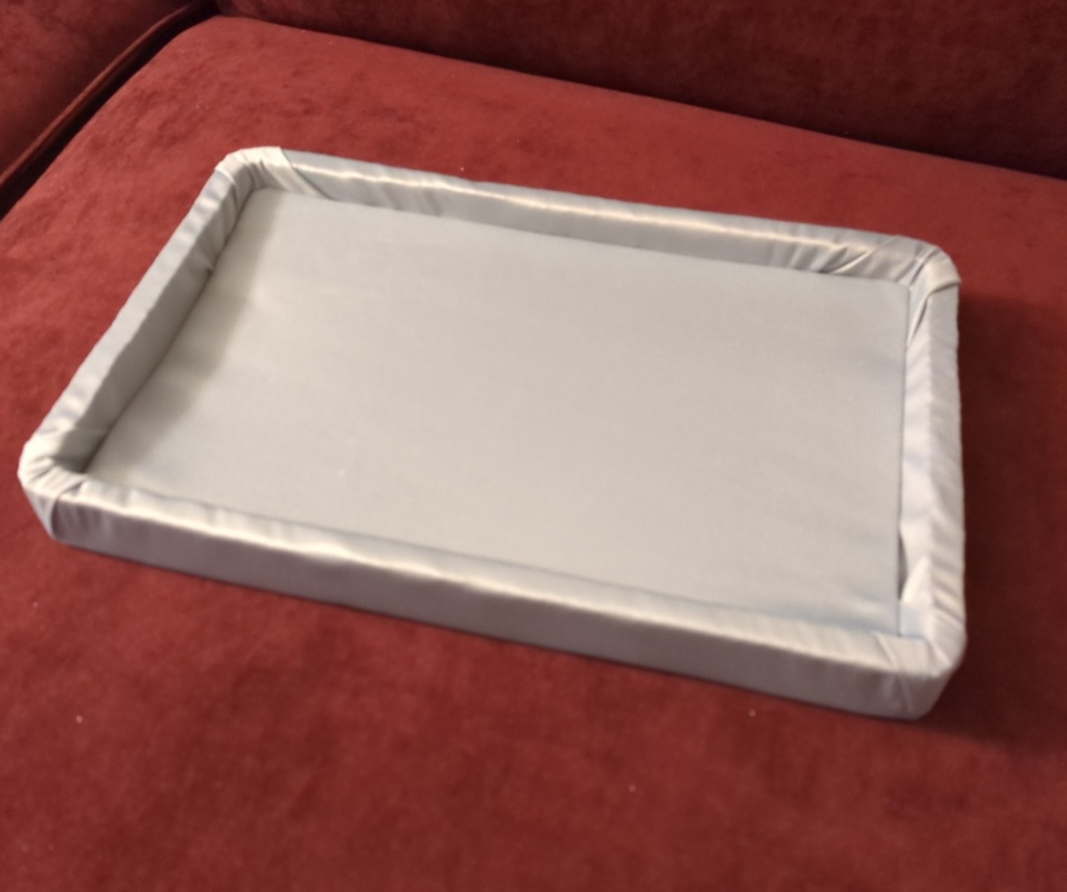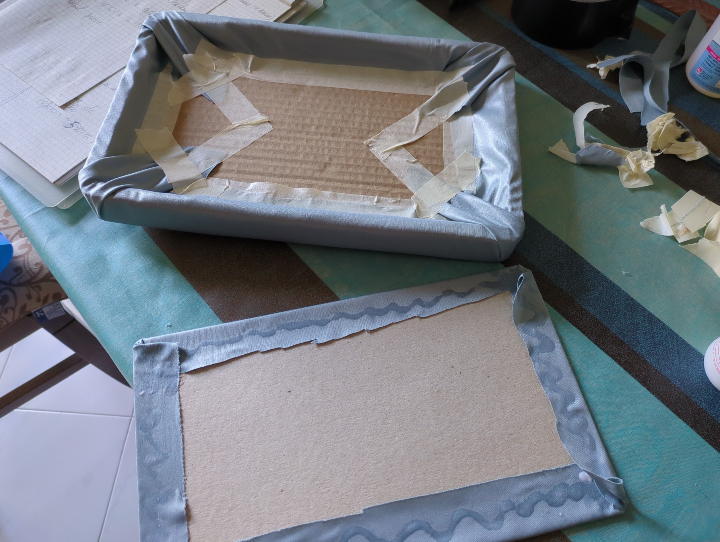 Potresti usare il legno anziché il cartone, facendo il vassoietto, con una base e bordi laterali fatti con dei listelli, incollati e rivestiti in stoffa (ho visto che alcuni cassettini in commercio sono fatti in questo modo).