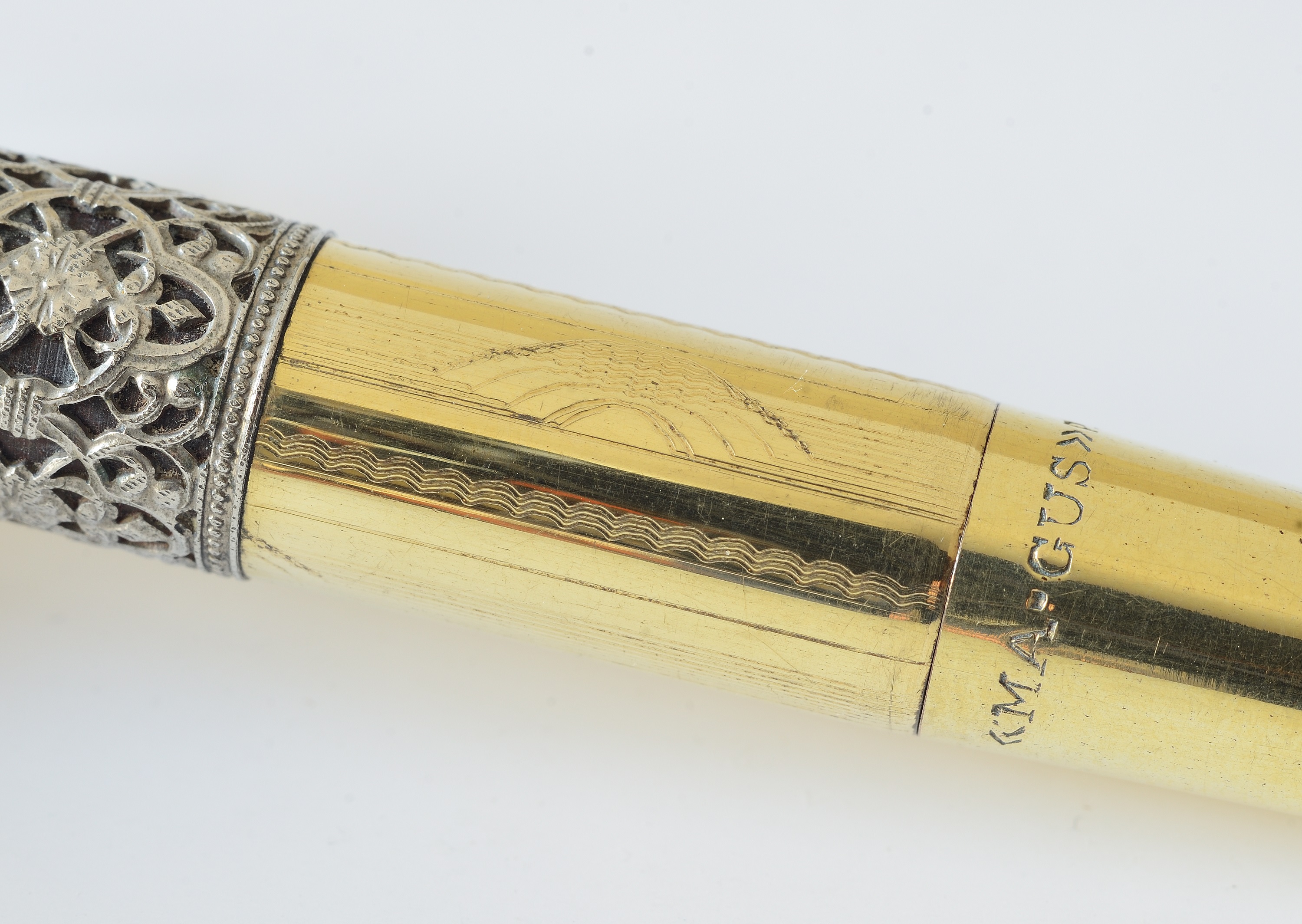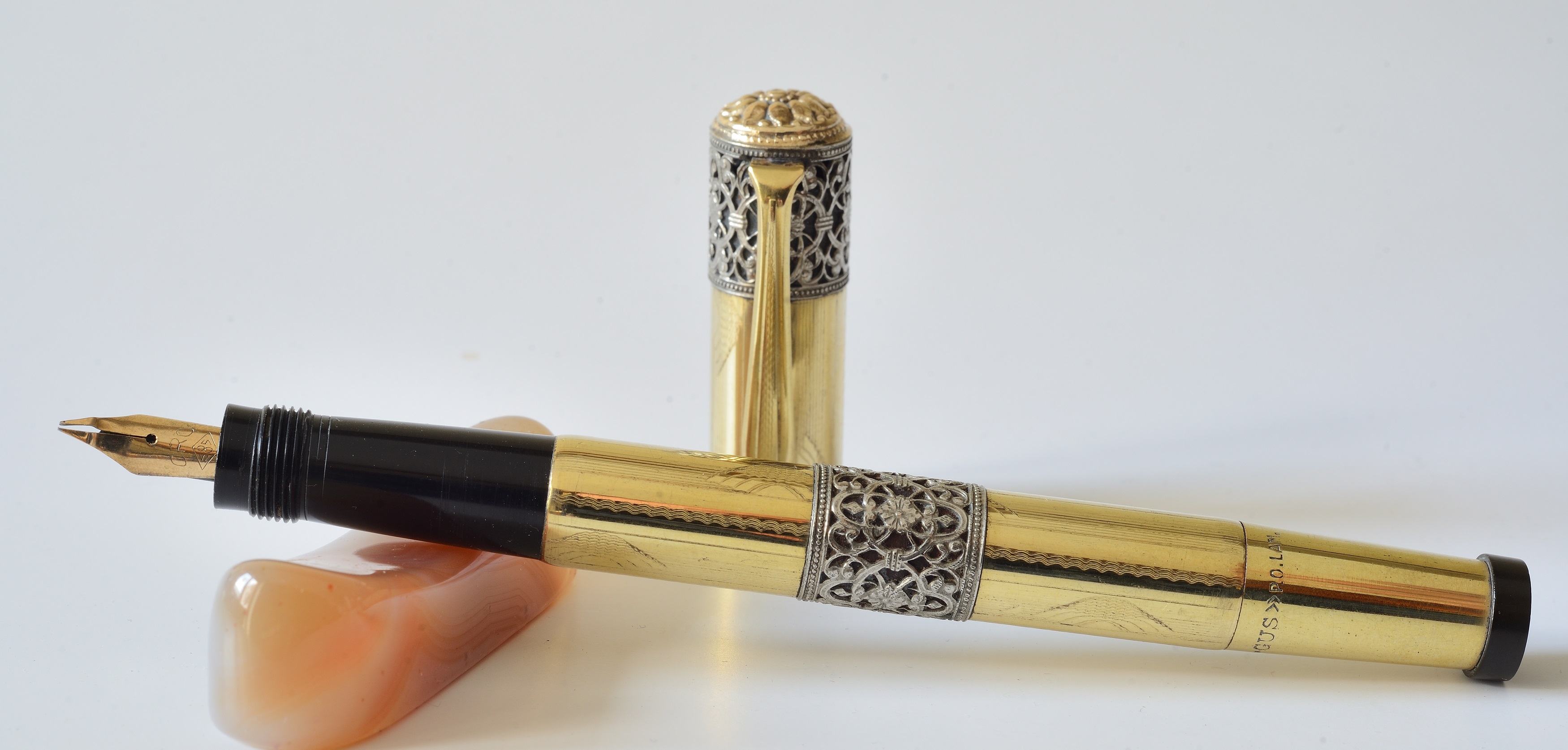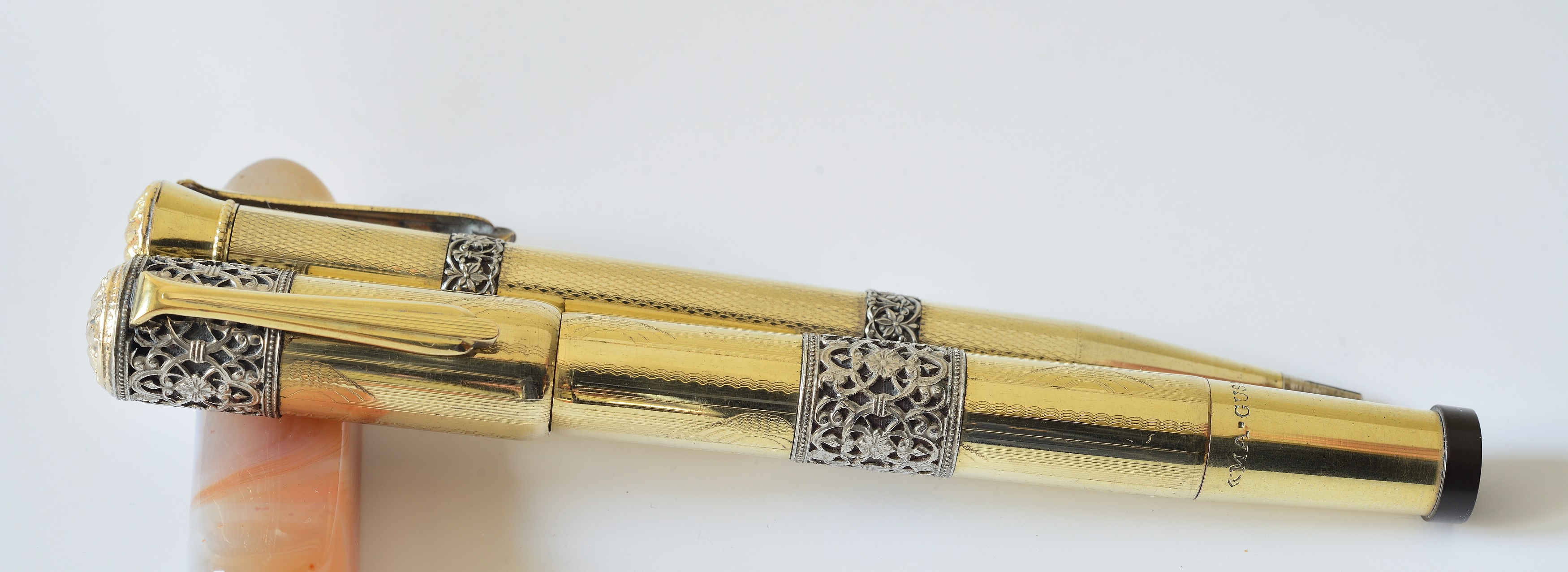 La Ma.Gus è una rientrante laminata oro con due fasce in filigrana d'argento trovata in parure con la sua matita, fine anni 20 credo, purtroppo senza scatola e con pennino non suo in oro 14K, porta le sole scritte su tre righe ORO - 585 in un rombo e Extra.