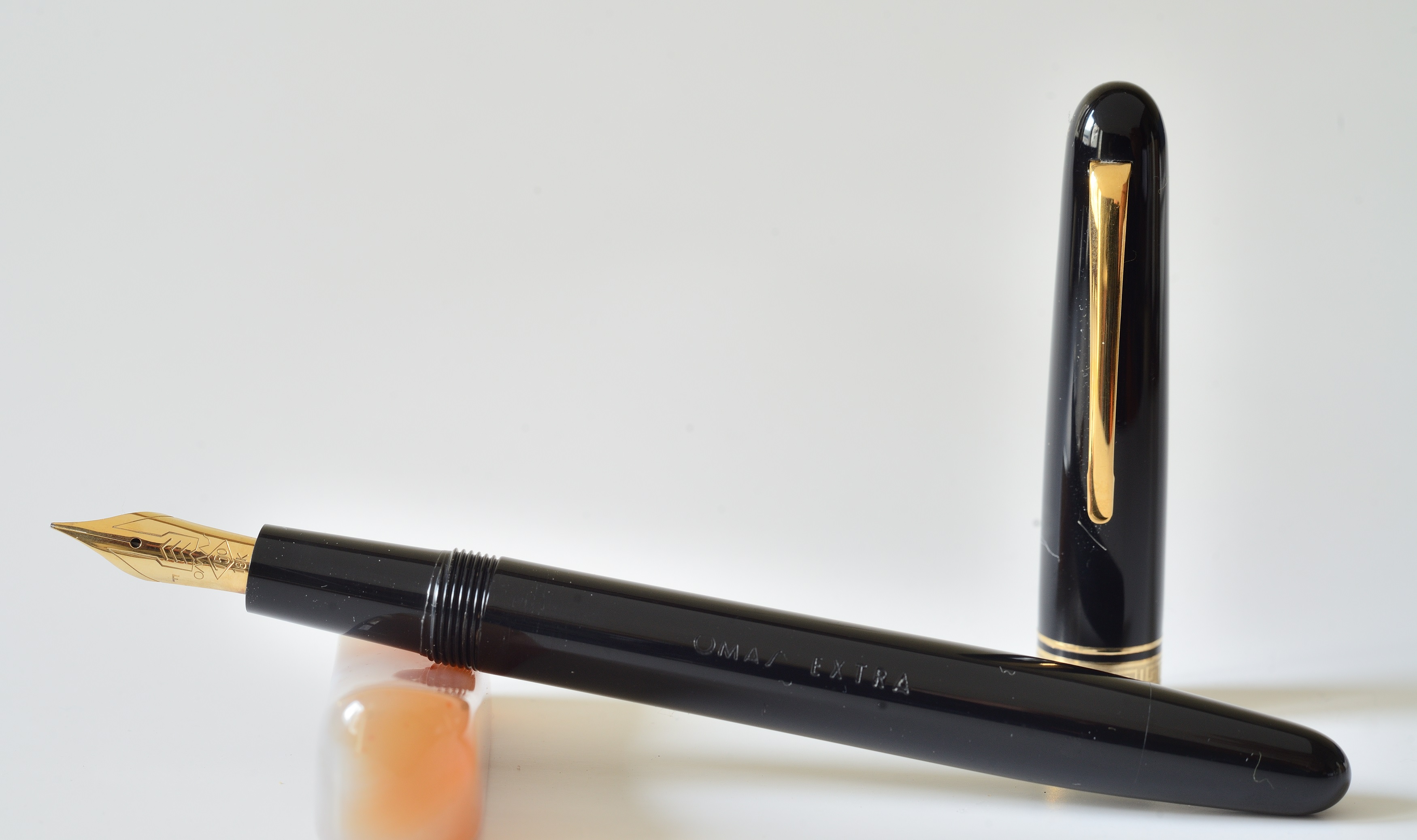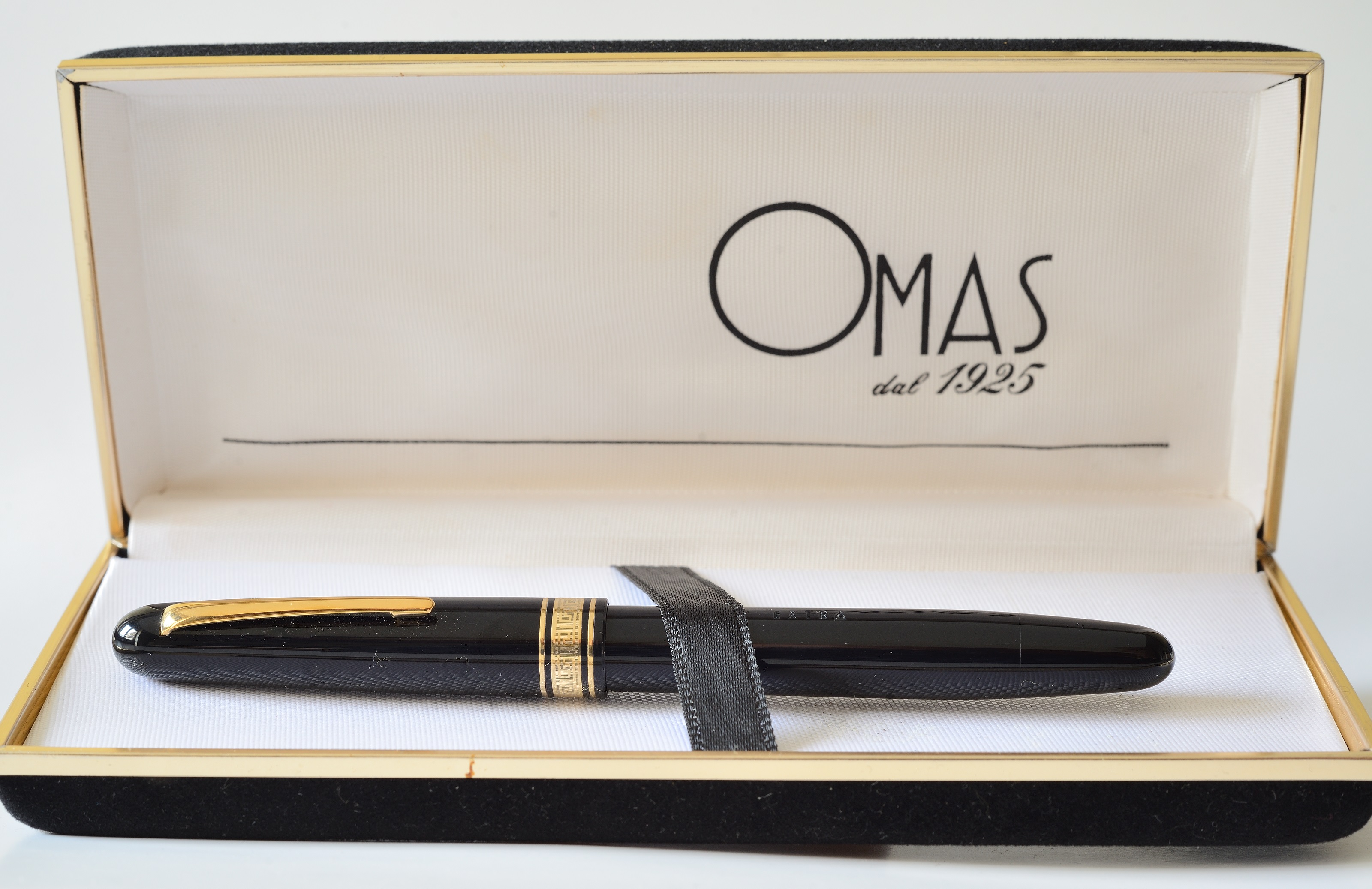 La Omas Extra credo sia una Ogiva anni 80, greca con due anellini sottili al bordo del cappuccio, pennino in oro 18 k, al fusto la scritta Omas Extra con la S stilizzata leggermente inclinata.