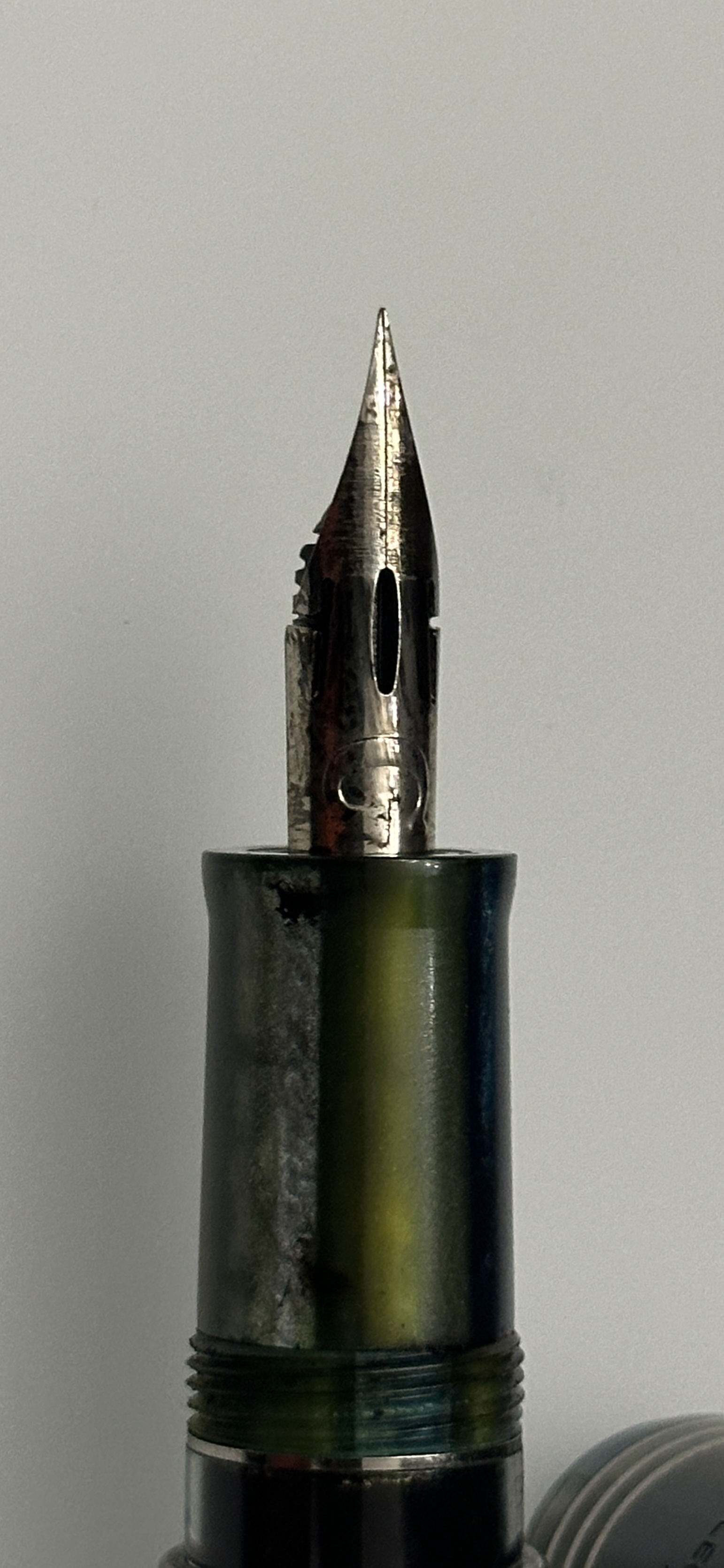 Io credevo che fosse possibile estrarre pennino e feeder dalla sezione tirando pennino e feeder come ho fatto con la X750. Ho scoperto provando che però la sezione della Delta sembra incollata o saldata al feeder e incastrata pesantemente sul pennino. Ho quindi divelto la sezione (devastando di conseguenza il feeder) ma sono riuscito ad estrarre il pennino senza apparentemente danneggiarlo.