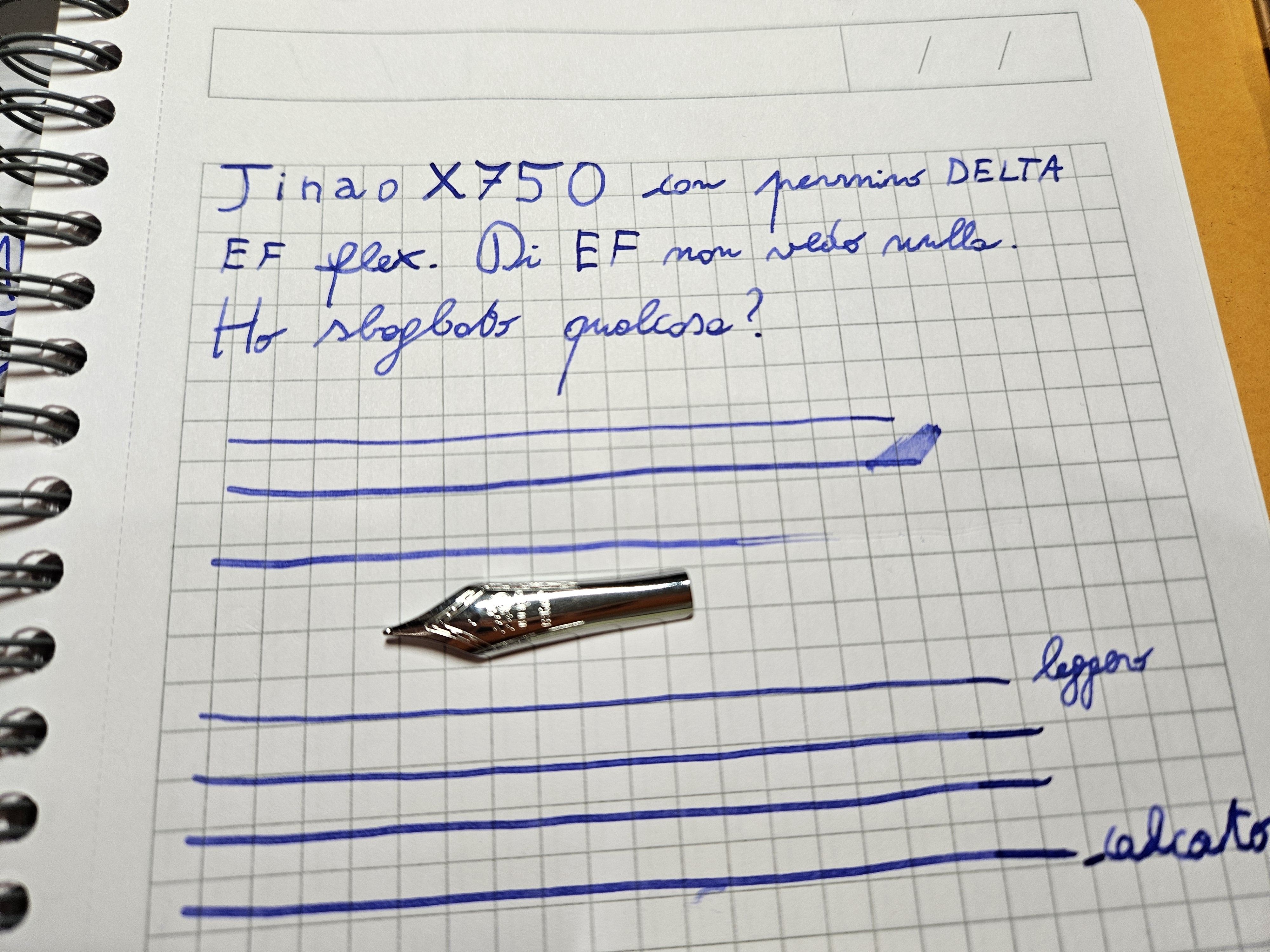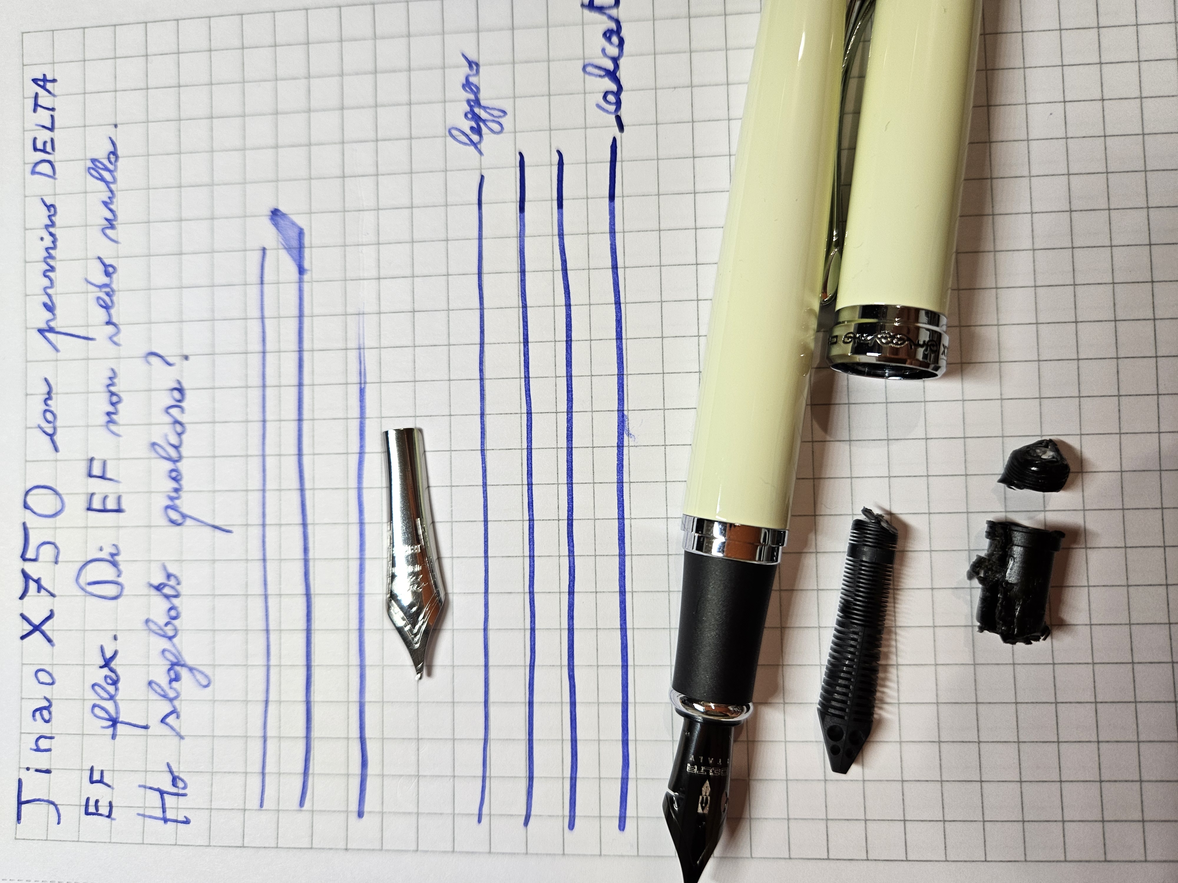 Ho recuperato una Jinhao X750 che, devo dire, è solida al tatto e scrive decentemente, poi ho acquistato un pennino Delta flex EF.