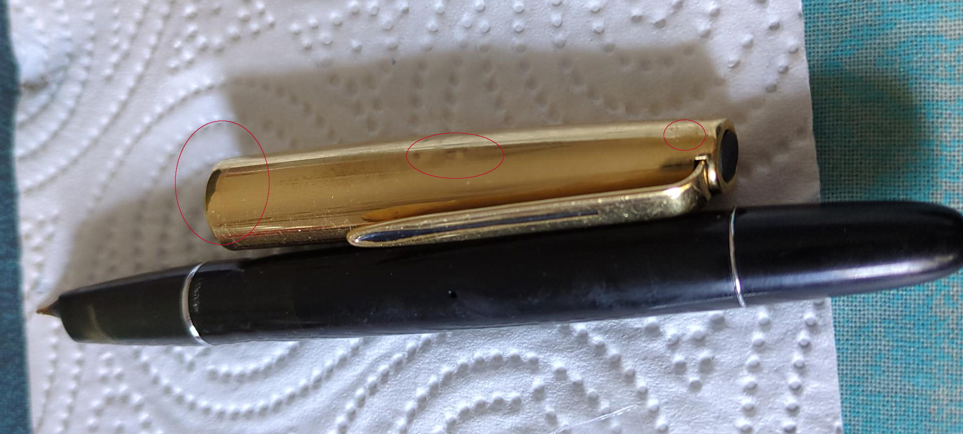 Il cappuccio ha un paio di piccoli bozzi (nulla di che) e ha perso un po' della doratura sul labbro. Diciamo che, una volta pulito e lucidato, posso accettare di tenerlo così.