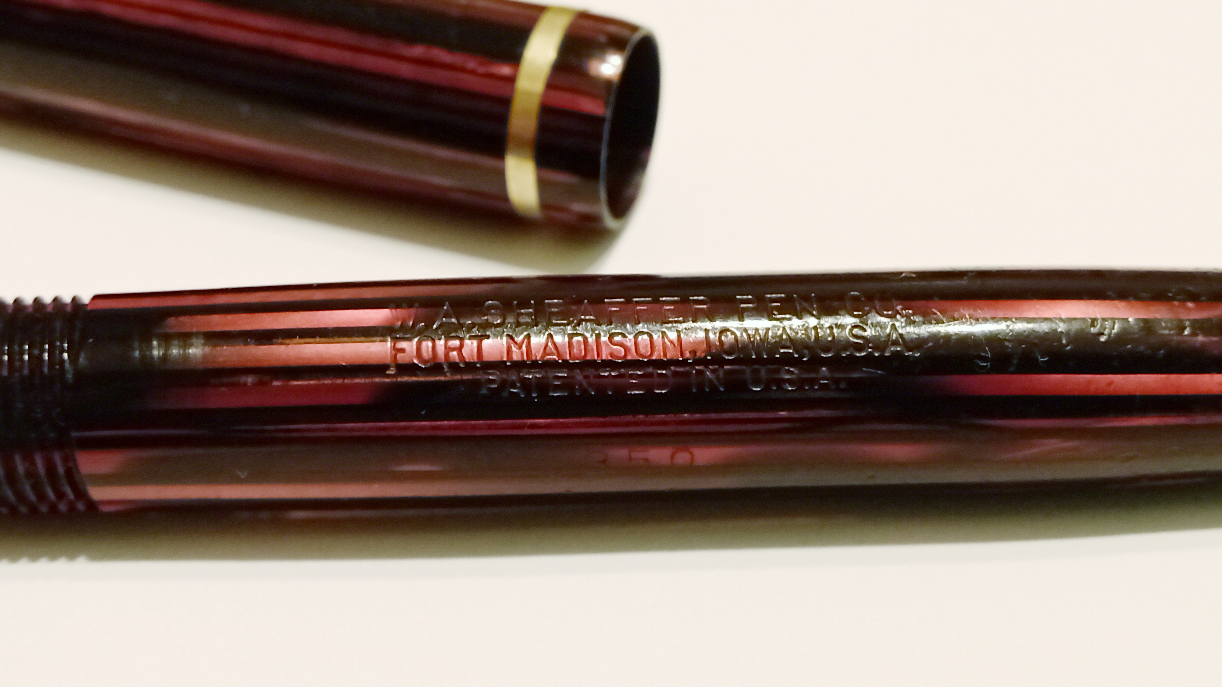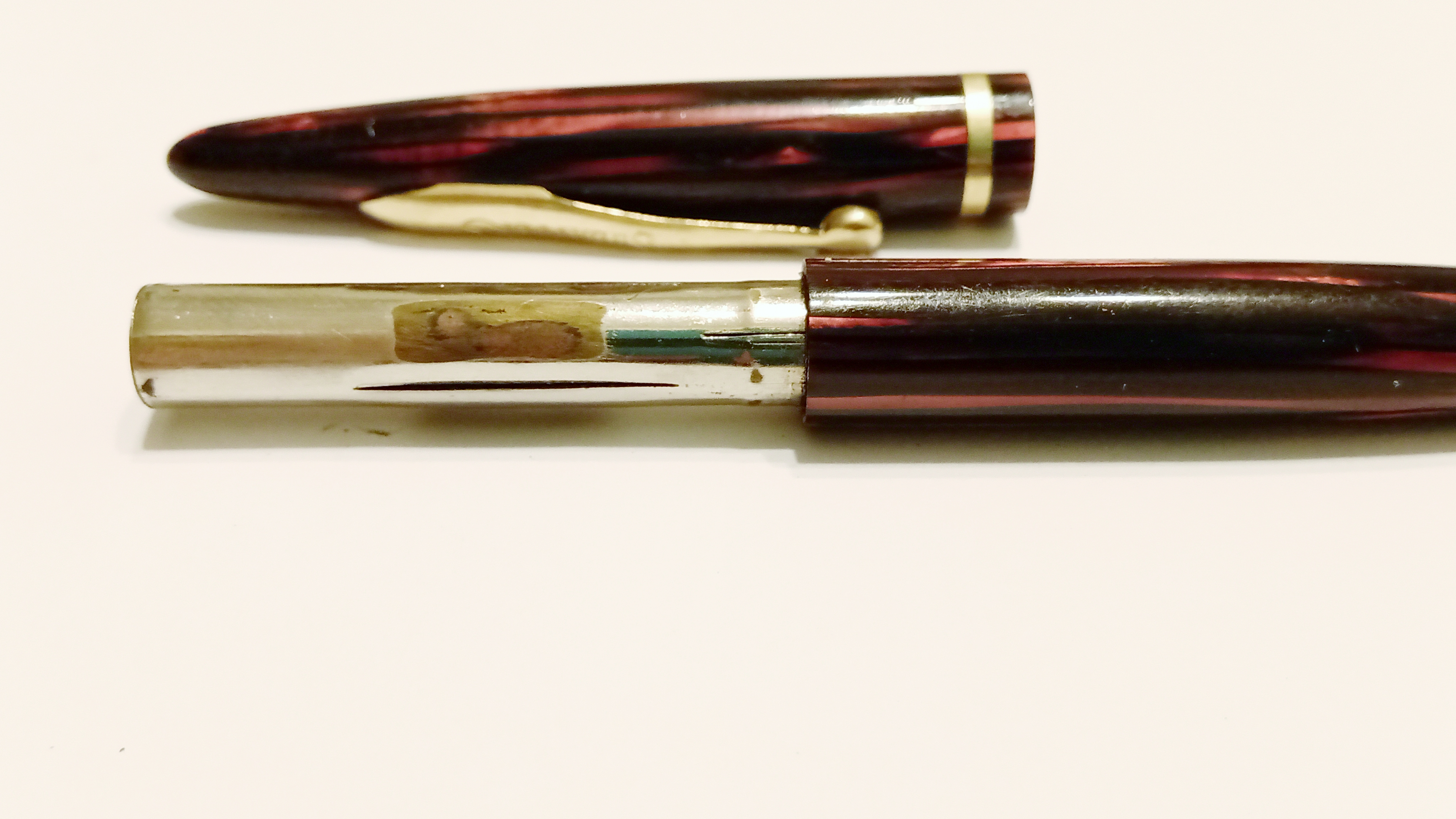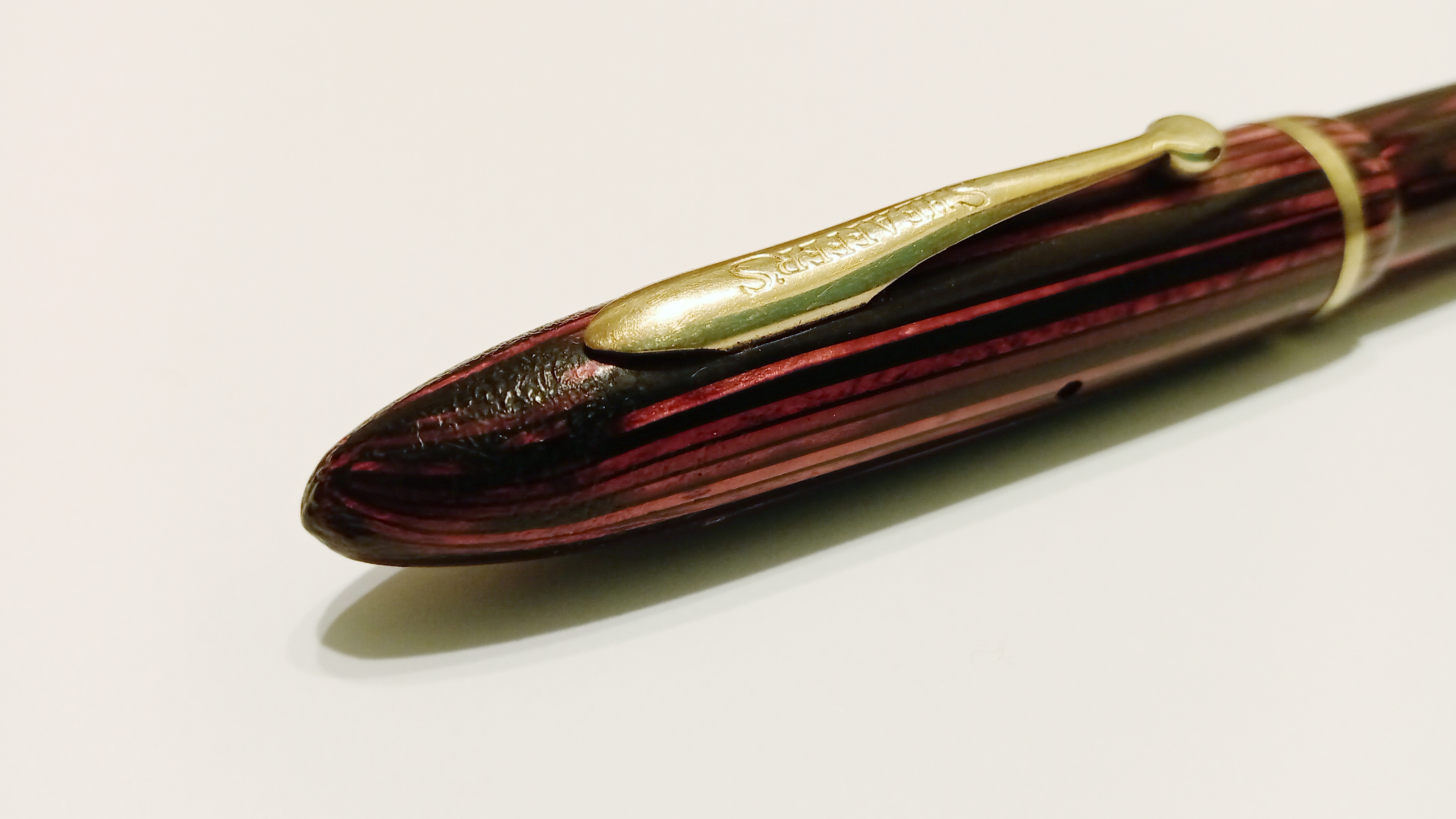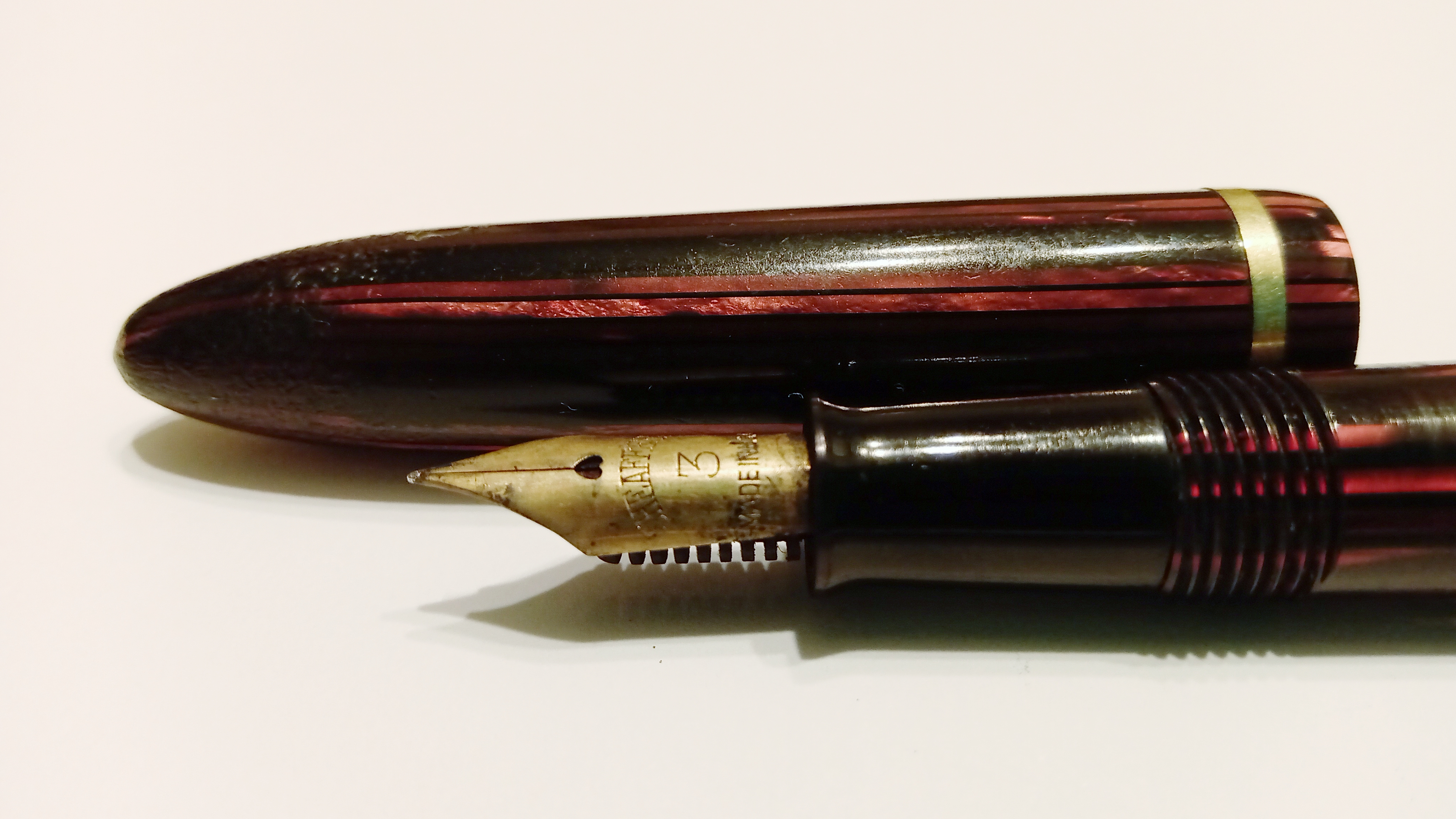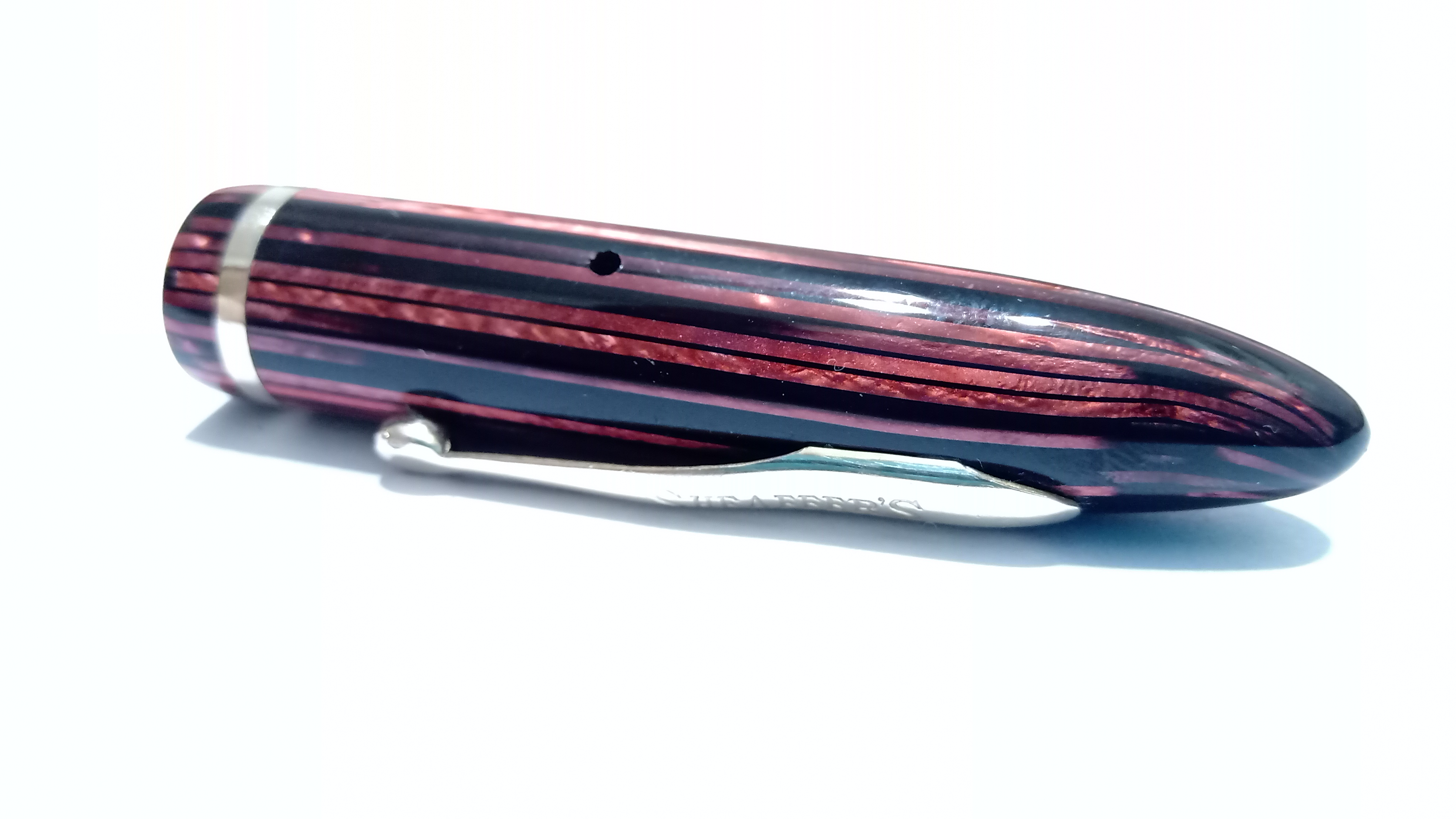 La pluma fuente es una Sheaffer's Miss Universe Streamlined Balance de 1939, una estilográfica de tamaño Lady código S3WS, fabricada en celuloide con estrías color carmesí perlado sobre fondo negro (las anteriores a este modelo tenían un color llamado Rose Glove, que eran estrías rojo perladas sobre un fondo gris), provista de un plumín original abierto rígido de oro 14K, y clip bañado en oro con la marca Sheaffer's grabada en el mismo, además de una banda angosta en el capuchón también bañada en oro. Realmente una pluma fuente simple, de carga Vacuum Fill de 1ra generación, pero de excelente calidad y performance...