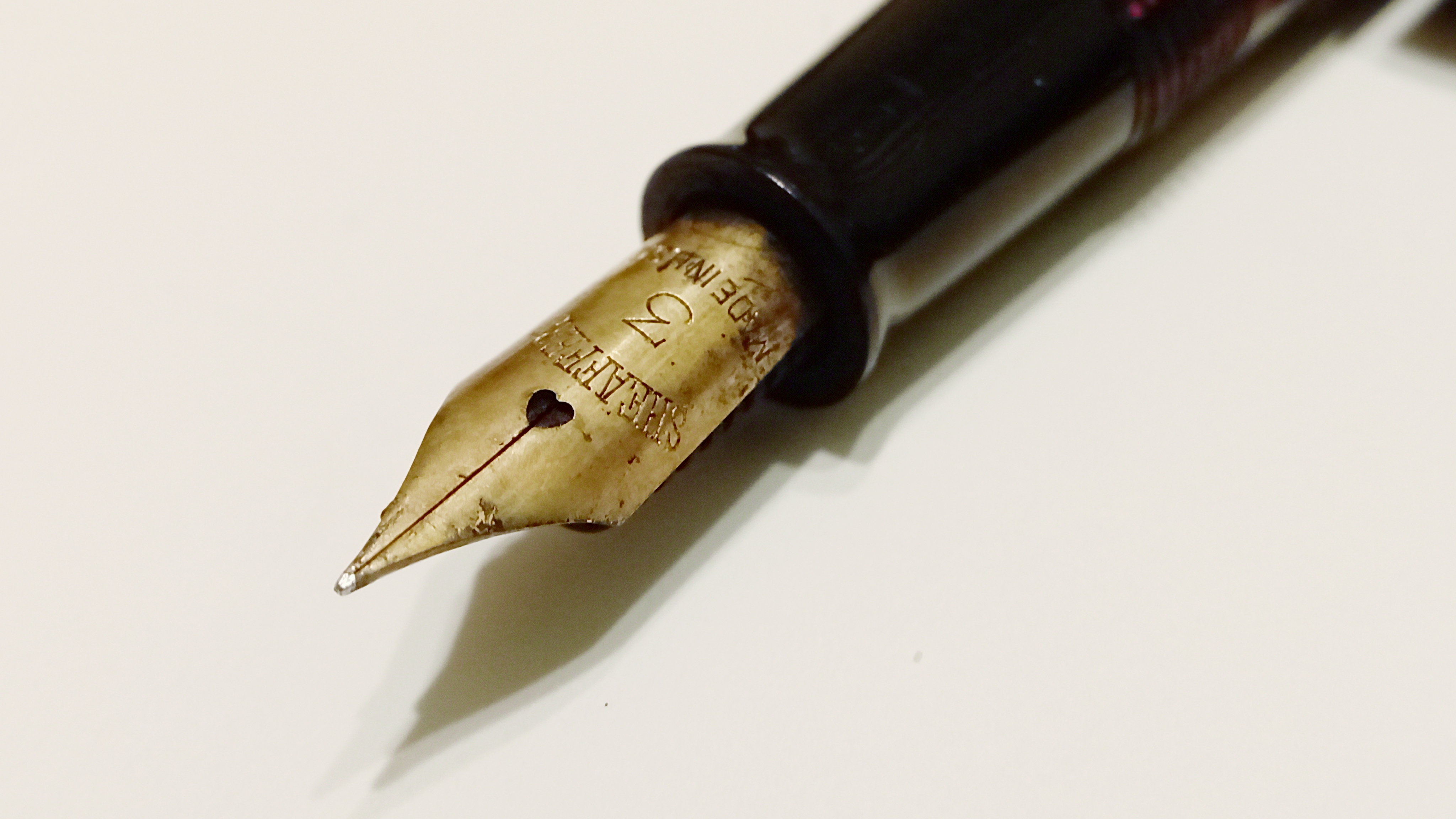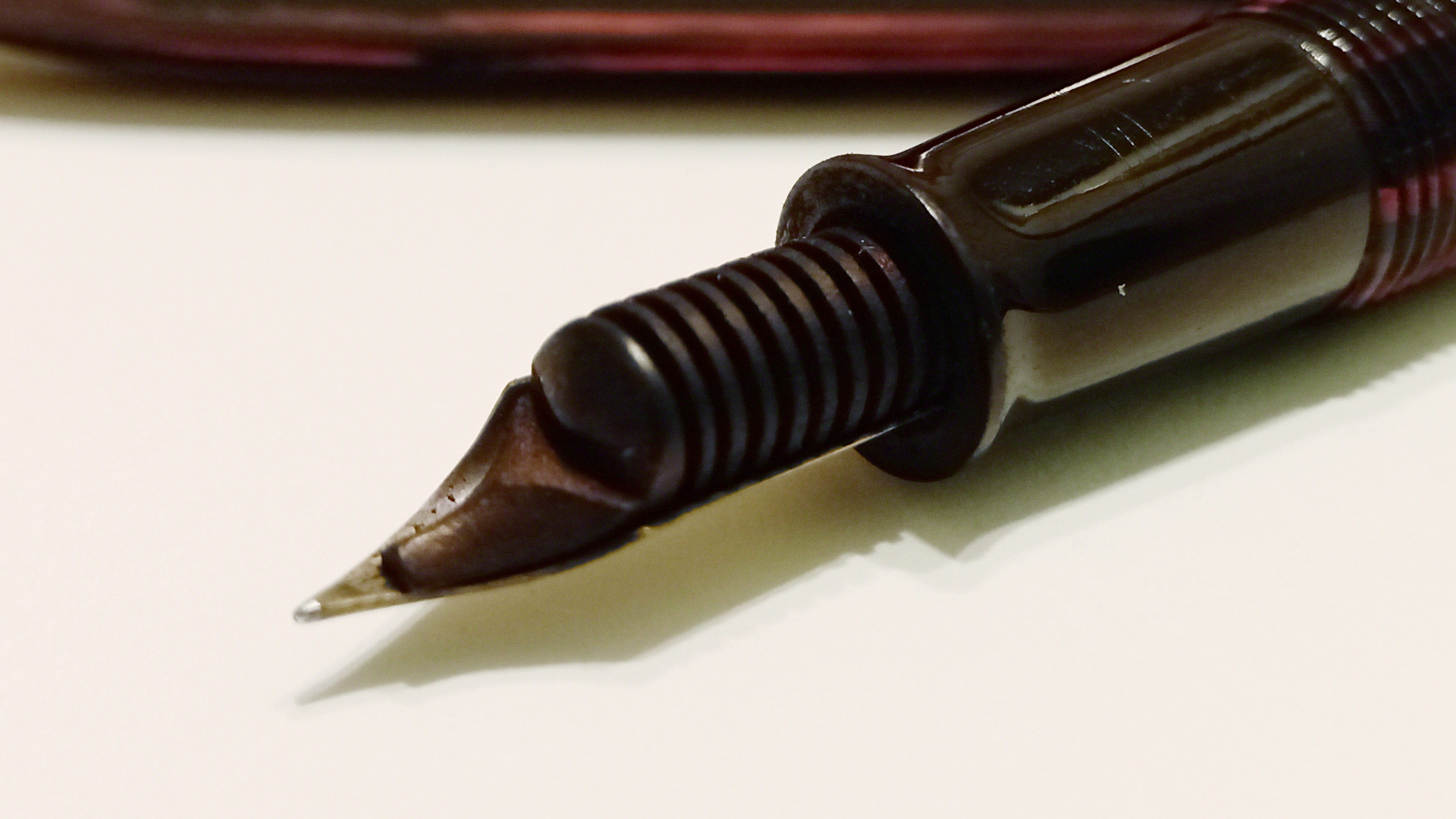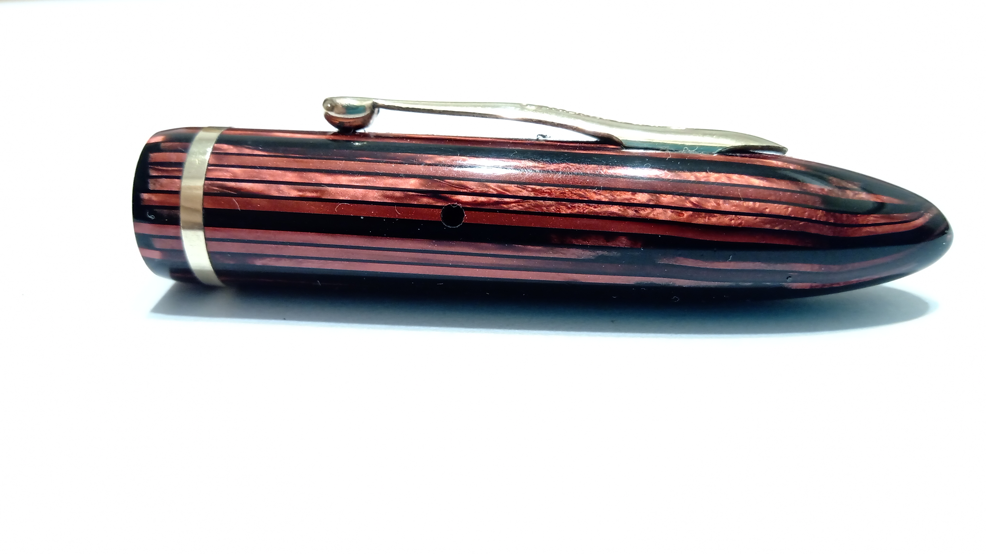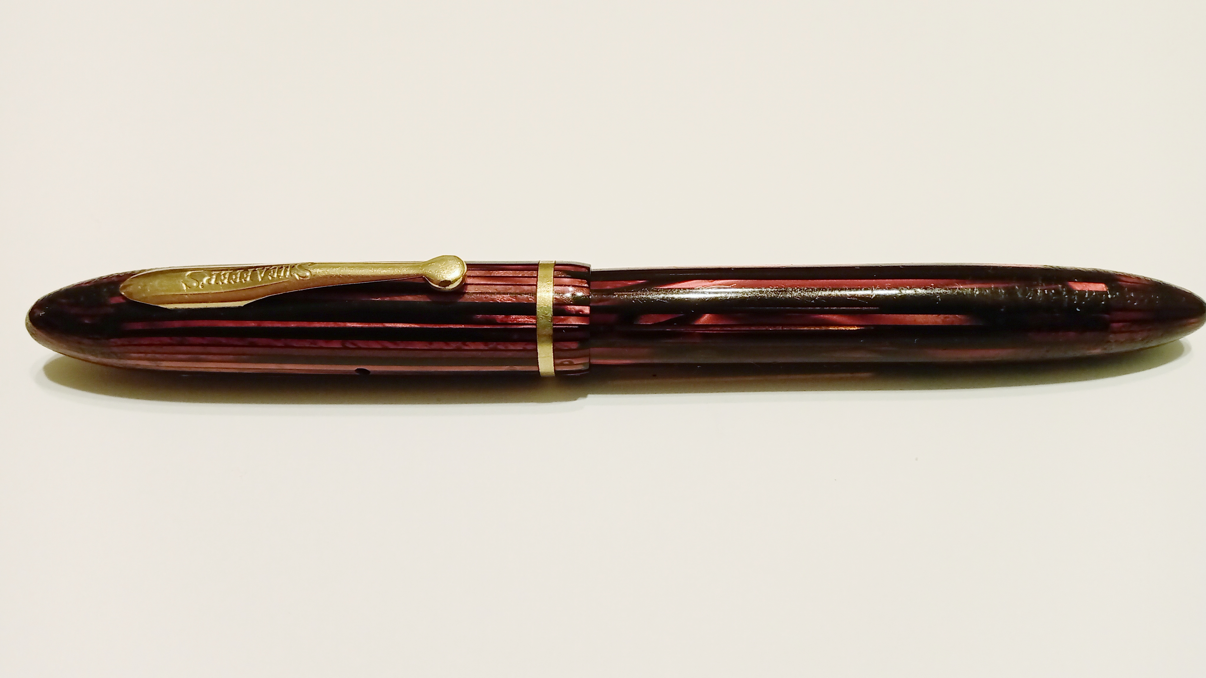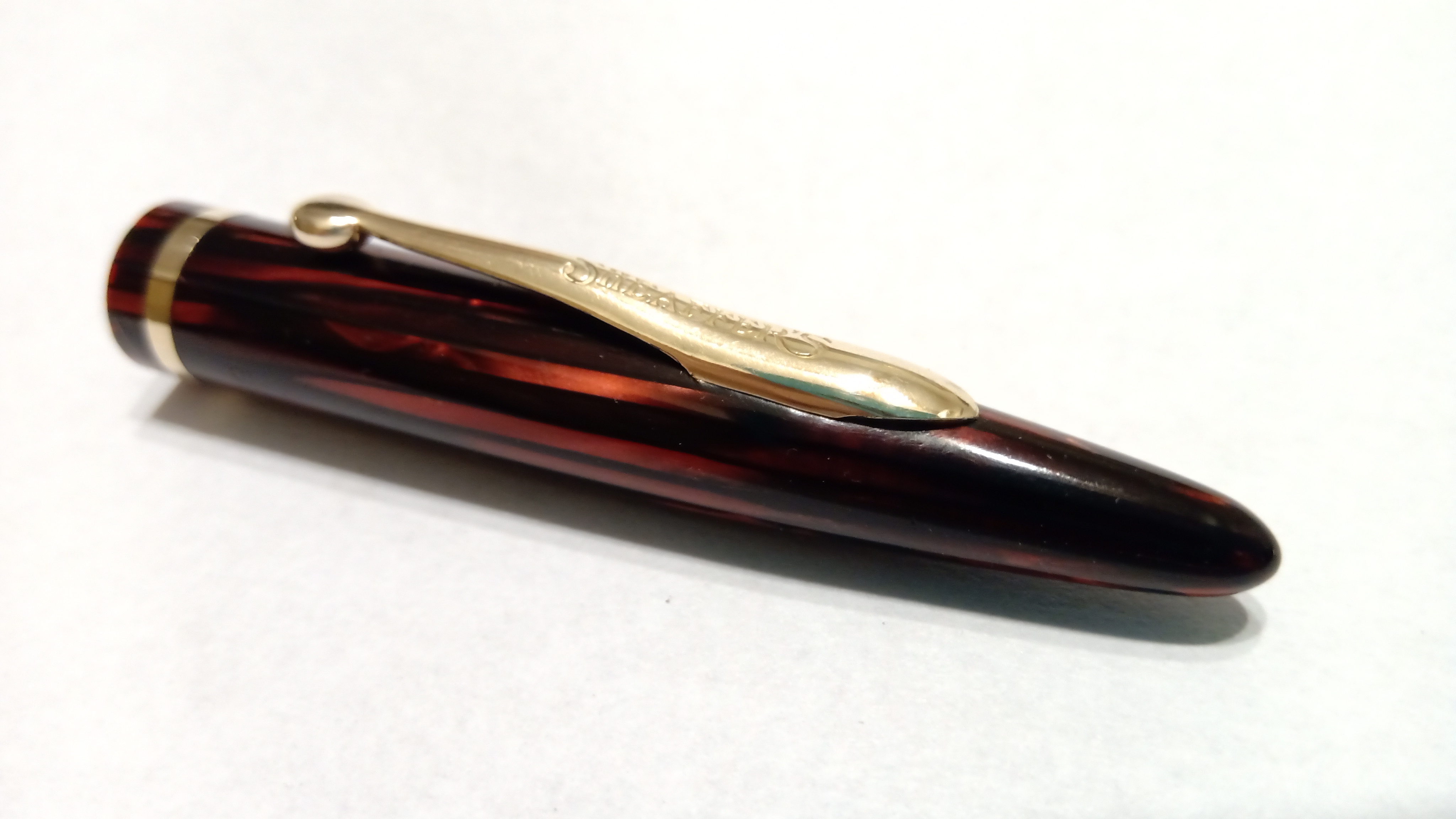 La pluma fuente es una Sheaffer's Miss Universe Streamlined Balance de 1939, una estilográfica de tamaño Lady código S3WS, fabricada en celuloide con estrías color carmesí perlado sobre fondo negro (las anteriores a este modelo tenían un color llamado Rose Glove, que eran estrías rojo perladas sobre un fondo gris), provista de un plumín original abierto rígido de oro 14K, y clip bañado en oro con la marca Sheaffer's grabada en el mismo, además de una banda angosta en el capuchón también bañada en oro. Realmente una pluma fuente simple, de carga Vacuum Fill de 1ra generación, pero de excelente calidad y performance...