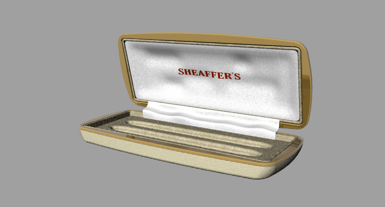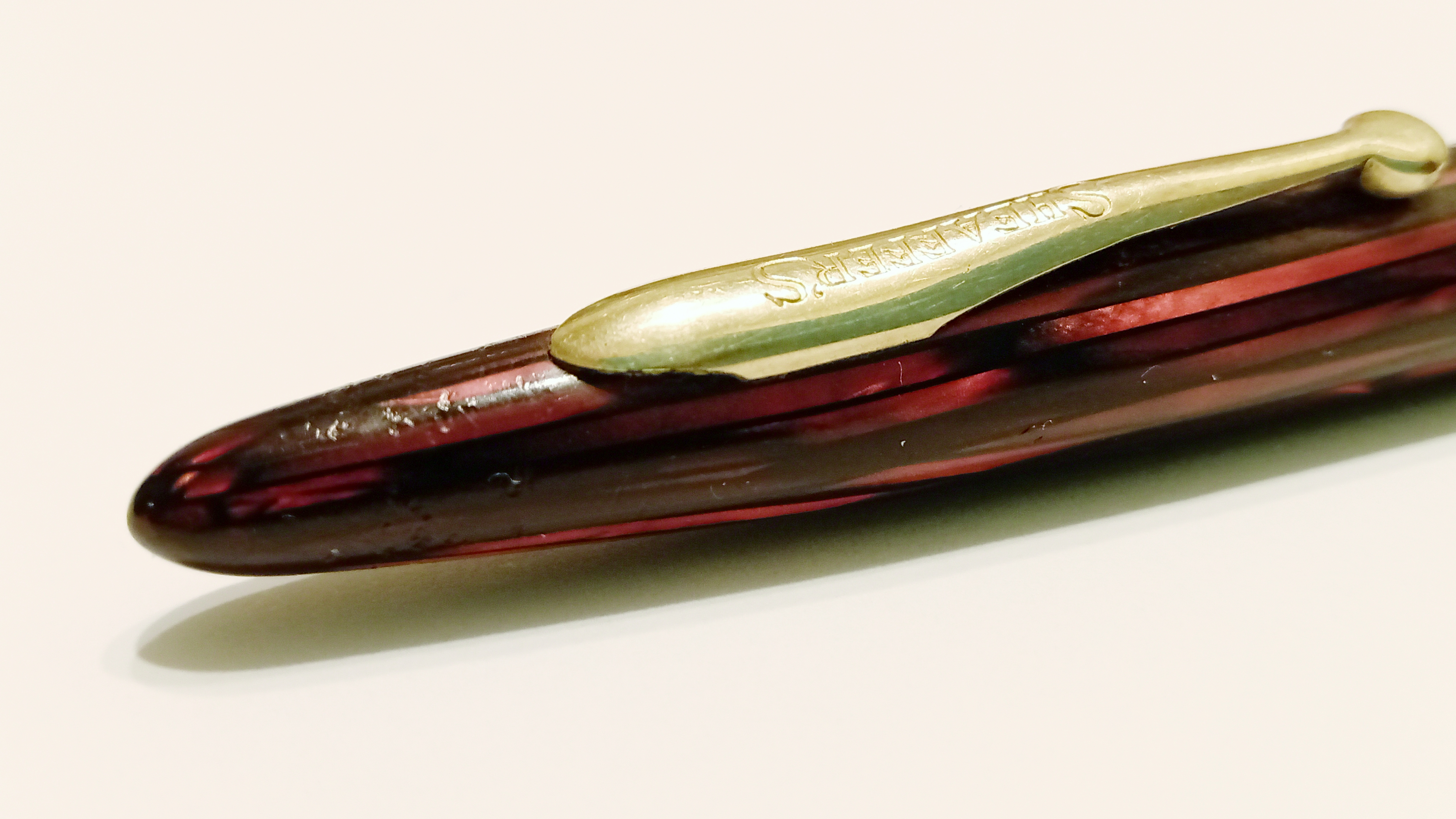 La penna stilografica è una Sheaffer's Miss Universe Streamlined Balance del 1939, una stilografica di dimensioni Lady codice S3WS, realizzata in celluloide con scanalature color cremisi perlato su fondo nero (i modelli precedenti a questo avevano un colore chiamato Rose Glove, che erano striature rosso perlato su sfondo grigio), dotata di un pennino originale aperto rigido in oro 14K e clip placcata in oro con il marchio Sheaffer's inciso su di essa, oltre a una stretta fascia sul cappuccio anch'essa placcata in oro. Si tratta di una penna stilografica semplice, con sistema di caricamento Vacuum Fill di prima generazione, ma di ottima qualità e dalle eccellenti prestazioni...