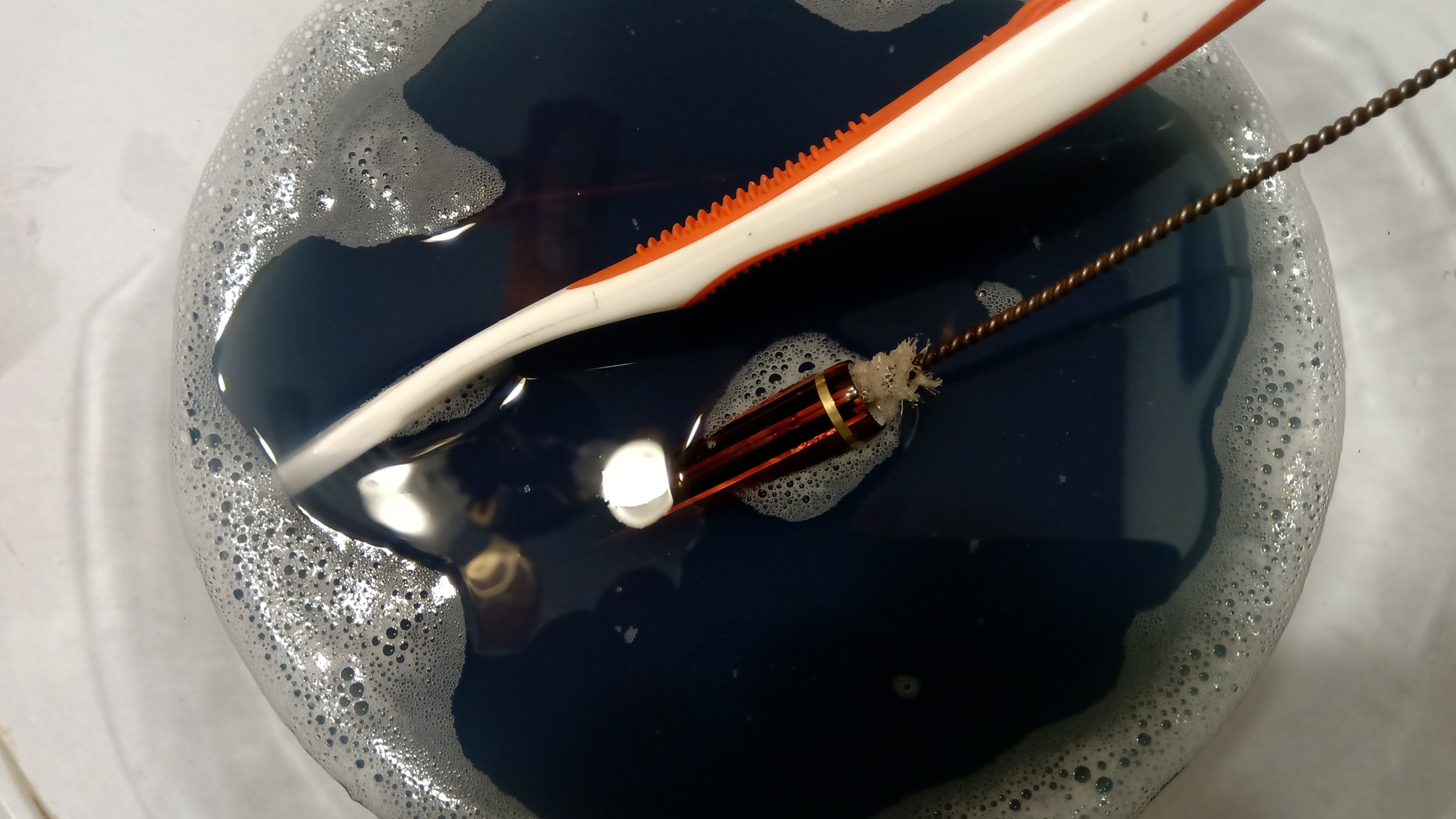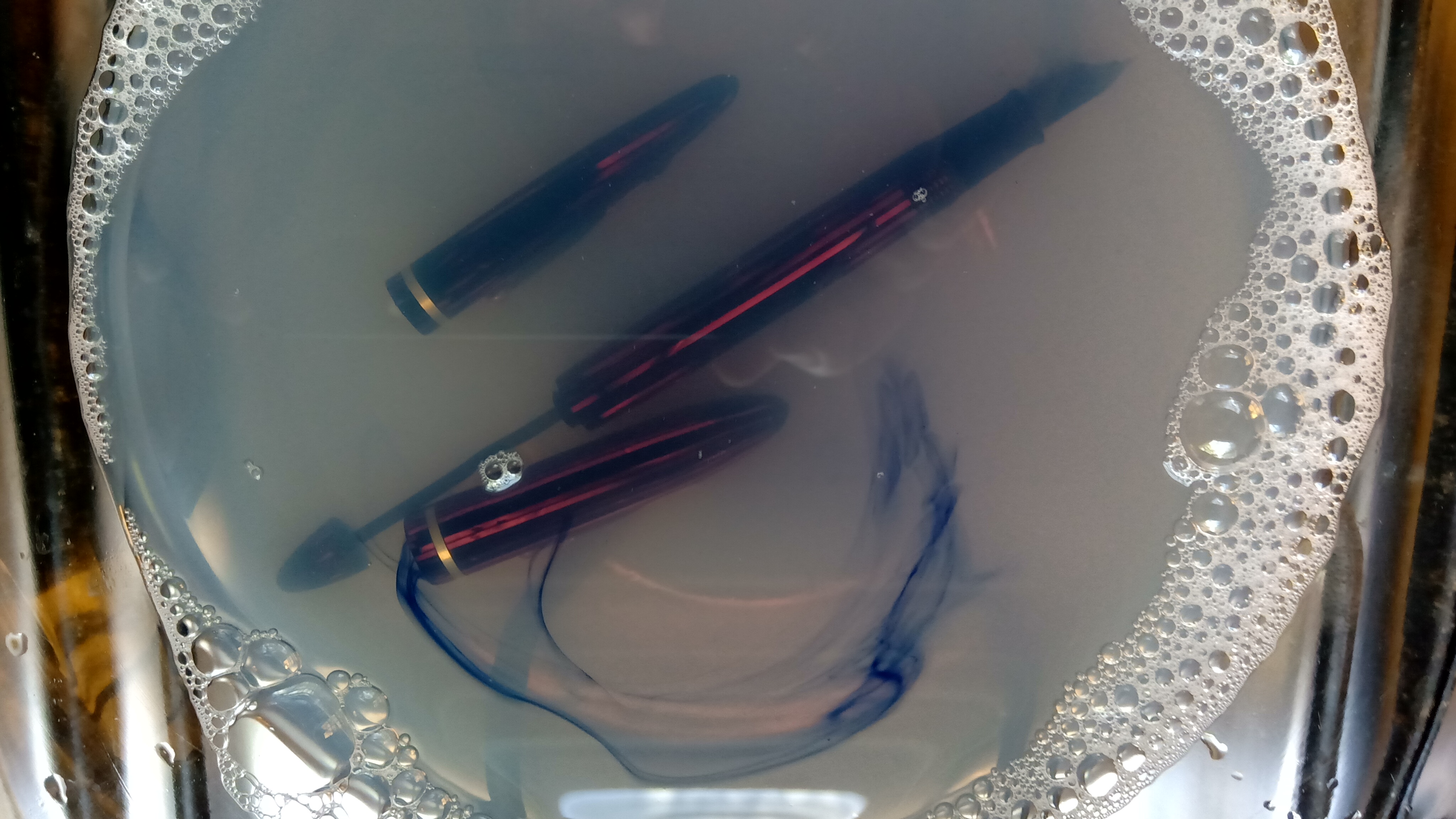 Comenzamos entonces trabajando sobre la pluma fuente, dejando la misma para ablandar todos los restos de tinta seca durante varios días, en agua con detergente neutro al 60%, renovando cada día el agua con detergente hasta comprobar que no salía mas tinta...