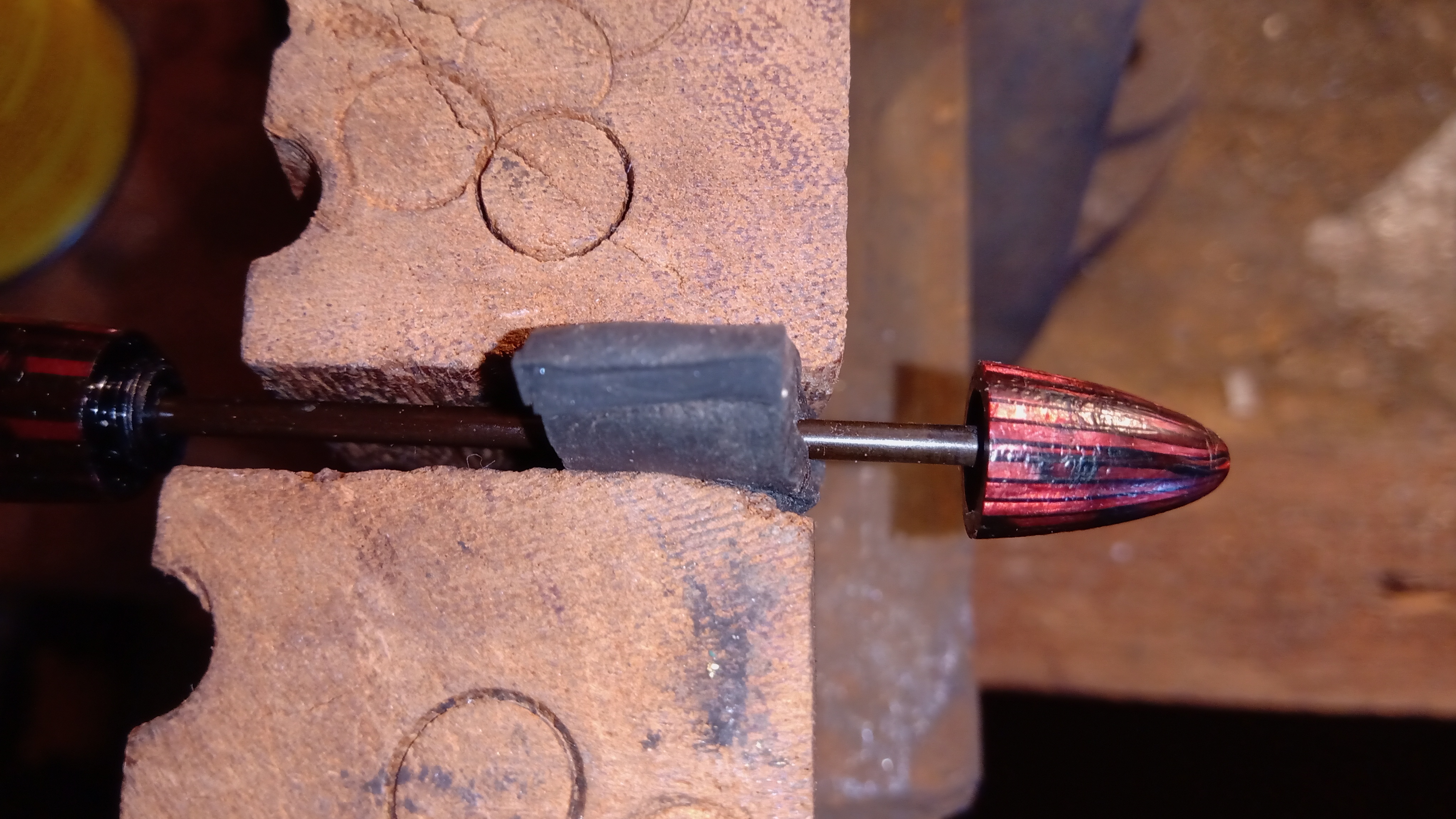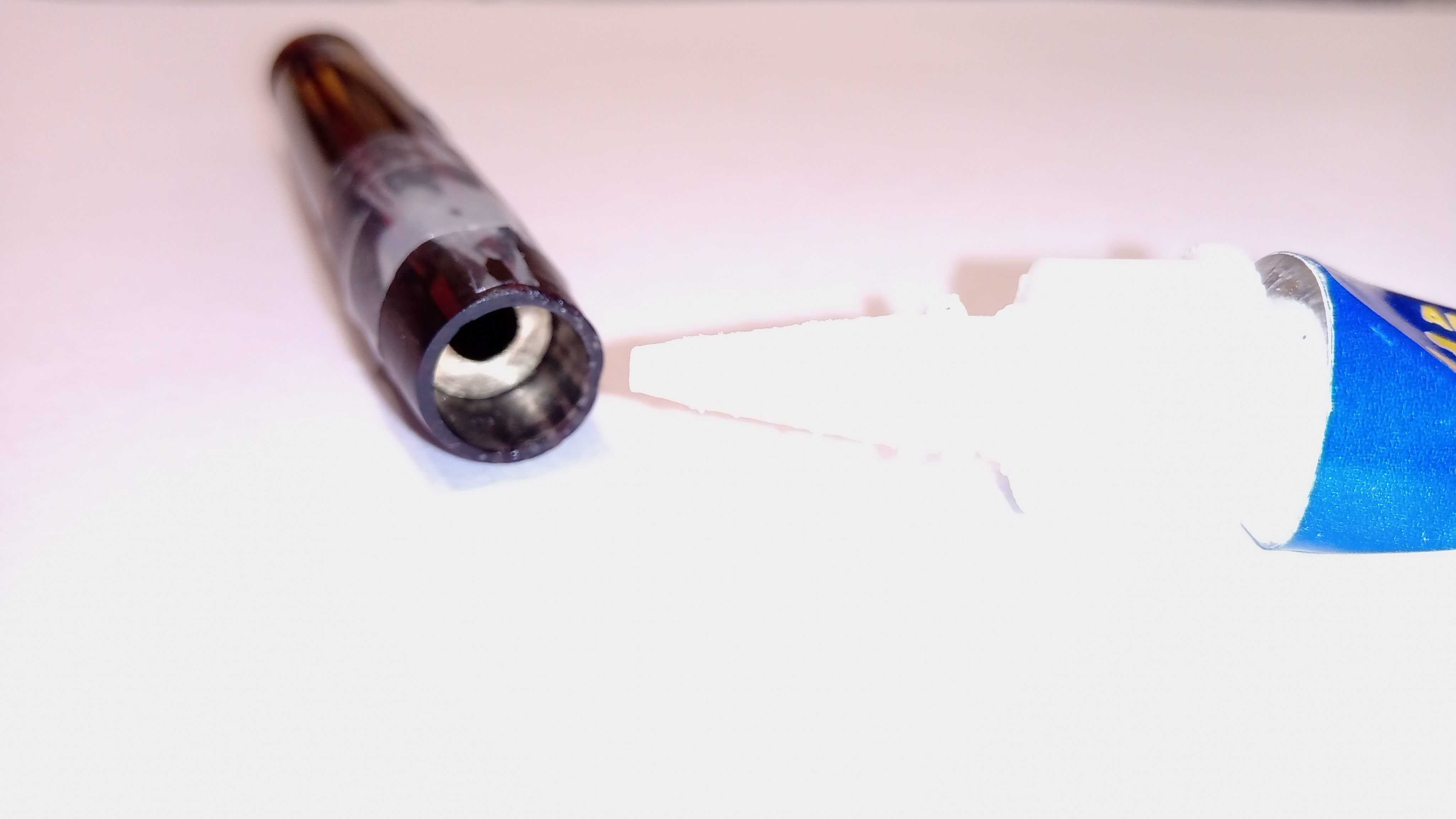 Sono quindi tornato al problema dell'impugnatura e alla sua riparazione, per cui ho smontato l'alimentatore e il pennino, posizionando l'impugnatura in una morsa curva fissandola con della gomma e spingendo l'alimentatore...