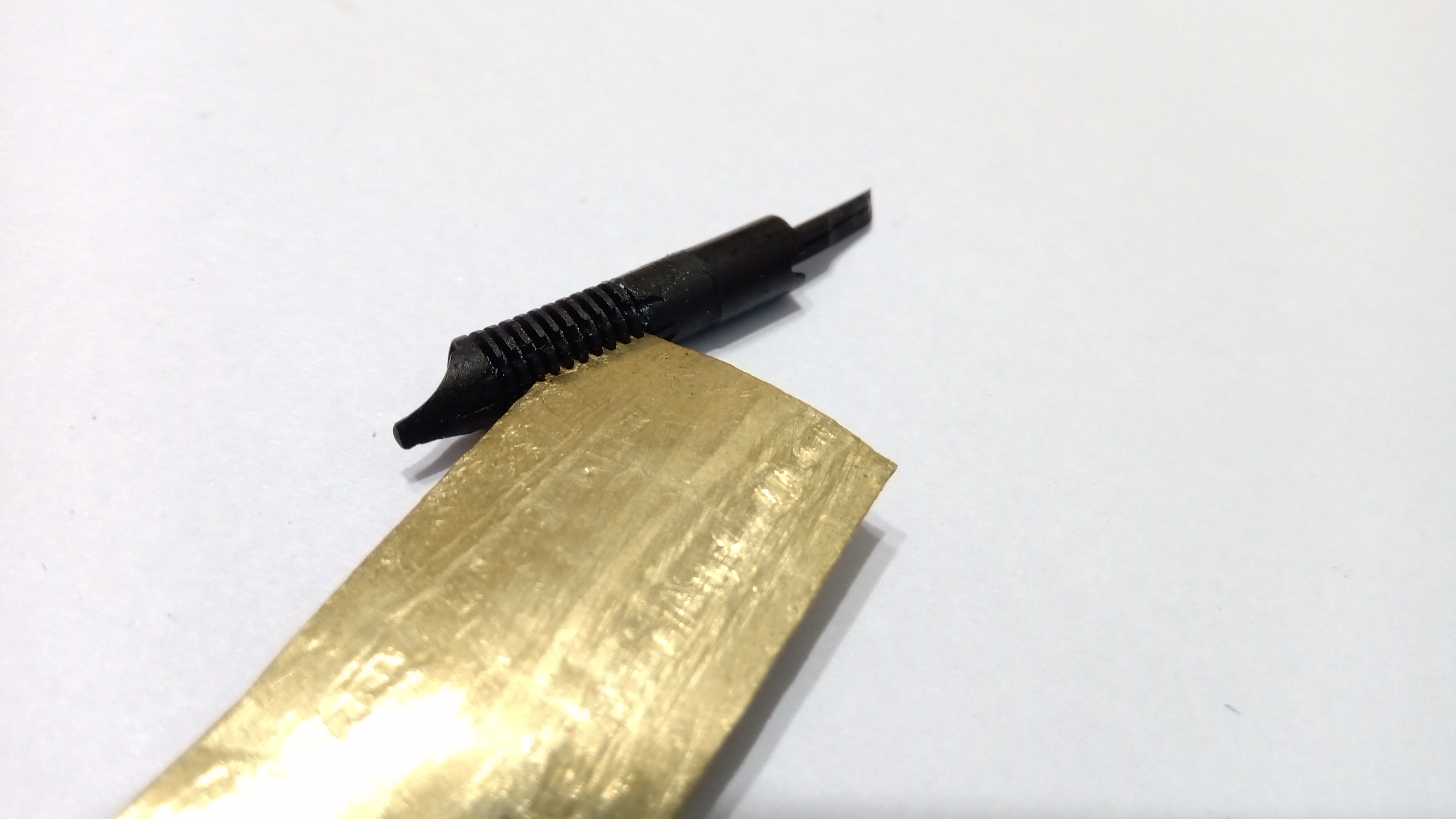 Una volta che la colla si è asciugata, ho pulito il canale dell'alimentatore con una sottile lamiera di ottone dello spessore di circa 0,25 mm...
