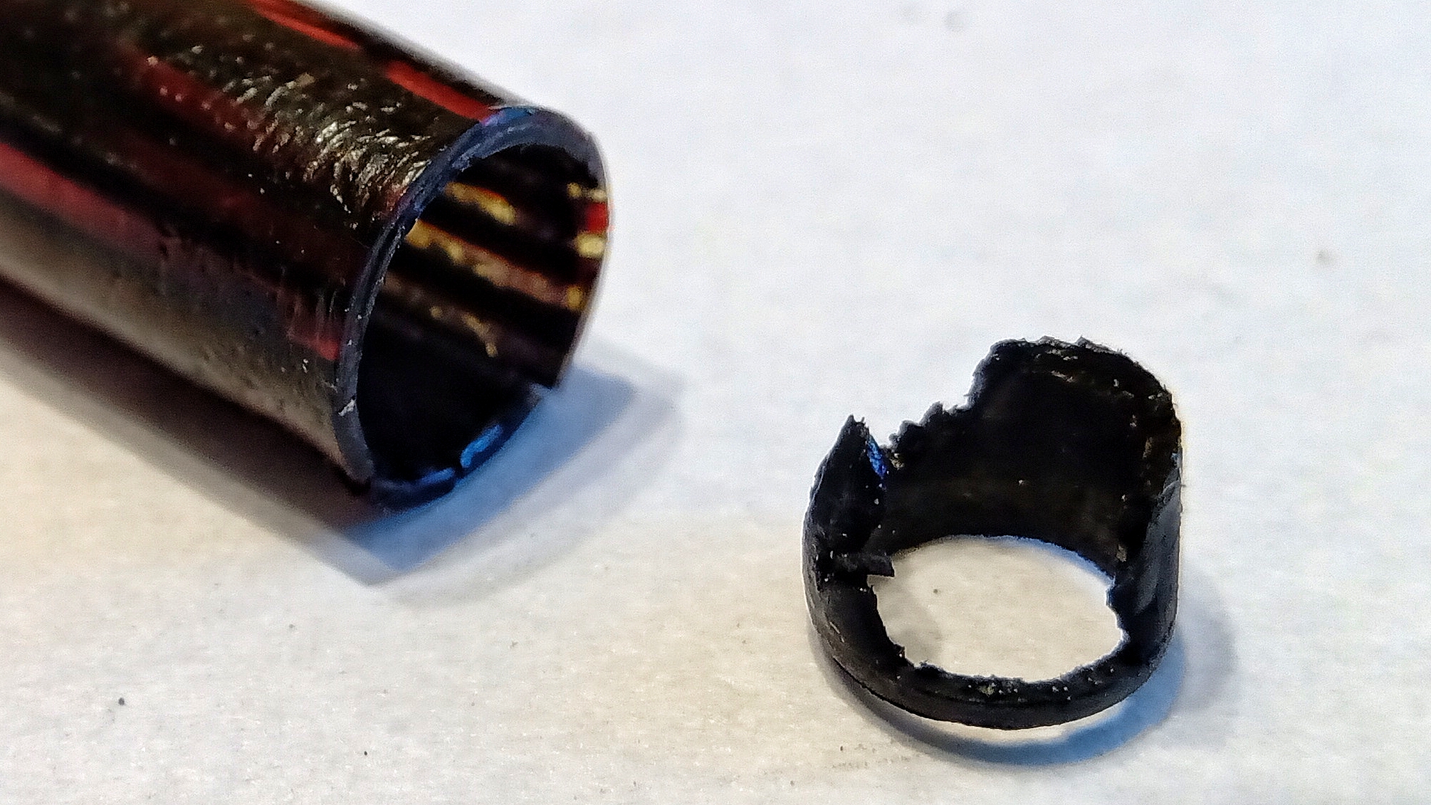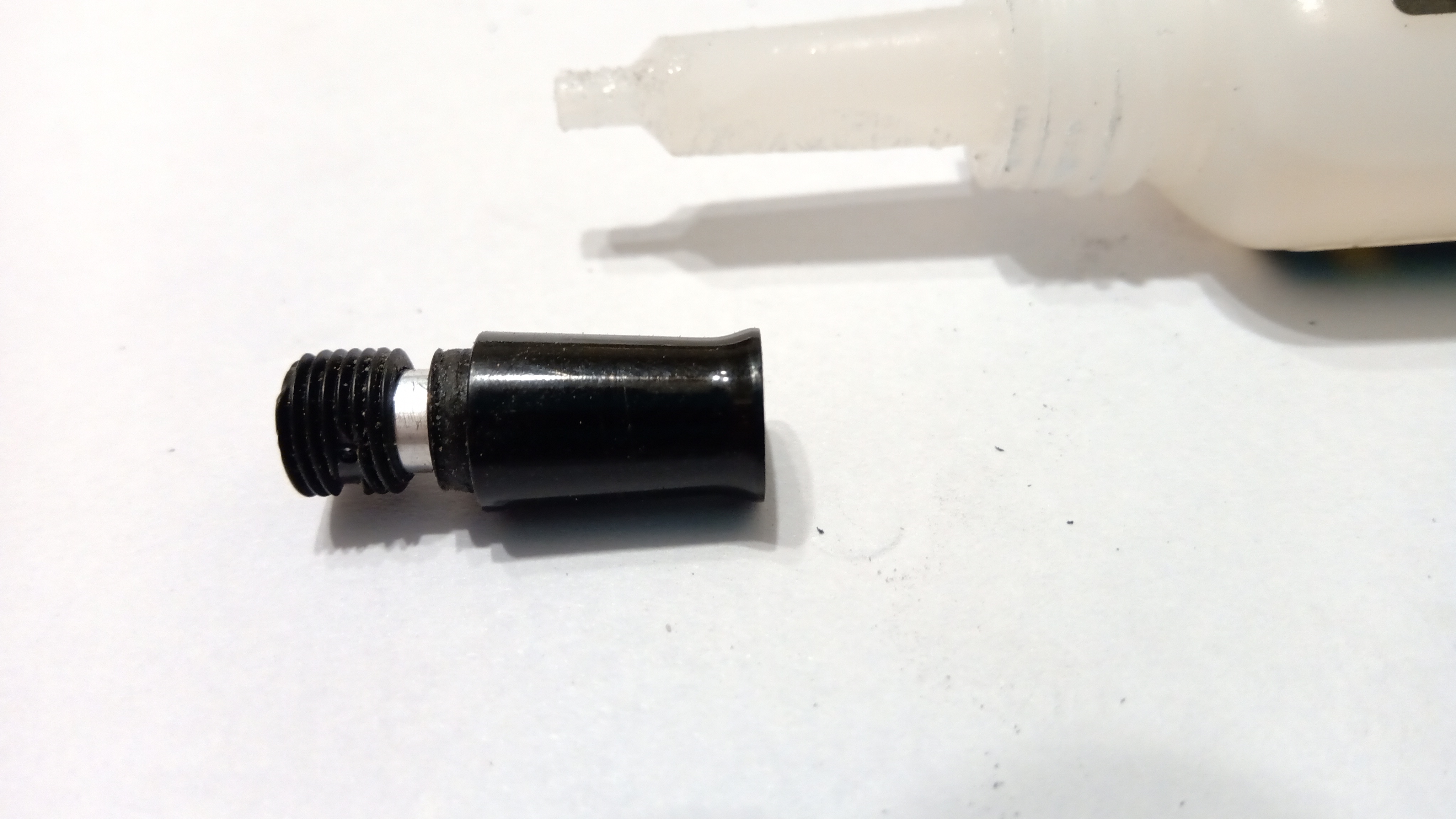 ho notato che l'alimentatore era rotto, ma il problema poteva essere facilmente risolto incollando con cianoacrilato in gel le due parti in ebanite e utilizzando il conduttore interno, anch'esso in ebanite, come elemento di guida, facendo attenzione a non ostruire il canale dello stesso...