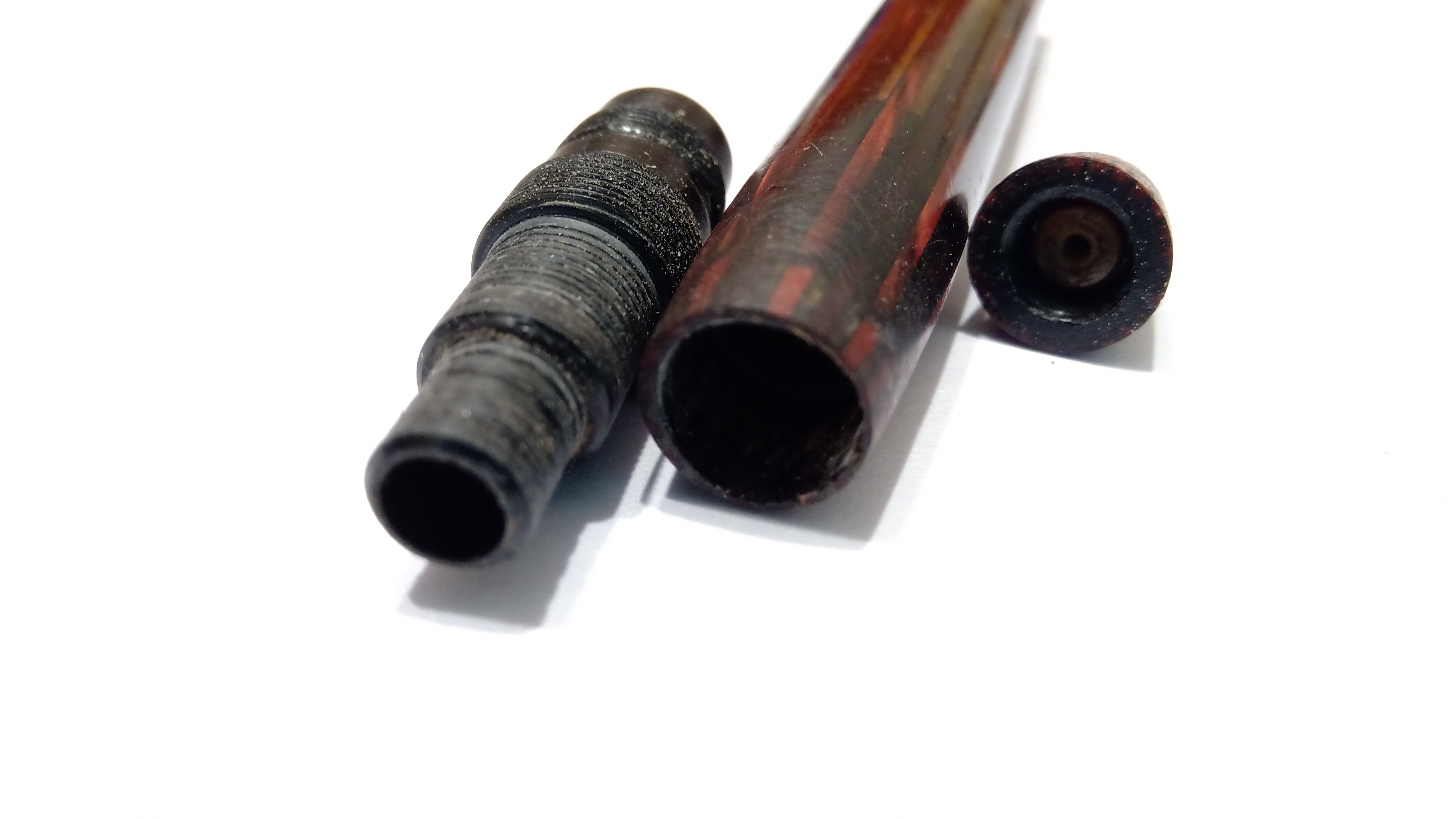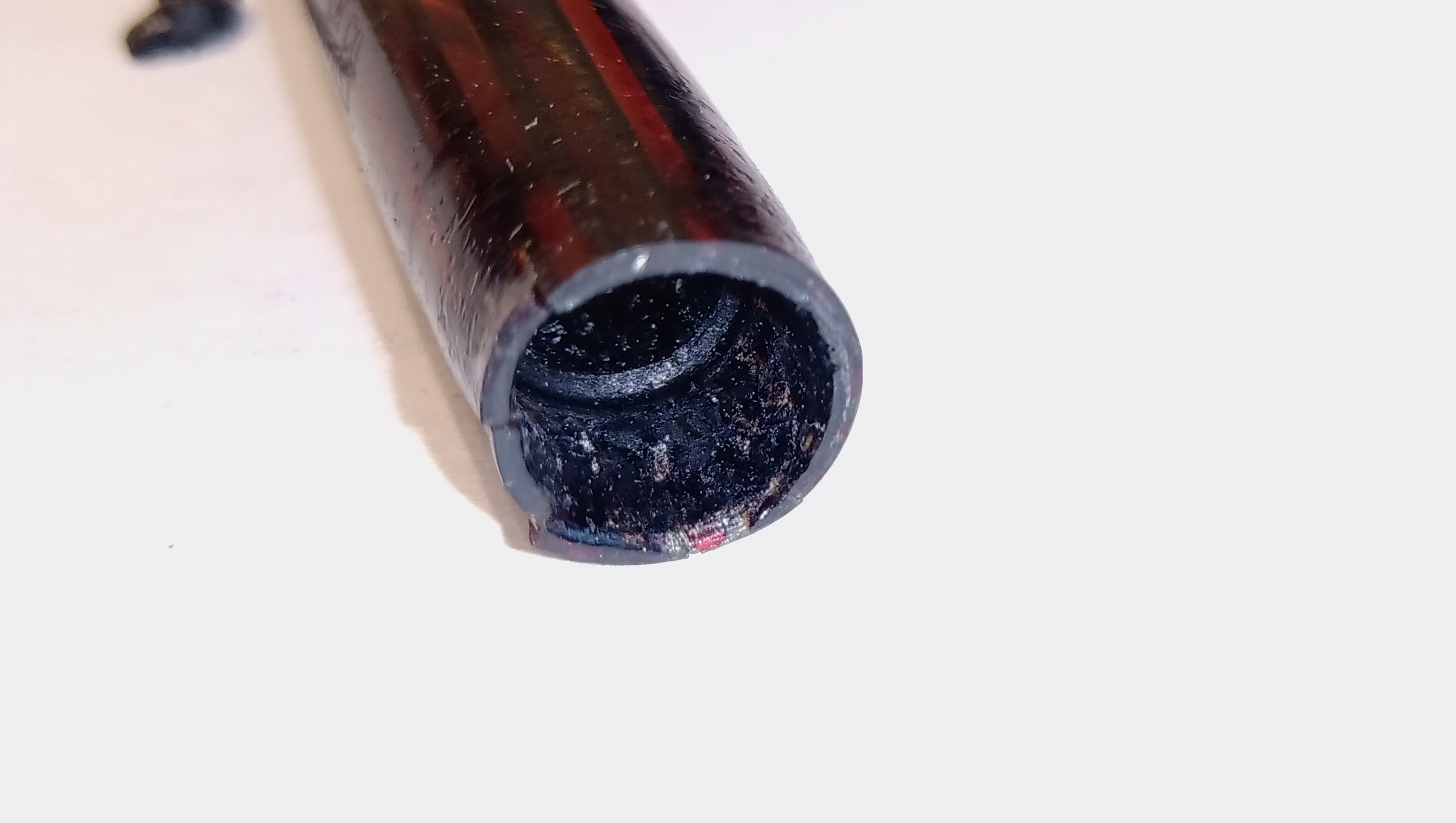 percibí que el alimentador estaba partido, pero podía ser fácilmente resuelto pegando con cianoacrilato en gel las dos partes de ebonita, y utilizando el encauzador interno también de ebonita como elemento de guía con cuidado de no ocluir el canal del mismo...