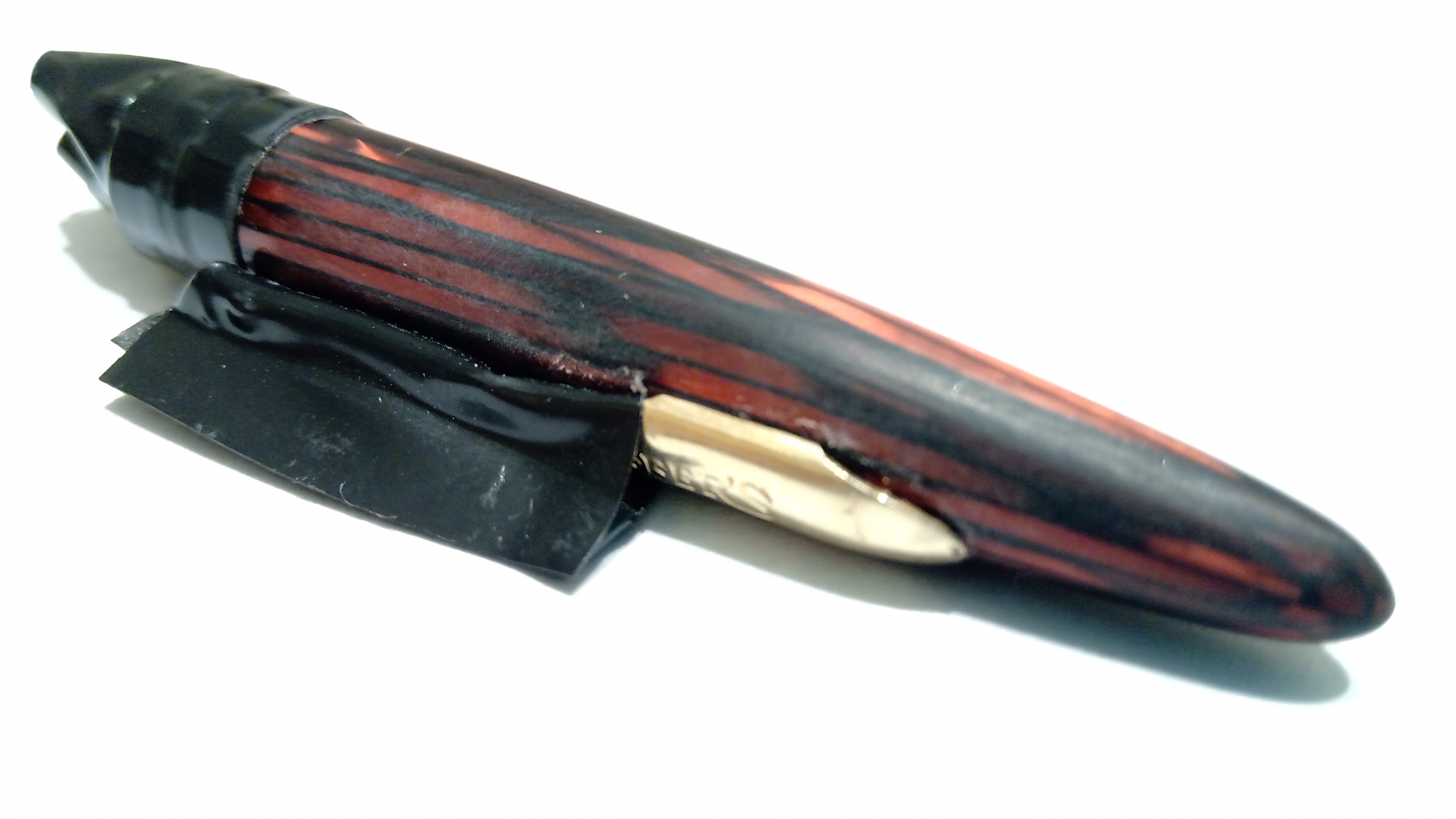 Para finalizar con la pluma fuente, nos ocupamos ahora del capuchón, enmascarando con cinta aisladora todos los dorados...