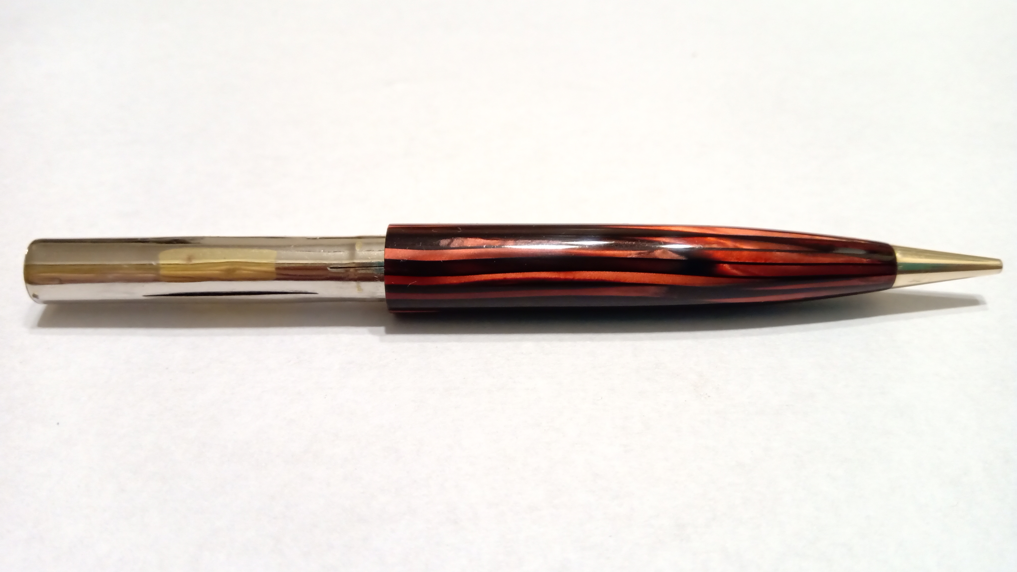 En el caso del lápiz mecánico, sufría también de las mismas agresiones en el celuloide, si bien sus dorados tanto en el clip como en la banda del capuchón estaban perfectos...